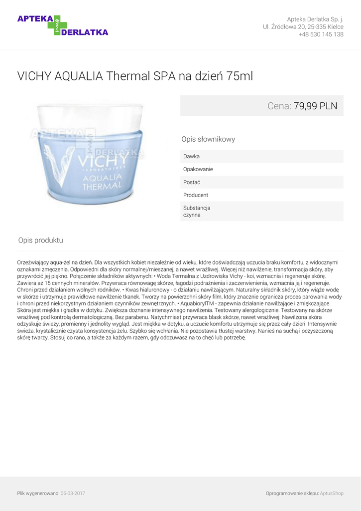 Apteka Derlatka Sp. j. Ul. Źródłowa 20, 25-335 Kielce +48 530 145 138 VICHY AQUALIA Thermal SPA na dzień 75ml Cena: 79,99 PLN Opis słownikowy Dawka Opakowanie Postać Producent Substancja czynna Opis produktu Orzeźwiający aqua-żel na dzień. Dla wszystkich kobiet niezależnie od wieku, które doświadczają uczucia braku komfortu, z widocznymi oznakami zmęczenia. Odpowiedni dla skóry normalnej/mieszanej, a nawet wrażliwej. Więcej niż nawilżenie, transformacja skóry, aby przywrócić jej piękno. Połączenie składników aktywnych: • Woda Termalna z Uzdrowiska Vichy - koi, wzmacnia i regeneruje skórę. Zawiera aż 15 cennych minerałów. Przywraca równowagę skórze, łagodzi podrażnienia i zaczerwienienia, wzmacnia ją i regeneruje. Chroni przed działaniem wolnych rodników. • Kwas hialuronowy - o działaniu nawilżającym. Naturalny składnik skóry, który wiąże wodę w skórze i utrzymuje prawidłowe nawilżenie tkanek. Tworzy na powierzchni skóry film, który znacznie ogranicza proces parowania wody i chroni przed niekorzystnym działaniem czynników zewnętrznych. • AquabiorylTM - zapewnia działanie nawilżające i zmiękczające. Skóra jest miękka i gładka w dotyku. Zwiększa doznanie intensywnego nawilżenia. Testowany alergologicznie. Testowany na skórze wrażliwej pod kontrolą dermatologiczną. Bez parabenu. Natychmiast przywraca blask skórze, nawet wrażliwej. Nawilżona skóra odzyskuje świeży, promienny i jednolity wygląd. Jest miękka w dotyku, a uczucie komfortu utrzymuje się przez cały dzień. Intensywnie świeża, krystalicznie czysta konsystencja żelu. Szybko się wchłania. Nie pozostawia tłustej warstwy. Nanieś na suchą i oczyszczoną skórę twarzy. Stosuj co rano, a także za każdym razem, gdy odczuwasz na to chęć lub potrzebę. Plik wygenerowano: 06-03-2017 Powered by TCPDF (www.tcpdf.org) Oprogramowanie sklepu: AptusShop