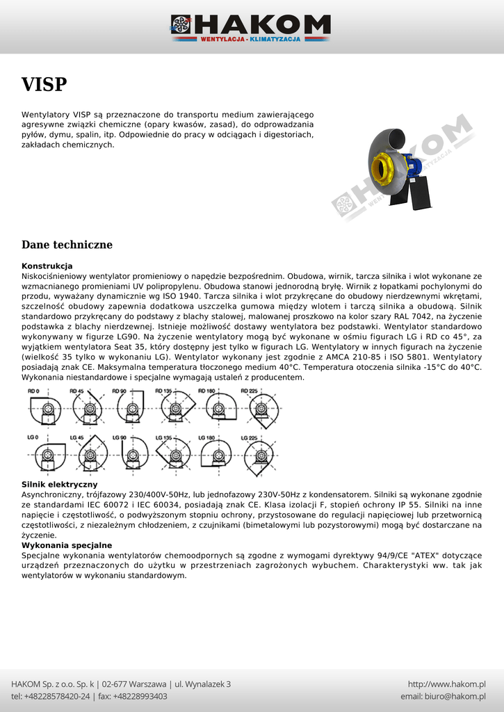 VISP Wentylatory VISP są przeznaczone do transportu medium zawierającego agresywne związki chemiczne (opary kwasów, zasad), do odprowadzania pyłów, dymu, spalin, itp. Odpowiednie do pracy w odciągach i digestoriach, zakładach chemicznych. Dane techniczne Konstrukcja Niskociśnieniowy wentylator promieniowy o napędzie bezpośrednim. Obudowa, wirnik, tarcza silnika i wlot wykonane ze wzmacnianego promieniami UV polipropylenu. Obudowa stanowi jednorodną bryłę. Wirnik z łopatkami pochylonymi do przodu, wyważany dynamicznie wg ISO 1940. Tarcza silnika i wlot przykręcane do obudowy nierdzewnymi wkrętami, szczelność obudowy zapewnia dodatkowa uszczelka gumowa między wlotem i tarczą silnika a obudową. Silnik standardowo przykręcany do podstawy z blachy stalowej, malowanej proszkowo na kolor szary RAL 7042, na życzenie podstawka z blachy nierdzewnej. Istnieje możliwość dostawy wentylatora bez podstawki. Wentylator standardowo wykonywany w figurze LG90. Na życzenie wentylatory mogą być wykonane w ośmiu figurach LG i RD co 45°, za wyjątkiem wentylatora Seat 35, który dostępny jest tylko w figurach LG. Wentylatory w innych figurach na życzenie (wielkość 35 tylko w wykonaniu LG). Wentylator wykonany jest zgodnie z AMCA 210-85 i ISO 5801. Wentylatory posiadają znak CE. Maksymalna temperatura tłoczonego medium 40°C. Temperatura otoczenia silnika -15°C do 40°C. Wykonania niestandardowe i specjalne wymagają ustaleń z producentem. Silnik elektryczny Asynchroniczny, trójfazowy 230/400V-50Hz, lub jednofazowy 230V-50Hz z kondensatorem. Silniki są wykonane zgodnie ze standardami IEC 60072 i IEC 60034, posiadają znak CE. Klasa izolacji F, stopień ochrony IP 55. Silniki na inne napięcie i częstotliwość, o podwyższonym stopniu ochrony, przystosowane do regulacji napięciowej lub przetwornicą częstotliwości, z niezależnym chłodzeniem, z czujnikami (bimetalowymi lub pozystorowymi) mogą być dostarczane na życzenie. Wykonania specjalne Specjalne wykonania wentylatorów chemoodpornych są zgodne z wymogami dyrektywy 94/9/CE "ATEX" dotyczące urządzeń przeznaczonych do użytku w przestrzeniach zagrożonych wybuchem. Charakterystyki ww. tak jak wentylatorów w wykonaniu standardowym. Dane techniczne nmax [obr./min] Moc nominalna [kW] U [V] I [A] Qmax [m3/h] Max. Ciśnienie statyczne [Pa] Masa [kg] VISP/6-15-018T 880 0,18 400 0,60 280 46 12,0 VISP/4-15-025T 1350 0,25 400 0,71 440 110 12,0 VISP/4-15-025S 1350 0,25 230 2,30 440 110 12,5 VISP/2-15-037T 2730 0,37 400 0,90 860 430 12,3 VISP/2-15-037S 2800 0,37 230 3,00 860 430 12,7 VISP/6-20-018T 880 0,18 400 0,60 860 115 13,0 VISP/4-20-025T 1350 0,25 400 0,71 1320 240 13,2 VISP/4-20-025S 1350 0,25 230 2,30 1320 240 13,7 VISP/2-20-075T 2770 0,75 400 1,70 1400 1040 20,5 VISP/2-20-075S 2820 0,75 230 5,20 1400 1040 20,5 VISP/2-20-110T 2770 1,10 400 2,45 1950 1040 21,7 VISP/2-20-110S 1820 1,10 230 7,90 1950 1040 20,5 VISP/6-25-018T 880 0,18 400 0,60 1550 150 16,0 VISP/4-25-037T 1380 0,37 400 0,98 2410 370 16,5 VISP/4-25-037S 1360 0,37 230 3,10 2410 370 17,0 VISP/2-25-220T 2845 2,20 400 4,60 2000 1450 27,5 VISP/2-25-300T 2835 3,00 400 6,50 3450 1450 29,0 VISP/6-30-055T 900 0,55 400 1,65 3050 220 27,0 VISP/4-30-150T 1420 1,50 400 3,40 4820 560 31,5 VISP/4-30-150S 1400 1,50 230 9,30 4820 560 31,5 VISP/8-35-150T 710 1,50 400 4,20 5500 280 59,0 VISP/6-35-220T 955 2,20 400 5,40 7000 450 59,0 VISP/4-35-550T 1450 5,50 400 10,90 8400 1090 74,0 VISP/4-35-750T 1455 7,50 400 14,40 10100 1090 80,0 Wymiary A B C D E F G H L M P Y Y1 Z X [mm] [mm] [mm] [mm] [mm] [mm] [mm] [mm] [mm] [mm] [mm] [mm] [mm] [mm] [mm] X1 [mm] VISP 15 170 240 203 125 100 32 115 30 70 80 360 180 160 340 240 71 VISP 20 208 303 240 160 100 57 143 32 84 94 390 180 160 340 240 71/80* VISP 25 248 365 310 200 103 92 165 35 95 105 415 180 160 420 300 71/90* VISP 30 300 450 373 250 117 112 198 35 110 120 505 240 220 460 270 80/90* VISP 35 370 570 450 315 130 170 255 60 150 170 730 350 314 600 468 112 Charakterystyki