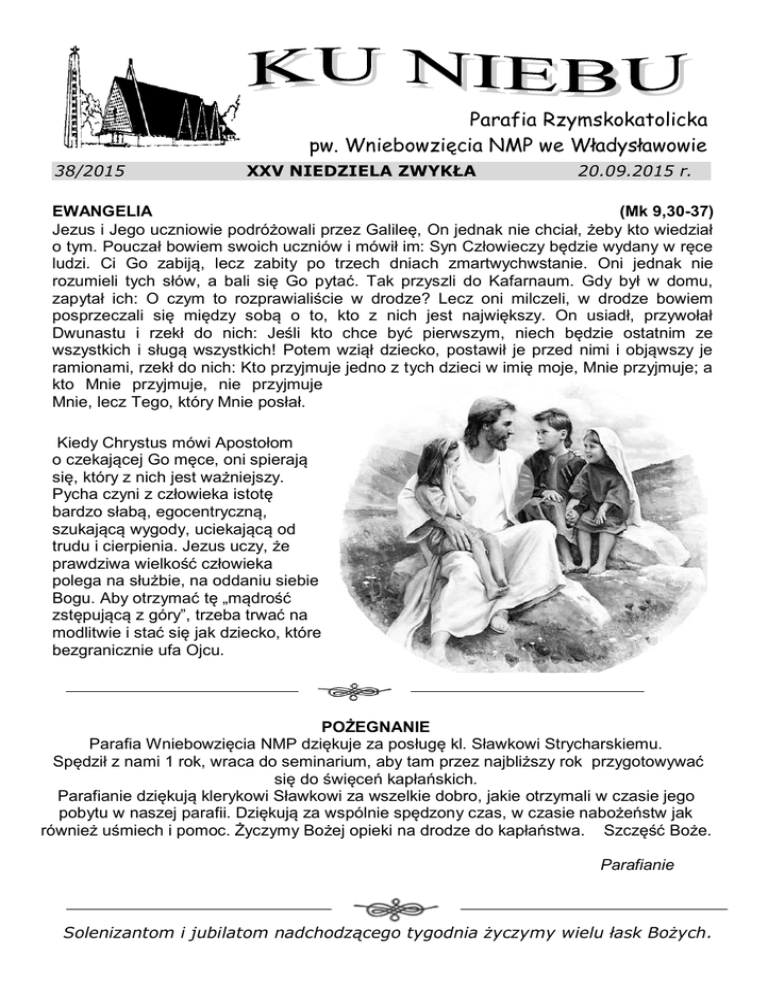 Parafia Rzymskokatolicka pw. Wniebowzięcia NMP we Władysławowie 38/2015 XXV NIEDZIELA ZWYKŁA 20.09.2015 r. EWANGELIA (Mk 9,30-37) Jezus i Jego uczniowie podróżowali przez Galileę, On jednak nie chciał, żeby kto wiedział o tym. Pouczał bowiem swoich uczniów i mówił im: Syn Człowieczy będzie wydany w ręce ludzi. Ci Go zabiją, lecz zabity po trzech dniach zmartwychwstanie. Oni jednak nie rozumieli tych słów, a bali się Go pytać. Tak przyszli do Kafarnaum. Gdy był w domu, zapytał ich: O czym to rozprawialiście w drodze? Lecz oni milczeli, w drodze bowiem posprzeczali się między sobą o to, kto z nich jest największy. On usiadł, przywołał Dwunastu i rzekł do nich: Jeśli kto chce być pierwszym, niech będzie ostatnim ze wszystkich i sługą wszystkich! Potem wziął dziecko, postawił je przed nimi i objąwszy je ramionami, rzekł do nich: Kto przyjmuje jedno z tych dzieci w imię moje, Mnie przyjmuje; a kto Mnie przyjmuje, nie przyjmuje Mnie, lecz Tego, który Mnie posłał. Kiedy Chrystus mówi Apostołom o czekającej Go męce, oni spierają się, który z nich jest ważniejszy. Pycha czyni z człowieka istotę bardzo słabą, egocentryczną, szukającą wygody, uciekającą od trudu i cierpienia. Jezus uczy, że prawdziwa wielkość człowieka polega na służbie, na oddaniu siebie Bogu. Aby otrzymać tę „mądrość zstępującą z góry”, trzeba trwać na modlitwie i stać się jak dziecko, które bezgranicznie ufa Ojcu. POŻEGNANIE Parafia Wniebowzięcia NMP dziękuje za posługę kl. Sławkowi Strycharskiemu. Spędził z nami 1 rok, wraca do seminarium, aby tam przez najbliższy rok przygotowywać się do święceń kapłańskich. Parafianie dziękują klerykowi Sławkowi za wszelkie dobro, jakie otrzymali w czasie jego pobytu w naszej parafii. Dziękują za wspólnie spędzony czas, w czasie nabożeństw jak również uśmiech i pomoc. Życzymy Bożej opieki na drodze do kapłaństwa. Szczęść Boże. Parafianie Solenizantom i jubilatom nadchodzącego tygodnia życzymy wielu łask Bożych. 22 WRZEŚNIA DZIEŃ WIECZYSTEJ ADORACJI We wtorek w naszej parafii przypada dzień Wieczystej Adoracji Najświętszego Sakramentu. Po Mszy św. o godz. 7.00 rano wystawiony zostanie Najświętszy Sakrament i adoracja będzie trwała do wieczornej Mszy św. Grafik adoracji:: 8.00- 10.00 - Hallerowo 10.00- 12.00 - Cetniewo 12.00- 14.00 - Żwirowa 14.00- 16.00 - Szotland 16.00- 18.00 - Śródmieście Znajdźmy choć trochę czasu na bycie z Jezusem Eucharystycznym w wyznaczonym dla siebie czasie lub o innej porze dnia. KALENDARIUM TYGODNIA 21.09 (poniedziałek)-św. Mateusza Ewang. 23.09 (środa)- św. Pio z Pietreleciny 25.09 (piątek)- bł. Władysława z Gielniowa REKOLEKCJE NA ZAKOŃCZENIE SEZONU Zakończył się „sezon wakacyjny” w naszym mieście. Od dnia 11 do 13 października pragniemy młodzieży i dorosłym zaproponować rekolekcje które wygłosi ks. Andrzej Trojanowski-egzorcysta. PAPIESKI FESTYN RODZINNY Na rozpoczęcie roku formacyjnego planujemy w niedzielę 4 października 2015 Papieski Festyn Rodzinny. Najważniejsze cele festynu to budowanie wspólnoty parafialnej i pogłębianie więzi międzyludzkich oraz propagowanie myśli i nauczania papieża Jana Pawła II. Festyn rozpocznie się ok. 14.00, a zakończy finałem loterii fantowej ok 18.00. Zwracam się z prośbą o współtworzenie tego wydarzenia. Każde zaangażowanie bardzo mile widziane. Zapraszamy wszystkich chętnych do współorganizacji Festynu Parafialnego. Czekamy na pomysły. Prosimy także o składanie przeróżnych przedmiotów do loterii fantowej, a rzeźbiarzy, malarzy i innych artystów prosimy o tworzenie dzieł na aukcje. Jeśli ktoś ma pomysł związany z występem na scenie to prosimy o przekazanie takiej informacji. Mamy także nadzieję, że tak jak poprzednio wiele parafianek upiecze ciasto na festyn. XII BIEG PAPIESKI o MEMORIAŁ ŚW. JANA PAWŁA II Tegoroczny Półmaraton o Memoriał św. Jana Pawła II będzie miał miejsce 4 października. Zbiórka wszystkich uczestników Biegu na placu przy kościele we Władysławowie o godz. 12.00, skąd nastąpi wyjazd do Jastarni lub bezpośrednio na miejscu przy Gimnazjum im. Jana Pawła II w Jastarni. godz. 13.00 – uroczyste otwarcie Biegu na placu przy Gim. im. JP II w Jastarni godz. 13.30 – start Biegu Głównego. 14.00- start zawodników na wózkach Udział w zawodach prosimy potwierdzić najpóźniej do 28 września. Szczegółowe informacje na stronie internetowej parafii oraz w gablocie przy kościele. Zgłoszenia i dodatkowe informacje można uzyskać pod nr. telefonu: 607-373-969 ( Augustyn Hadas . e-mail: [email protected] BIEG RODZINNY o MEMORIAŁ ŚW. JANA PAWŁA II w Alejach gwiazd rozpocznie się o godz. 16.30. Zapisy przy pomniku Abrahama od godz. 16.00. (ok. 500 metrów) Na bieg zapraszamy całe rodziny, jeśli to niemożliwe to zachęcamy aby wystawić przynajmniej przedstawicieli rodzin. APOSTOLSTWA DOBREJ ŚMIERCI Działająca przy naszej parafii grupa Apostolstwa Dobrej Śmierci organizuje w I sobotę października tj. 3 października 2015r. całodniową, autokarową pielgrzymkę do sanktuarium maryjnego w Górce Klasztornej k/ Piły. To najstarsze sanktuarium Matki Bożej w Polsce, prowadzone przez Księży Misjonarzy św. Rodziny jest miejscem skupienia i modlitwy, gdzie wierzący otrzymują pocieszenie, nadzieję i pokrzepienie w wierze. Osoby, które chciałyby uczestniczyć w tej pielgrzymce mogą zapisywać się u ks. Andrzeja lub u p. Barbary Nasierowskiej. Koszt pielgrzymki 65 zł. CHÓR PARAFIALNY Chór parafialny rozpoczął swoje próby. Wszystkich chętnych zarówno mężczyzn jak i kobiety do śpiewania w chórze o śpiewania zapraszamy na próby we wtorki i czwartki na godz. 19.00. SCHOLA DZIECIĘCA Schola śpiewa w niedzielę podczas Mszy św. o godz. 11.00. W spotkaniach nie chodzi tylko o śpiewanie. Schola to uczenie się bycia w grupie, kształtowanie postawy prospołecznej przez