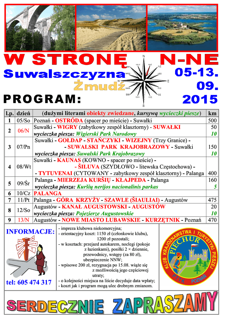PRO G RAM : l.p. dzień 1 2 3 4 5 6 7 8 9 (dużymi literami obiekty zwiedzane, kursywą wycieczki piesze) 05/So Poznań - OSTRÓDA (spacer po mieście) - Suwałki Suwałki - WIGRY (zabytkowy zespół klasztorny) - SUWAŁKI 06/N wycieczka piesza: Wigierski Park Narodowy Suwałki - GOŁDAP - STAŃCZYKI - WIZEJNY (Trzy Granice) 07/Pn - SUWALSKI PARK KRAJOBRAZOWY - Suwałki wycieczka piesza: Suwalski Park Krajobrazowy Suwałki - KAUNAS (KOWNO - spacer po mieście) - ŠILUVA (SZYDŁOWO - litewska Częstochowa) 08/Wt - TYTUVENAI (CYTOWANY - zabytkowy zespół klasztorny) - Palanga Palanga - MIERZEJA KURŠIŲ - KŁAJPEDA - Palanga 09/Śr wycieczka piesza: Kuršių nerijos nacionalinis parkas 10/Cz PALANGA 11/Pt Palanga - GÓRA KRZYŻY - SZAWLE (ŠIAULIAI) - Augustów Augustów - KANAŁ AUGUSTOWSKI - AUGUSTÓW 12/So wycieczka piesza: Pojezierze Augustowskie 13/N Augustów - NOWE MIASTO LUBAWSKIE - KURZĘTNIK - Poznań INFORMACJE: tel: 605 474 317 - impreza klubowa niekomercyjna; - orientacyjny koszt: 1150 zł (członkowie klubu), 1200 zł pozostali; - w kosztach: przejazd autokarem, noclegi (pokoje z łazienkami), posiłki 2 × dziennie, przewodnicy, wstępy (za 80 zł), ubezpieczenie NNW; - wpisowe 200 zł, rezygnacja po 15.08. wiąże się z możliwością jego częściowej utraty; - o kolejności miejsca na liście decyduje data wpłaty; - koszt jak i program mogą ulec drobnym zmianom. km 500 50 10 150 10 400 160 5 475 20 10 470 PRO G RAM : l.p. dzień 1 2 3 4 5 6 7 8 9 (dużymi literami obiekty zwiedzane, kursywą wycieczki piesze) 05/So Poznań - OSTRÓDA (spacer po mieście) - Suwałki Suwałki - WIGRY (zabytkowy zespół klasztorny) - SUWAŁKI 06/N wycieczka piesza: Wigierski Park Narodowy Suwałki - GOŁDAP - STAŃCZYKI - WIZEJNY (Trzy Granice) 07/Pn - SUWALSKI PARK KRAJOBRAZOWY - Suwałki wycieczka piesza: Suwalski Park Krajobrazowy Suwałki - KAUNAS (KOWNO - spacer po mieście) - ŠILUVA (SZYDŁOWO - litewska Częstochowa) 08/Wt - TYTUVENAI (CYTOWANY - zabytkowy zespół klasztorny) - Palanga Palanga - MIERZEJA KURŠIŲ - KŁAJPEDA - Palanga 09/Śr wycieczka piesza: Kuršių nerijos nacionalinis parkas 10/Cz PALANGA 11/Pt Palanga - GÓRA KRZYŻY - SZAWLE (ŠIAULIAI) - Augustów Augustów - KANAŁ AUGUSTOWSKI - AUGUSTÓW 12/So wycieczka piesza: Pojezierze Augustowskie 13/N Augustów - NOWE MIASTO LUBAWSKIE - KURZĘTNIK - Poznań INFORMACJE: tel: 605 474 317 - impreza klubowa niekomercyjna; - orientacyjny koszt: 1150 zł (członkowie klubu), 1200 zł pozostali; - w kosztach: przejazd autokarem, noclegi (pokoje z łazienkami), posiłki 2 × dziennie, przewodnicy, wstępy (za 80 zł), ubezpieczenie NNW; - wpisowe 200 zł, rezygnacja po 15.08. wiąże się z możliwością jego częściowej utraty; - o kolejności miejsca na liście decyduje data wpłaty; - koszt jak i program mogą ulec drobnym zmianom. km 500 50 10 150 10 400 160 5 475 20 10 470