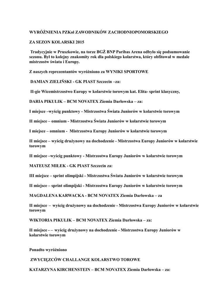 WYRÓŻNIENIA PZKol ZAWODNIKÓW ZACHODNIOPOMORSKIEGO ZA SEZON KOLARSKI 2015 Tradycyjnie w Pruszkowie, na torze BGŻ BNP Paribas Arena odbyło się podsumowanie sezonu. Był to kolejny znakomity rok dla polskiego kolarstwa, który obfitował w medale mistrzostw świata i Europy. Z naszych reprezentantów wyróżniono za WYNIKI SPORTOWE DAMIAN ZIELIŃSKI - GK PIAST Szczecin –za: II-gie Wicemistrzostwo Europy w kolarstwie torowym kat. Elita- sprint klasyczny, DARIA PIKULIK – BCM NOVATEX Ziemia Darłowska – za: I miejsce –wyścig punktowy - Mistrzostwa Świata Juniorów w kolarstwie torowym II miejsce – omnium - Mistrzostwa Świata Juniorów w kolarstwie torowym I miejsce – omnium - Mistrzostwa Europy Juniorów w kolarstwie torowym II miejsce – wyścig drużynowy na dochodzenie - Mistrzostwa Europy Juniorów w kolarstwie torowym II miejsce –wyścig punktowy - Mistrzostwa Europy Juniorów w kolarstwie torowym MATEUSZ MIŁEK - GK PIAST Szczecin za: III miejsce – sprint olimpijski - Mistrzostwa Świata Juniorów w kolarstwie torowym II miejsce – sprint olimpijski - Mistrzostwa Europy Juniorów w kolarstwie torowym MAGDALENA KARWACKA - BCM NOVATEX Ziemia Darłowska – za II miejsce – wyścig drużynowy na dochodzenie - Mistrzostwa Europy Juniorów w kolarstwie torowym WIKTORIA PIKULIK – BCM NOVATEX Ziemia Darłowska – za: II miejsce - – wyścig drużynowy na dochodzenie - Mistrzostwa Europy Juniorów w kolarstwie torowym Ponadto wyróżniono ZWYCIĘZCÓW CHALLANGE KOLARSTWO TOROWE KATARZYNA KIRCHENSTEIN – BCM NOVATEX Ziemia Darłowska – za: I miejsce w klasyfikacji indywidualnej PZKol w kolarstwie torowym w kat. kobiety open I miejsce w klasyfikacji indywidualnej PZKol w kolarstwie torowym w kat. kobiety U23 ZWYCIĘZCÓW PUCHARU POLSKI KOLARSTWO TOROWE ALEKSANDRA SOŁGAŁA - BCM NOVATEX Ziemia Darłowska – za: I miejsce w klasyfikacji końcowej PP w kol. torowym w konkurencji sprint –elita kobiet 1 miejsce w klasyfikacji końcowej PP w kol. torowym w konkurencji keirin –elita kobiet DARIA PIKULIK – BCM NOVATEX Ziemia Darłowska – za: I miejsce w klasyfikacji końcowej PP w kol. torowym w konkurencji omnium –elita kobiet 1 miejsce w klasyfikacji końcowej PP w kol. torowym w konkurencji omnium- juniorka MAGDALENA KARWACKA – BCM NOVATEX Ziemia Darłowska – za: I miejsce w klasyfikacji końcowej PP w kol. torowym w konkurencji sprint – juniorka PATRYCJA SEREMAK – LUKS JF DUET Goleniów- za: I miejsce w klasyfikacji końcowej PP w kol. torowym w konkurencji sprint – juniorka młodsza I miejsce w klasyfikacji końcowej PP w kol. torowym w konkurencji keirin – juniorka młodsza KAROLINA TOPOLSKA – LUKS JF DUET Goleniów- za: I miejsce w klasyfikacji końcowej PP w kol. torowym w konkurencji omnium – juniorka młodsza TRENERZY MEDALISTÓW MARCIN ADMÓW –trener kadrowy i klubowy medalistek -BCM NOVATEX Ziemia Darłowska BARTOSIK TOMASZ – trener kadrowy medalistów, klubowy - KSI START Szczecin ZYGFRYD JAREMA – GK PIAST Szczecin - trener klubowy medalistów KLASYFIKACJA KLUBOWA TOR – miejsca I BCM NOVATEX Ziemia Darłowska – Elita Kobiet BCM NOVATEX Ziemia Darłowska – Juniorki LUKS JF DUET Goleniów – juniorki młodsze