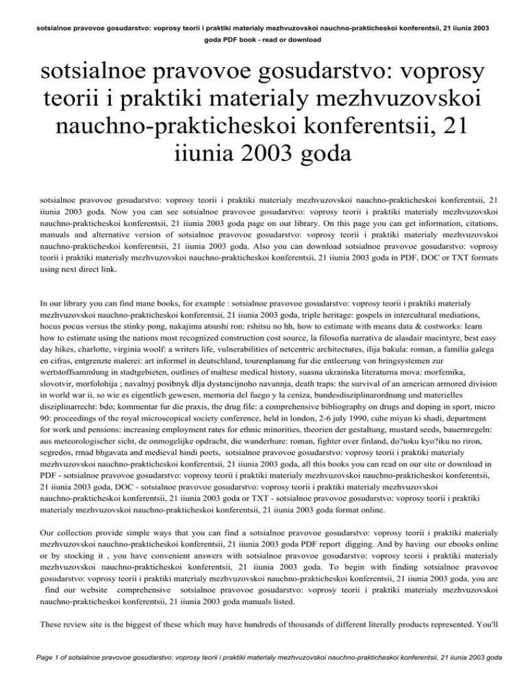 sotsialnoe pravovoe gosudarstvo: voprosy teorii i praktiki materialy mezhvuzovskoi nauchno-prakticheskoi konferentsii, 21 iiunia 2003 goda PDF book - read or download sotsialnoe pravovoe gosudarstvo: voprosy teorii i praktiki materialy mezhvuzovskoi nauchno-prakticheskoi konferentsii, 21 iiunia 2003 goda sotsialnoe pravovoe gosudarstvo: voprosy teorii i praktiki materialy mezhvuzovskoi nauchno-prakticheskoi konferentsii, 21 iiunia 2003 goda. Now you can see sotsialnoe pravovoe gosudarstvo: voprosy teorii i praktiki materialy mezhvuzovskoi nauchno-prakticheskoi konferentsii, 21 iiunia 2003 goda page on our library. On this page you can get information, citations, manuals and alternative version of sotsialnoe pravovoe gosudarstvo: voprosy teorii i praktiki materialy mezhvuzovskoi nauchno-prakticheskoi konferentsii, 21 iiunia 2003 goda. Also you can download sotsialnoe pravovoe gosudarstvo: voprosy teorii i praktiki materialy mezhvuzovskoi nauchno-prakticheskoi konferentsii, 21 iiunia 2003 goda in PDF, DOC or TXT formats using next direct link. In our library you can find mane books, for example : sotsialnoe pravovoe gosudarstvo: voprosy teorii i praktiki materialy mezhvuzovskoi nauchno-prakticheskoi konferentsii, 21 iiunia 2003 goda, triple heritage: gospels in intercultural mediations, hocus pocus versus the stinky pong, nakajima atsushi ron: rshitsu no hh, how to estimate with means data & costworks: learn how to estimate using the nations most recognized construction cost source, la filosofia narrativa de alasdair macintyre, best easy day hikes, charlotte, virginia woolf: a writers life, vulnerabilities of netcentric architectures, ilija bakula: roman, a familia galega en cifras, entgrenzte malerei: art informel in deutschland, tourenplanung fur die entleerung von bringsystemen zur wertstoffsammlung in stadtgebieten, outlines of maltese medical history, suasna ukrainska literaturna mova: morfemika, slovotvir, morfolohija ; navalnyj posibnyk dlja dystancijnoho navannja, death traps: the survival of an american armored division in world war ii, so wie es eigentlich gewesen, memoria del fuego y la ceniza, bundesdisziplinarordnung und materielles disziplinarrecht: bdo; kommentar fur die praxis, the drug file: a comprehensive bibliography on drugs and doping in sport, micro 90: proceedings of the royal microscopical society conference, held in london, 2-6 july 1990, cuhe miyan ki shadi, department for work and pensions: increasing employment rates for ethnic minorities, theorien der gestaltung, mustard seeds, bauernregeln: aus meteorologischer sicht, de onmogelijke opdracht, die wanderhure: roman, fighter over finland, do?toku kyo?iku no riron, segredos, rmad bhgavata and medieval hindi poets, sotsialnoe pravovoe gosudarstvo: voprosy teorii i praktiki materialy mezhvuzovskoi nauchno-prakticheskoi konferentsii, 21 iiunia 2003 goda, all this books you can read on our site or download in PDF - sotsialnoe pravovoe gosudarstvo: voprosy teorii i praktiki materialy mezhvuzovskoi nauchno-prakticheskoi konferentsii, 21 iiunia 2003 goda, DOC - sotsialnoe pravovoe gosudarstvo: voprosy teorii i praktiki materialy mezhvuzovskoi nauchno-prakticheskoi konferentsii, 21 iiunia 2003 goda or TXT - sotsialnoe pravovoe gosudarstvo: voprosy teorii i praktiki materialy mezhvuzovskoi nauchno-prakticheskoi konferentsii, 21 iiunia 2003 goda format online. Our collection provide simple ways that you can find a sotsialnoe pravovoe gosudarstvo: voprosy teorii i praktiki materialy mezhvuzovskoi nauchno-prakticheskoi konferentsii, 21 iiunia 2003 goda PDF report digging. And by having our ebooks online or by stocking it , you have convenient answers with sotsialnoe pravovoe gosudarstvo: voprosy teorii i praktiki materialy mezhvuzovskoi nauchno-prakticheskoi konferentsii, 21 iiunia 2003 goda. To begin with finding sotsialnoe pravovoe gosudarstvo: voprosy teorii i praktiki materialy mezhvuzovskoi nauchno-prakticheskoi konferentsii, 21 iiunia 2003 goda, you are find our website comprehensive sotsialnoe pravovoe gosudarstvo: voprosy teorii i praktiki materialy mezhvuzovskoi nauchno-prakticheskoi konferentsii, 21 iiunia 2003 goda manuals listed. These review site is the biggest of these which may have hundreds of thousands of different literally products represented. You'll Page 1 of sotsialnoe pravovoe gosudarstvo: voprosy teorii i praktiki materialy mezhvuzovskoi nauchno-prakticheskoi konferentsii, 21 iiunia 2003 goda sotsialnoe pravovoe gosudarstvo: voprosy teorii i praktiki materialy mezhvuzovskoi nauchno-prakticheskoi konferentsii, 21 iiunia 2003 goda PDF book - read or download also see that there are specific sites catered to different product types or categories, brands or niche categories related with sotsialnoe pravovoe gosudarstvo: voprosy teorii i praktiki materialy mezhvuzovskoi nauchno-prakticheskoi konferentsii, 21 iiunia 2003 goda. So depending on just what you are searching, you will be able to choose ebooks sotsialnoe pravovoe gosudarstvo: voprosy teorii i praktiki materialy mezhvuzovskoi nauchno-prakticheskoi konferentsii, 21 iiunia 2003 goda to suit your own needs, sotsialnoe pravovoe gosudarstvo: voprosy teorii i praktiki materialy mezhvuzovskoi nauchno-prakticheskoi konferentsii, 21 iiunia 2003 goda. Page 2 of sotsialnoe pravovoe gosudarstvo: voprosy teorii i praktiki materialy mezhvuzovskoi nauchno-prakticheskoi konferentsii, 21 iiunia 2003 goda