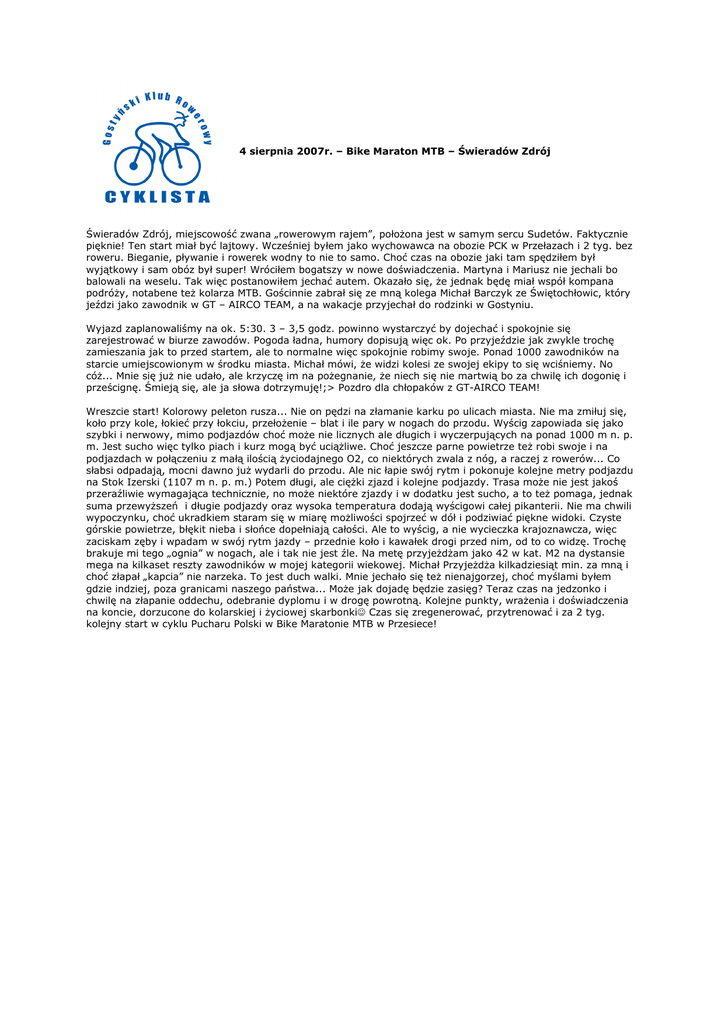4 sierpnia 2007r. – Bike Maraton MTB – Świeradów Zdrój Świeradów Zdrój, miejscowość zwana „rowerowym rajem”, położona jest w samym sercu Sudetów. Faktycznie pięknie! Ten start miał być lajtowy. Wcześniej byłem jako wychowawca na obozie PCK w Przełazach i 2 tyg. bez roweru. Bieganie, pływanie i rowerek wodny to nie to samo. Choć czas na obozie jaki tam spędziłem był wyjątkowy i sam obóz był super! Wróciłem bogatszy w nowe doświadczenia. Martyna i Mariusz nie jechali bo balowali na weselu. Tak więc postanowiłem jechać autem. Okazało się, że jednak będę miał współ kompana podróży, notabene też kolarza MTB. Gościnnie zabrał się ze mną kolega Michał Barczyk ze Świętochłowic, który jeździ jako zawodnik w GT – AIRCO TEAM, a na wakacje przyjechał do rodzinki w Gostyniu. Wyjazd zaplanowaliśmy na ok. 5:30. 3 – 3,5 godz. powinno wystarczyć by dojechać i spokojnie się zarejestrować w biurze zawodów. Pogoda ładna, humory dopisują więc ok. Po przyjeździe jak zwykle trochę zamieszania jak to przed startem, ale to normalne więc spokojnie robimy swoje. Ponad 1000 zawodników na starcie umiejscowionym w środku miasta. Michał mówi, że widzi kolesi ze swojej ekipy to się wciśniemy. No cóż... Mnie się już nie udało, ale krzyczę im na pożegnanie, że niech się nie martwią bo za chwilę ich dogonię i prześcignę. Śmieją się, ale ja słowa dotrzymuję!;> Pozdro dla chłopaków z GT-AIRCO TEAM! Wreszcie start! Kolorowy peleton rusza... Nie on pędzi na złamanie karku po ulicach miasta. Nie ma zmiłuj się, koło przy kole, łokieć przy łokciu, przełożenie – blat i ile pary w nogach do przodu. Wyścig zapowiada się jako szybki i nerwowy, mimo podjazdów choć może nie licznych ale długich i wyczerpujących na ponad 1000 m n. p. m. Jest sucho więc tylko piach i kurz mogą być uciążliwe. Choć jeszcze parne powietrze też robi swoje i na podjazdach w połączeniu z małą ilością życiodajnego O2, co niektórych zwala z nóg, a raczej z rowerów... Co słabsi odpadają, mocni dawno już wydarli do przodu. Ale nic łapie swój rytm i pokonuje kolejne metry podjazdu na Stok Izerski (1107 m n. p. m.) Potem długi, ale ciężki zjazd i kolejne podjazdy. Trasa może nie jest jakoś przeraźliwie wymagająca technicznie, no może niektóre zjazdy i w dodatku jest sucho, a to też pomaga, jednak suma przewyższeń i długie podjazdy oraz wysoka temperatura dodają wyścigowi całej pikanterii. Nie ma chwili wypoczynku, choć ukradkiem staram się w miarę możliwości spojrzeć w dół i podziwiać piękne widoki. Czyste górskie powietrze, błękit nieba i słońce dopełniają całości. Ale to wyścig, a nie wycieczka krajoznawcza, więc zaciskam zęby i wpadam w swój rytm jazdy – przednie koło i kawałek drogi przed nim, od to co widzę. Trochę brakuje mi tego „ognia” w nogach, ale i tak nie jest źle. Na metę przyjeżdżam jako 42 w kat. M2 na dystansie mega na kilkaset reszty zawodników w mojej kategorii wiekowej. Michał Przyjeżdża kilkadziesiąt min. za mną i choć złapał „kapcia” nie narzeka. To jest duch walki. Mnie jechało się też nienajgorzej, choć myślami byłem gdzie indziej, poza granicami naszego państwa... Może jak dojadę będzie zasięg? Teraz czas na jedzonko i chwilę na złapanie oddechu, odebranie dyplomu i w drogę powrotną. Kolejne punkty, wrażenia i doświadczenia na koncie, dorzucone do kolarskiej i życiowej skarbonki☺ Czas się zregenerować, przytrenować i za 2 tyg. kolejny start w cyklu Pucharu Polski w Bike Maratonie MTB w Przesiece!