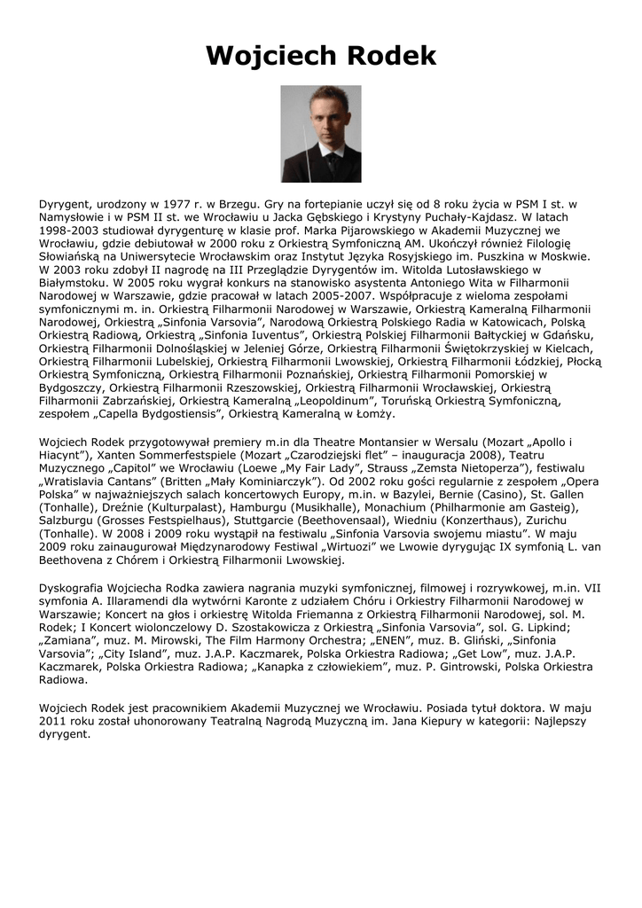 Wojciech Rodek Dyrygent, urodzony w 1977 r. w Brzegu. Gry na fortepianie uczył się od 8 roku życia w PSM I st. w Namysłowie i w PSM II st. we Wrocławiu u Jacka Gębskiego i Krystyny Puchały-Kajdasz. W latach 1998-2003 studiował dyrygenturę w klasie prof. Marka Pijarowskiego w Akademii Muzycznej we Wrocławiu, gdzie debiutował w 2000 roku z Orkiestrą Symfoniczną AM. Ukończył również Filologię Słowiańską na Uniwersytecie Wrocławskim oraz Instytut Języka Rosyjskiego im. Puszkina w Moskwie. W 2003 roku zdobył II nagrodę na III Przeglądzie Dyrygentów im. Witolda Lutosławskiego w Białymstoku. W 2005 roku wygrał konkurs na stanowisko asystenta Antoniego Wita w Filharmonii Narodowej w Warszawie, gdzie pracował w latach 2005-2007. Współpracuje z wieloma zespołami symfonicznymi m. in. Orkiestrą Filharmonii Narodowej w Warszawie, Orkiestrą Kameralną Filharmonii Narodowej, Orkiestrą „Sinfonia Varsovia”, Narodową Orkiestrą Polskiego Radia w Katowicach, Polską Orkiestrą Radiową, Orkiestrą „Sinfonia Iuventus”, Orkiestrą Polskiej Filharmonii Bałtyckiej w Gdańsku, Orkiestrą Filharmonii Dolnośląskiej w Jeleniej Górze, Orkiestrą Filharmonii Świętokrzyskiej w Kielcach, Orkiestrą Filharmonii Lubelskiej, Orkiestrą Filharmonii Lwowskiej, Orkiestrą Filharmonii Łódzkiej, Płocką Orkiestrą Symfoniczną, Orkiestrą Filharmonii Poznańskiej, Orkiestrą Filharmonii Pomorskiej w Bydgoszczy, Orkiestrą Filharmonii Rzeszowskiej, Orkiestrą Filharmonii Wrocławskiej, Orkiestrą Filharmonii Zabrzańskiej, Orkiestrą Kameralną „Leopoldinum”, Toruńską Orkiestrą Symfoniczną, zespołem „Capella Bydgostiensis”, Orkiestrą Kameralną w Łomży. Wojciech Rodek przygotowywał premiery m.in dla Theatre Montansier w Wersalu (Mozart „Apollo i Hiacynt”), Xanten Sommerfestspiele (Mozart „Czarodziejski flet” – inauguracja 2008), Teatru Muzycznego „Capitol” we Wrocławiu (Loewe „My Fair Lady”, Strauss „Zemsta Nietoperza”), festiwalu „Wratislavia Cantans” (Britten „Mały Kominiarczyk”). Od 2002 roku gości regularnie z zespołem „Opera Polska” w najważniejszych salach koncertowych Europy, m.in. w Bazylei, Bernie (Casino), St. Gallen (Tonhalle), Dreźnie (Kulturpalast), Hamburgu (Musikhalle), Monachium (Philharmonie am Gasteig), Salzburgu (Grosses Festspielhaus), Stuttgarcie (Beethovensaal), Wiedniu (Konzerthaus), Zurichu (Tonhalle). W 2008 i 2009 roku wystąpił na festiwalu „Sinfonia Varsovia swojemu miastu”. W maju 2009 roku zainaugurował Międzynarodowy Festiwal „Wirtuozi” we Lwowie dyrygując IX symfonią L. van Beethovena z Chórem i Orkiestrą Filharmonii Lwowskiej. Dyskografia Wojciecha Rodka zawiera nagrania muzyki symfonicznej, filmowej i rozrywkowej, m.in. VII symfonia A. Illaramendi dla wytwórni Karonte z udziałem Chóru i Orkiestry Filharmonii Narodowej w Warszawie; Koncert na głos i orkiestrę Witolda Friemanna z Orkiestrą Filharmonii Narodowej, sol. M. Rodek; I Koncert wiolonczelowy D. Szostakowicza z Orkiestrą „Sinfonia Varsovia”, sol. G. Lipkind; „Zamiana”, muz. M. Mirowski, The Film Harmony Orchestra; „ENEN”, muz. B. Gliński, „Sinfonia Varsovia”; „City Island”, muz. J.A.P. Kaczmarek, Polska Orkiestra Radiowa; „Get Low”, muz. J.A.P. Kaczmarek, Polska Orkiestra Radiowa; „Kanapka z człowiekiem”, muz. P. Gintrowski, Polska Orkiestra Radiowa. Wojciech Rodek jest pracownikiem Akademii Muzycznej we Wrocławiu. Posiada tytuł doktora. W maju 2011 roku został uhonorowany Teatralną Nagrodą Muzyczną im. Jana Kiepury w kategorii: Najlepszy dyrygent.