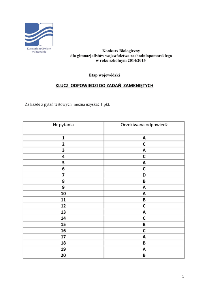Konkurs Biologiczny dla gimnazjalistów województwa zachodniopomorskiego w roku szkolnym 2014/2015 Etap wojewódzki KLUCZ ODPOWIEDZI DO ZADAŃ ZAMKNIĘTYCH Za każde z pytań testowych można uzyskać 1 pkt. Nr pytania Oczekiwana odpowiedź 1 2 3 4 5 6 7 8 9 10 11 12 13 14 15 16 17 18 19 20 A C A C A C D B A A B C A C B C A B A B 1 KARTA ODPOWIEDZI DO ZADAŃ OTWARTYCH Za zadania otwarte możliwa do zdobycia ilość punktów podana jest przy każdym zadaniu. W poniższym schemacie oceniania prezentowane są przykładowe prawidłowe odpowiedzi. W nawiasach podane są nieobowiązujące uzupełnienia odpowiedzi, zaś sformułowania rozdzielone ukośnikiem są traktowane jako równoważne. ZADANIE 1 21 (4 pkt) G 2 3 P 4 5 Z I 6 7 8 Z A A M E T O F I L I Ś C I E Ń Y Ł E K R O D N I A A R N I A K S Z Y S Z K A L Ą Ż E K B I E L M O T za wskazanie 8 prawidłowych odpowiedzi - 4 pkt; za wskazanie 6 lub 7 prawidłowych odpowiedzi - 3 pkt; za wskazanie 4 lub 5 prawidłowych odpowiedzi - 2 pkt; za wskazanie 2 lub 3 prawidłowych odpowiedzi - 1 pkt; za wskazanie mniej niż 2 prawidłowych odpowiedzi - 0 pkt. 2 ZADANIE 22 ( 3 pkt) Nazwa choroby Objawy choroby zespół Turnera; 4 mukowiscydoza; 6,8 albinizm; 2 anemia sierpowata; 3 pląsawica Huntingtona. 1,7 zespół Klinefeltera 5 za wskazanie 6 prawidłowych odpowiedzi - 3 pkt; za wskazanie 4 lub 5 prawidłowych odpowiedzi - 2 pkt; za wskazanie 2 lub 3 prawidłowych odpowiedzi - 1 pkt; za wskazanie mniej niż 2 prawidłowych odpowiedzi - 0 pkt. ZADANIE 23 (4 pkt) a. glista ludzka - skażona żywność/ woda, brudne ręce, tasiemiec nieuzbrojony - skażone mięso (wołowe), owsik - skażona żywność/ woda, nieprzestrzeganie higieny (osobistej), brudne ręce, ręczniki. grypa - drogą powietrzno-kropelkową od zarażonej osoby, wirus HCV - poprzez zarażoną krew, zabiegi medyczne i kosmetyczne, w czasie stosunków płciowych, matka może zarazić dziecko w trakcie porodu, włosień krętym - mięso zawierające larwy. za wskazanie 6 prawidłowych odpowiedzi - 3 pkt; za wskazanie 4 lub 5 prawidłowych odpowiedzi - 2 pkt; za wskazanie 2 lub 3 prawidłowych odpowiedzi - 1 pkt; za wskazanie mniej niż 2 prawidłowych odpowiedzi - 0 pkt. Uwaga: Na poprawność odpowiedzi nie ma wpływu określenie stadium inwazyjnego pasożyta. 3 b. spożywanie wyłącznie mięsa przebadanego przez weterynarza/ obróbka termiczna za wskazanie prawidłowej odpowiedzi - 1 pkt; ZADANIE 24 (2 pkt) a. Zdania błędne to zdania numer 2, 4, 7 za wskazanie 2 prawidłowych odpowiedzi - 1 pkt; za wskazanie mniej niż 2 prawidłowych odpowiedzi - 0 pkt. b. Chemosynteza - jeden z rodzajów autotrofizmu. Przeprowadzają ją organizmy, dla których źródłem energii do asymilacji dwutlenku węgla są reakcje chemiczne. za wskazanie prawidłowej odpowiedzi - 1 pkt; Uwaga: zalicza się odpowiedzi jednocześnie odwołujące się do autotrofizmu i wykorzystania energii innej niż energia świetlna. ZADANIE 25 (2 pkt) DNA: TCTGATGGCGTAATGACCCAGTAG a. RNA: AGACUACCGCAUUACUGGGUCAUC za wskazanie prawidłowej odpowiedzi - 1 pkt; b Arg - Leu - Pro - His - Tyr - Trp - Val - Ile za wskazanie prawidłowej odpowiedzi - 1 pkt; Uwaga: Jeżeli w pkt a utworzono RNA na podstawie nici kodującej DNA odpowiedź nie jest uznawana. Jeżeli jednak w pkt b utworzono na jej podstawie prawidłowy peptyd, przyznaje się 1 pkt. 4 ZADANIE 26 (4 pkt ) a. 1. wsierdzie, 5. żyły (płucne), 2. śródsierdzie, 6. utlenowaną, 3. osierdzie/ nasierdzie, 7. układ wieńcowy. 4. zastawki (przedsionkowo-komorowe), za wskazanie 7 lub 6 prawidłowych odpowiedzi - 3 pkt; za wskazanie 4 lub 5 prawidłowych odpowiedzi - 2 pkt; za wskazanie 2 lub 3 prawidłowych odpowiedzi - 1 pkt; za wskazanie mniej niż 2 prawidłowych odpowiedzi - 0 pkt. b. krew należy do tkanki łącznej płynnej, najbardziej wewnętrzną warstwę tętnic buduje nabłonek jednowarstwowy płaski/śródbłonek za wskazanie 2 prawidłowych odpowiedzi - 1 pkt; ZADANIE 27 (4 pkt ) jest niezbędny do utrzymania ciąży - progesteron - jajniki/ ciałko żółte / łożysko mobilizuje organizm do wysiłku, ucieczki - adrenalina - (rdzeń) nadnerczy zwiększa tempo metabolizmu komórkowego - tyroksyna /trójjodotyronina - tarczyca podwyższa poziom glukozy we krwi - glukagon - trzustka. za wskazanie każdej prawidłowej odpowiedzi - 1 pkt. Uwaga: zalicza się odpowiedzi dotyczące wyłącznie nazw hormonów - poprawne wymienienie wszystkich - 2 pkt, poprawne wymienienie 3 nazw - 1 pkt. 5 ZADANIE 28 (3 pkt ) numer zdania 1 P 2 P 3 P 4 F 5 P 6 F ocena poprawności za wskazanie 6 lub 5 prawidłowych odpowiedzi - 3 pkt; za wskazanie 3 lub 4 prawidłowych odpowiedzi - 2 pkt; za wskazanie 2 prawidłowych odpowiedzi - 1 pkt; za wskazanie mniej niż 2 prawidłowych odpowiedzi - 0 pkt. ZADANIE 29 (2 pkt) 1a. igły na krótkopędach w pęczkach po 20-40 sztuk 2a. szyszki stojące 2b.szyszki zwisające rośliny nagonasienne modrzew europejski świerk kłujący jodła pospolita 2c.nasiona okryte czerwoną lub żółtą osnówką 1b.igły pojedyncze cis pospolity za wskazanie 4 prawidłowych opisów - 2 pkt; za wskazanie 3 prawidłowych opisów - 1 pkt; za wskazanie mniej niż 3 prawidłowych opisów - 0 pkt. Uwaga: Zalicza się jedynie schematy zgodne z zasadami konstruowania klucza. Punkt dotyczący szyszki modrzewia nie wpływa na ocenę. 6 ZADANIE 30 (3 pkt) a. numer zdania ocena poprawności 1 P 2 F 3 P 4 F 5 P za wskazanie 5 prawidłowych odpowiedzi - 2 pkt; za wskazanie 3 lub 4 prawidłowych odpowiedzi - 1 pkt; za wskazanie mniej niż 3 prawidłowych odpowiedzi - 0 pkt. b. Dobór naturalny preferuje osobniki najlepiej przystosowane do danych warunków środowiska, w doborze sztucznym rolę selekcjonera pełni człowiek. za wskazanie prawidłowej odpowiedzi - 1 pkt; Uwaga: nie zalicza się odpowiedzi odnoszących się do organizmów "najsilniejszych" lub odpowiedzi bardzo ogólnych ( typu: selekcjonerem jest przyroda ). ZADANIE 31 (4 pkt) a. 1.mitochodrium - przepr