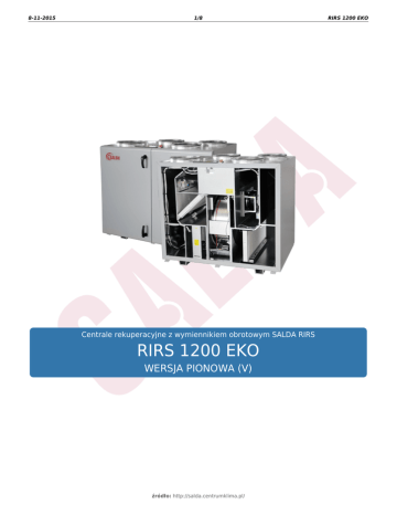 8-11-2015 1/8 Centrale rekuperacyjne z wymiennikiem obrotowym SALDA RIRS RIRS 1200 EKO WERSJA PIONOWA (V) źródło: http://salda.centrumklima.pl/ RIRS 1200 EKO 8-11-2015 2/8 Opis Centrale wentylacyjne RIRS EKO wyposażone są w wydajny obrotowy wymiennik ciepła. Jednostki służą do wentylacji domów oraz innych ogrzewanych pomieszczeń. Ten model produktu może być sterowany za pomocą sterowników Stouch i Flex. • Ciche i wydajne wentylatory EC. • Sprawność wymiennika ciepła: do 74%. • Zintegrowana nagrzewnica elektryczna lub opcjonalnie wodna. • Sterowanie nagrzewnicą elektryczną: 0-10V. • Sterowanie przepływem powietrza. • Niski poziom hałasu. • Izolacja akustyczna ścian: 50 mm. • Szybki i łatwy montaż. • Całkowicie zintegrowany system sterowania typu plug&play. • Zintegrowany presostat mierzący poziom zanieczyszczenia filtra. • Opcjonalny przetwornik CO2, ciśnienia lub przepływu powietrza. źródło: http://salda.centrumklima.pl/ RIRS 1200 EKO 8-11-2015 3/8 RIRS 1200 EKO Dane techniczne Wersja z nagrzewnicą elektryczną RIRS 1200 VE EKO 3.0 Wydajność/spręż Nagrzewnica [m³/h]/[Pa] - faza, napięcie - moc Wentylatory EC - wywiew - nawiew [50Hz/V] [kW] - faza, napięcie [50Hz/V] ~2, 400 4,0 ~1, 230 - moc/prąd [kW/A] 0,408/2,71 - prędkość wentylatora [min-1] 3400 - moc/prąd [kW/A] 0,415/2,81 - prędkość wentylatora [min-1] 3400 [kW/A] 4,84/15,69 Sprawność cieplna Maks. zużycie energii 1350/200 74% Płyta sterująca PRV V2.2 Klasa filtra wywiewnego M5 Klasa filtra nawiewnego F7 Izolacja cieplna [mm] Kolor (RAL) Waga netto 50 7040 [kg] Zgodność z ERP 180,0 2013; 2015 Eksploatacja w pomieszczeniu Stopień ochrony obudowy IP-34 źródło: http://salda.centrumklima.pl/ 8-11-2015 4/8 RIRS 1200 EKO Wersja z nagrzewnicą wodną RIS 1200 VW EKO 3.0 Wydajność/spręż [m³/h]/[Pa] Nagrzewnica wodna (opcja) Wentylatory EC - wywiew - nawiew 1350/200 AVS 315 - faza, napięcie [50Hz/V] ~1, 230 - moc/prąd [kW/A] 0,408/2,71 - prędkość wentylatora [min ] 3400 - moc/prąd [kW/A] 0,415/2,81 - prędkość wentylatora [min ] 3400 -1 -1 Sprawność cieplna* Maks. zużycie energii 74% [kW/A] Płyta sterująca 0,84/5,69 PRV V2.2 Klasa filtra wywiewnego M5 Klasa filtra nawiewnego F7 Izolacja cieplna [mm] Kolor (RAL) Waga netto 50 7040 [kg] Zgodność z ERP 180,0 2013; 2015 Eksploatacja w pomieszczeniu Stopień ochrony obudowy** IP-34 źródło: http://salda.centrumklima.pl/ 8-11-2015 5/8 RIRS 1200 EKO Charakterystyka akustyczna Całkowite Lwa dB(A) Lwa, dB(A) 125 Hz 250 Hz 500 Hz 1 kHz 2 kHz 4 kHz 8 kHz Wlot 78 63 74 71 70 69 64 55 Wylot 67 57 63 56 52 53 51 37 Do otoczenia 57 47 54 49 47 49 46 36 Pomiar przy 1351 m³/h, 181 Pa Wydajność/spręż - wartości mierzone w punkcie pracy. Sprawność cieplna obliczana zgodnie z normą EN 13141-7. Dla temperatur niższych niż zalecane należy użyć nagrzewnicy wstępnej, by zapewnić zrównoważoną eksploatację. Poziomy mocy akustycznej zostały ustalone zgodnie z normą DIN 45635 i/lub ISO 3744 w odległości 1 m od urządzenia. źródło: http://salda.centrumklima.pl/ 8-11-2015 6/8 RIRS 1200 EKO Wymiary W L H ØD H1 F 1500 mm 855 mm 1150 mm 315 mm 70 mm 40 mm źródło: http://salda.centrumklima.pl/ 8-11-2015 7/8 RIRS 1200 EKO Schematy funkcyjne Wersja z nagrzewnicą elektryczną A - powietrze zewnętrzne B - powietrze nawiewane C - powietrze wywiewane D - powietrze odprowadzane na zewnątrz IV - wentylator wywiewny PV - wentylator nawiewny RR - obrotowy wymiennik ciepła R - silnik obrotowego wymiennika ciepła KE - nagrzewnica elektryczna PF - filtr nawiewny IF - filtr wyciągowy TJ - czujnik temperatury powietrza nawiewanego TL - czujnik temperatury powietrza zewnętrznego PS1 - przełącznik różnicowo-ciśnieniowy powietrza nawiewanego PS2 - przełącznik różnicowo-ciśnieniowy powietrza wywiewanego źródło: http://salda.centrumklima.pl/ 8-11-2015 8/8 RIRS 1200 EKO Wersja pozioma z nagrzewnicą wodną A - powietrze zewnętrzne B - powietrze nawiewane C - powietrze wywiewane D - powietrze odprowadzane na zewnątrz AVS - nagrzewnica montowana na kanale (opcja) IV - wentylator wywiewny PV - wentylator nawiewny RR - obrotowy wymiennik ciepła R - silnik obrotowego wymiennika ciepła PF - filtr nawiewny IF - filtr wyciągowy TJ - czujnik temperatury powietrza nawiewanego TL - czujnik temperatury powietrza zewnętrznego M6 - dodatkowy zawór mieszający i siłownik (opcja) T1 - termostat przeciwzamrożeniowy TV - czujnik przeciwzamrożeniowy DTJ - czujnik wilgotności i temperatury PS1 - przełącznik różnicowo-ciśnieniowy powietrza nawiewanego PS2 - przełącznik różnicowo-ciśnieniowy powietrza wywiewanego źródło: http://salda.centrumklima.pl/