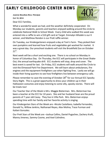 Joanne Mourikes Rice, Principal Oct 10, 2014 Dear ECC Families, What a wonderful week we had, and the weather definitely cooperated. On Monday our students, parents and teachers enjoyed walking around the circle to celebrate National Walk to School Week. Every child who walked this week was entered into a raffle to win a $10 gift card at Target. Emmalyn Wlodek is our K winner, and Matthew Rendon is our PreK raffle winner. On Tuesday, our Kindergarteners enjoyed a day at Tom’s Farm. They picked their own pumpkins and learned how fruits and vegetables get washed for market. It was a great day. Our preschool students will visit the Brookfield Zoo on October 21st. Next week will be a short and exciting one. There is no school on Monday in honor of Columbus Day. On Thursday, the ECC will participate in the Great ShakeOut, the annual earthquake drill. ECC students will stop, drop and cover. The best event is saved for last. On Friday, ECC students will walk around the Circle to visit the Elmwood Park Fire Department. We will learn about ambulances, fire engines and the equipment firefighters use when fighting fires. Lastly we will go inside their living quarters to see how firefighters live between emergency calls. Please remember to save the evening of October 28th for our Annual ECC Spooky Story Night. This is a great opportunity to dress your children up in their Halloween costumes and enjoy listening to some silly, spooky stories. There will be treats too! Our Teacher Star of the Week is Mrs. Maggie Bieterman. Mrs. Bieterman has been a teacher at the ECC for 10 years. She and her husband Sean are the proud parents of 7 year old Casey. They live in Villa Park. Mrs. Bieterman enjoys spending time with her family and her favorite activity is singing. Our Kindergarten Stars of the Week are –Nicole Castellano, Isabella Fernandez, Donald Yu, Willow Jenkins, Nathanael Reyes, Alex Molina, Trace Furman and Kailani Gonzalez. Our PreK Stars of the Week are –Joshua Collins, Daniel Pugachev, Zachery Kraft, Manny Jimenez, Sammy Cosme, and Axel Colindres. Estimadas Familias del Centro ECC Que semana tan maravillosa tuvimos y las temperaturas definitivamente cooperaron con nosotros. El lunes nuestros estudiantes, padres y maestras, disfrutaron de caminar alrededor der círculo para celebrar la Semana Nacional de Caminar a la Escuela. Cada niño que camino esta semana se le dio la oportunidad de entrar en la rifa para ganar una tarjeta de regalo de $10 para la tienda Target. Los ganadores de la rifa fueron, para Kínder Emmalyn Wlodek y para preescolar Matthew Rendón. El martes nuestros estudiantes de Kindergarten disfrutaron su día visitando la finca de calabazas Tom. Ellos escogieron sus propias calabazas y aprendieron como las frutas y los vegetales se limpian para el mercado. Fue un día maravilloso. Nuestros estudiantes de preescolar visitarán el Zoológico Brookfield el 21 de octubre. La semana que viene será una semana corta y emocionante. No habrá clases el lunes en honor al Día de Cristóbal Colón. El jueves el Centro ECC estará participando en el “Great Shake-Out”, nuestra práctica anual de Emergencia en caso de Terremotos. Los estudiantes del Centro ECC se detendrán, se echaran al suelo y buscaran cubierta. El mejor evento se ha reservado para último. El viernes los estudiantes del Centro ECC caminarán alrededor del Círculo para visitar el Departamento de Bomberos de Elmwood Park. Estaremos aprendiendo sobre las ambulancias, los camiones de los bomberos y el equipo que usan los bomberos para apagar incendios. Por último visitaremos los dormitorios de los bomberos para ver cómo viven ellos mientras esperan una llamada de emergencia. Por favor no se olvide de reservar la tarde del 28 de octubre para nuestra Noche Anual de Historias de Misterio del Centro ECC. Esta es una oportunidad maravillosa para que vista a su niño/a con sus disfraces de Halloween y disfrutar de escuchar algunas historias graciosas y misteriosas. ¡Además, tendremos algunas meriendas! Nuestra maestra Estrella de la Semana es la Señora Maggie Bieterman. La Señora Bieterman ha trabajado como maestra en el Centro ECC por unos 10 años. Ella y su esposo Sean son los padres orgullosos de una niñita de 7 años llamada Casey. Ellos viven en Villa Park. La Señora Bieterman disfruta de pasar tiempo con su familia y su actividad favorita es cantar. Nuestros estudiantes Estrella de la Semana para Kindergarten son –Nicole Castellano, Isabella Fernández, Donald Yu, Willow Jenkins, Nathanael Reyes, Alex Molina, Trace Furman y Kailani González. Nuestros estudiantes Estrella de la Semana de preescolar son –Joshua Collins, Daniel Pugachev, Zachery Kraft, Manny Jiménez, Sammy Cosme, and Axel Colindres. Joanne Mourikes Rice Dyrektor 10 pazdziernika, 2014 Drodzy Rodzice, Co za udany tydzien! Nawet pogoda zdawala sie wspolpracowac! W poniedzialek nasi uczniowie, rodzice i nauczyciele z przyjemnoscia przespacerowali sie wokol “kolka” rozpoczynajac tym samym obchody Narodowego Tygodnia “Spacerem do szkoly”. Kazde dziecko, ktore w tyh dniach przyszlo do szkoly pieszo wzielo udzial w losowaniu karty upominkowej na $10 do sklepu Target. Zwyciezcami zostali: Emmalyn Wlodek – uczennica klasy zerowej i Matthew Rendon z grupy przedszkolnej. We wtorek zerowkowicze spedzili caly dzien na farmie Toma, Tom’s Farm. Uczniowie zerwali swaja dynie i obejrzeli, jak warzywa sa myte i przygotowywane do sprzedazy. Dzien byl naprawde udany! Uczniowie z grup przedszkolnych w dniu 21 pazdziernika pojada na wycieczke do Brookfield Zoo. Nastepny tydzien bedzie krotki, ale bardzo ekscytujacy. Poniedzialek jest dniem wolnym od zajec szkolnych z okazji Dnia Krzysztofa Kolumba. We czwartek szkola ECC wezmie udzial w cwiczeniach na wypadek trzesienia ziemi. Uczniowie naucza sie, ze nalezy zatrzymac sie, ukleknac na podlodze i przykryc glowe ( stop, drop and cover). Najciekawsze wydarzenie zarezerwowane zostanie na koniec tygodni