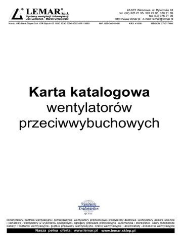 Karta katalogowa wentylatorów przeciwwybuchowych wentylatory przeciwwybuchowe SEAT EX i STORM EX Przeciwwybuchowe chemoodporne promieniowe wentylatory SEAT i STORM s¹ to specjalne wykonania wentylatorów typu VISP i VASP zgodne z wymaganiami Dyrektywy 94/9/EC dotycz¹cej urz¹dzeñ przeznaczonych do u¿ytku w przestrzeniach zagro¿onych wybuchem. Wentylatory SEAT i STORM dostêpne s¹ w wersji EX II 3G C IIB T4. Obudowy wykonane s¹ z wzmacnianego promieniami UV polipropylenu z domieszk¹ grafitu. Wentylatory standardowo dostarczane bez podstawki pod silnik. Charakterystyki pracy oraz dane techniczne zgodnie z danymi wentylatorów VISP i VASP (strony 512518) w/g tabeli zamieszczonej poni¿ej. SEAT EX - dla modeli od SEAT 15 Ex do SEAT 30Ex oraz SEAT 35Ex z silnikiem 2,2kW dedykowany roz³¹cznik 10A, 3-biegunowy + styk pomocniczy, GHG2610005R0010, nr art.44025761. Dla modelu SEAT 35 Ex z silnikiem 5,5kW dedykowany roz³¹cznik 20A, 3-biegunowy + styk pomocniczy, nr art. 44025762. STORM EX - dedykowany roz³¹cznik 10A, 3-biegunowy + styk pomocniczy, GHG2610005R0010, nr art..44025761. Schemat pod³¹czenia elektrycznego rys. 12 str. 777. SEAT EX STORM EX Akcesoria wy³¹cznik 3-biegunowy 10A str. 748 wy³¹cznik 6-biegunowy 20A str. 749 www.venture.pl 619 wentylatory przeciwwybuchowe SEAT EX i STORM EX Dane techniczne Typ moc silnika napiêcie [kW] [V] prêdkoœæ obrotowa [obr./min] odpowiednik VISP/VASP SEAT 15 Ex 0,18 SEAT 230/400 1400 VISP/4-15-025T SEAT 15 Ex 0,37 230/400 2800 VISP/2-15-037T SEAT 20 Ex 0,18 230/400 950 VISP/6-20-018T SEAT 20 Ex 0,25 230/400 1400 VISP/4-20-025T SEAT 20 Ex 0,75 230/400 2800 VISP/2-20-075T SEAT 25 Ex 0,25 230/400 950 VISP/6-25-018T SEAT 25 Ex 0,37 230/400 1400 VISP/4-25-073T SEAT 30 Ex 1,1 230/400 1400 VISP/4-30-150T SEAT 35 Ex 2,2 230/400 950 VISP/6-35-220T SEAT 35 Ex 5,5 230/400 1400 VISP/4-35-550T STORM 10 Ex 0,06 STORM 230/400 1400 VASP/4-10-006T STORM 10 Ex 0,12 230/400 2800 VASP/2-10-012T STORM 12 Ex 0,25 230/400 1400 VASP/4-12-025T STORM 12 Ex 0,37 230/400 2800 VASP/2-12-037T STORM 14 Ex 1,1 230/400 2800 VASP/2-14-110T STORM 16 Ex 2,2 230/400 2800 VASP/2-16-220T 620 Venture Industries Sp. z o.o. ul. Mokra 27, 05-092 £omianki - Kie³pin tel. +48 22 751 95 50, 751 20 31 fax +48 22 751 22 59, 751 12 02 e-mail: [email protected] wentylatory chemoodporne VISP, RVISP Zastosowanie Wentylatory VISP są przeznaczone do transportu medium zawierającego agresywne związki chemiczne (opary kwasów, zasad), do odprowadzania pyłów, dymu, spalin, itp. Odpowiednie do pracy w odciągach i digestoriach, zakładach chemicznych. Konstrukcja Niskociśnieniowy wentylator promieniowy o napędzie bezpośrednim. Obudowa, wirnik, tarcza silnika i wlot wykonane ze wzmacnianego promieniami UV polipropylenu. Obudowa stanowi jednorodną bryłę. Wirnik z łopatkami pochylonymi do przodu, wyważany dynamicznie wg ISO 1940. Tarcza silnika i wlot przykręcane do obudowy nierdzewnymi wkrętami, szczelność obudowy zapewnia dodatkowa uszczelka gumowa między wlotem i tarczą silnika a obudową. Silnik standardowo przykręcany do podstawy z blachy stalowej, malowanej proszkowo na kolor szary RAL 7042, na życzenie podstawka z blachy nierdzewnej. Istnieje możliwość dostawy wentylatora bez podstawki. Wentylator wykonany jest zgodnie z AMCA 210-85 i ISO 5801. Wentylatory posiadają znak CE. Maksymalna temperatura tłoczonego medium 60oC. Temperatura otoczenia silnika -15oC do 40oC. Wykonania niestandardowe i specjalne wymagają ustaleń z Venture Industries Sp. z o.o. VISP Silnik elektryczny Silnik elektryczny wykonany zgodnie z obowiązującymi Dyrektywami oraz klasami sprawności, oznaczony znakiem CE. Klasa izolacji – F. Stopień ochrony - IP55. Zasilanie - trójfazowe 230/400V 50Hz, 400V 50Hz, 400/690V 50Hz lub jednofazowe 230V 50Hz (w zależności od modelu wentylatora i mocy silnika).Wentylatory z silnikami w innym wykonaniu: tabela wykonań specjalnych. Schemat podłączenia elektrycznego: rys. 11, 12. Wykonania specjalne Specjalne wykonania wentylatorów chemoodpornych są zgodne z wymogami dyrektywy 94/9/CE "ATEX" dotyczące urządzeń przeznaczonych do użytku w przestrzeniach zagrożonych wybuchem. Charakterystyki ww. tak jak wentylatorów w wykonaniu standardowym. Oznaczenia (R) VISP / 2 - 20 - 110 T c RVISP wykonanie specjalne S - silnik jednofazowy (230V) T - silnik trójfazowy (400V) współczynnik mocy 110 × 10 = 1,1 kW współczynnik oznaczający wielkość obudowy wentylatora liczba biegunów silnika (prędkość obrotowa) 2-3000 obr./min typ wentylatora wersja dachowa wentylatora Akcesoria podstawa ochronna PO str. 704 klapa zwrotna C str. 704 przepustnica AD str. 704 osłona wylotu EC str. 704 www.venture.pl redukcja str. 704 kontroler przepływu typu A str. 702 - 703 kontroler przepływu typu C str. 702 - 703 687 wentylatory chemoodporne VISP, RVISP Dane techniczne prędkość obrotowa [obr./min] moc nominalna [kW] napięcie wydajność max. [m3/h] ciśnienie max. [Pa] masa [V] natężenie znam. [A] (R) VISP/6-15-018T 880 0,18 400 0,6 280 46 (R) VISP/4-15-025T 1350 12 47015100 0,25 400 0,71 440 110 12 (R) VISP/4-15-025S 47015110 1350 0,25 230 2,3 440 110 12,5 47015115 (R) VISP/2-15-037T 2730 0,37 400 0,9 860 430 12,3 47015120 (R) VISP/2-15-037S 2800 0,37 230 3 860 430 12,7 47015125 (R) VISP/6-20-018T 880 0,18 400 0,6 860 115 13 47015600 Typ nr artykułu [kg] (R) VISP/4-20-025T 1350 0,25 400 0,71 1320 240 13,2 47015610 (R) VISP/4-20-025S 1350 0,25 230 2,3 1320 240 13,7 47015615 427015620 (R) VISP/2-20-075T IE2 2880 0,75 400 1,65 1400 1040 20,5 (R) VISP/2-20-075S 2820 0,75 230 5,2 1400 1040 20,5 47015625 (R) VISP/2-20-110T IE2 2880 1,1 400 2,35 1950 1040 21,7 427015630 (R) VISP/2-20-110S 1820 1,1 230 7,9 1950 1040 20,5 47015635 (R) VISP/6-25-018T 880 0,18 400 0,6 1550 150 16 47015640 (R) VISP/4-25-037T 1380 0,37 400 0,98 2410 370 16,5 47015650 (R) VISP/4-25-037S 1360 0,37 230 3,1 2410 370 17 47015655 (R) VISP/2-25-220T IE2 2890 2,2 400 4,6 2000 1450 27,5