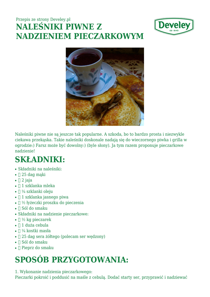 Przepis ze strony Develey.pl NALEŚNIKI PIWNE Z NADZIENIEM PIECZARKOWYM Naleśniki piwne nie są jeszcze tak popularne. A szkoda, bo to bardzo prosta i niezwykle ciekawa przekąska. Takie naleśniki doskonale nadają się do wieczornego piwka i grilla w ogrodzie:) Farsz może być dowolny:) (byle słony). Ja tym razem proponuje pieczarkowe nadzienie! SKŁADNIKI: ● ● ● ● ● ● ● ● ● ● ● ● ● ● ● Składniki na naleśniki: 25 dag mąki 2 jaja 1 szklanka mleka ¼ szklanki oleju 1 szklanka jasnego piwa ½ łyżeczki proszku do pieczenia Sól do smaku Składniki na nadzienie pieczarkowe: ½ kg pieczarek 1 duża cebula ¼ kostki masła 25 dag sera żółtego (polecam ser wędzony) Sól do smaku Pieprz do smaku SPOSÓB PRZYGOTOWANIA: 1. Wykonanie nadzienia pieczarkowego: Pieczarki pokroić i poddusić na maśle z cebulą. Dodać starty ser, przyprawić i nadziewać naleśniki piwne. Podawać z czerwonym barszczem. 2. Wykonanie naleśników: Jaja połączyć z mlekiem, piwem. Następnie dodać mąkę z proszkiem do pieczenia, wlać olej , przyprawić do smaku solą. Patelnię rozgrzać i smażyć naleśniki 3. Farsz nałożyć na naleśniki, zwinąć i ponownie podsmażyć na patelni