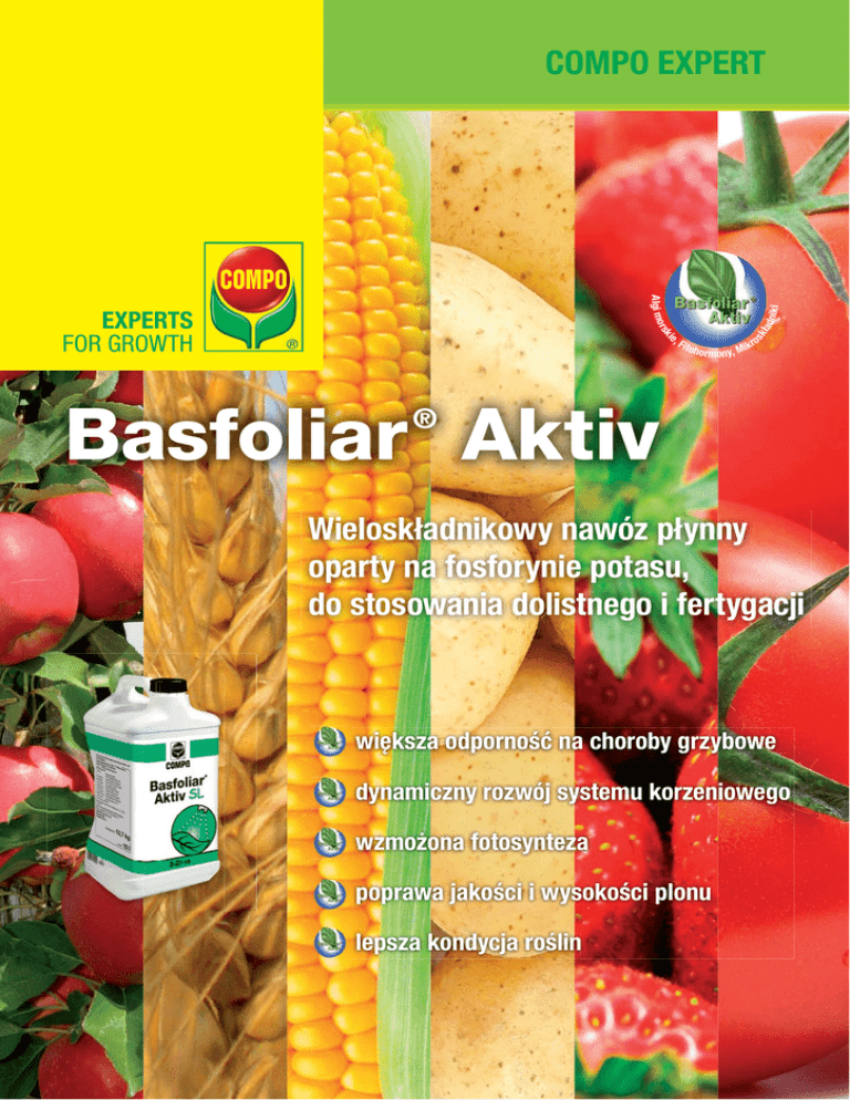 COMPO EXPERT i e, Fit sk r sk ł ad n ik i Algi mo EXPERTS FOR GROWTH ohor mony, M ik r o Basfoliar Aktiv ® Wieloskładnikowy nawóz płynny oparty na fosforynie potasu, do stosowania dolistnego i fertygacji większa odporność na choroby grzybowe dynamiczny rozwój systemu korzeniowego wzmożona fotosynteza poprawa jakości i wysokości plonu lepsza kondycja roślin COMPO EXPERT Dzięki specjalnej metodzie produkcji składniki zawarte w Basfoliar® Aktiv są łatwo i szybko pobierane przez rośliny. Zapewniają doskonały rozwój tak korzeni jak i części nadziemnej. W naturalny sposób wzmacniają odporność i witalność drzewek, krzewów i warzyw oraz poprawiają jakość plonu. Basfoliar® Aktiv może być stosowany jako nawóz dolistny oraz do fertygacji, działa tak przez liście jak i korzenie nawożonych roślin. Zalecenia dla ogrodnictwa: Uprawa Dawka na hektar Ilość dawek 2 – 3 litry 3–4 10 – 15 litrów / 1000 litrów wody 1 2 – 3 litry 1–2 od okresu przed kwitnieniem do utworzenia owoców Winorośl 2 – 3 litry 3–4 od okresu przed kwitnieniem do utworzenia owoców Ogórki 2 – 3 litry 3–4 od posadzenia co 14 dni Pomidory 2 – 3 litry 3–4 do momentu wybarwiania owoców podlewać 0,2% roztworem 1 2 litry 2–3 cały okres wegetacji 2 – 3 litry 3–4 cały okres wegetacji Drzewa i krzewy owocowe Termin stosowania po kwitnieniu do początku wybarwiania owoców 8-14 dni po sadzeniu oraz jesienią Truskawki rozsadę przed wysadzeniem Sałata Pory, cebula Rośliny ozdobne Uprawy pod osłonami: Pomidor, ogórek, papryka Opryskiwać 0,2 – 0,3% roztworem co 10 – 14 dni cały okres wegetacji Fertygacja: 5 – 7 l/ha (stężenie 0,5 – 0,7%) co 10 – 14 dni cały okres wegetacji Zalecenia mają charakter ogólny. Podstawą racjonalnego nawożenia jest analiza gleby i monitorowanie kondycji uprawy. Zalecenia dla rolnictwa: Uprawa Dawka na hektar Ilość dawek Kukurydza 1 – 2 litry 1–2 od 25 cm wzrostu, kolejna dawka po 2 tygodniach Rzepak 2 – 3 litry 1–2 od ruszenia wiosennej wegetacji 3 – 5 litrów 2–3 od 25 cm wzrostu, kolejne dawki co 10 dni 1 – 2 litry 1–2 od ruszenia wiosennej wegetacji 2 litry 2 Ziemniaki Zboża Burak cukrowy Termin stosowania po wschodach, przed zwarciem międzyrzędzi Zalecenia mają charakter ogólny. Podstawą racjonalnego nawożenia jest analiza gleby i monitorowanie kondycji uprawy. Makroskładniki: Mikroskładniki: 3% azot całkowity (N) = 41 g N/l 0,01% bor (B) = 0,137 g B/l 3% azot amidowy (N-NH2) 0,02% żelazo (Fe) = 0,27 g Fe/l 0,01% mangan (Mn) = 0,137 g Mn/l 27% fosfor (P2O5) = 370 g P2O5 /l 0,001% molibden (Mo) = 0,013 g Mo/l 0,01% cynk (Zn) = 0,137 g Zn/l 0,02% miedź (Cu) = 2,74 g Cu/l 18% potas (K 2O) = 246 g K 2O/l Basfoliar® Aktiv zawiera szeroki wachlarz hormonów roślinnych, aminokwasów, witamin oraz mikroskładników. Ciężar właściwy: 1,37 kg/l, ph - 4,1 Fitohormony: auksyna, cytokinina, giberelina, kwas indolooctowy i pochodne Aminokwasy: glicyna, alanina, walina, leucyna, izoleucyna, seryna, treonina, tyrozyna, lizyna, kwas asparaginowy, prolina i inne Dystrybucja w Witaminy: witamina A, witaminy grupy B, witamina C, witamina E Więcej informacji na stronie www.compo-expert.pl Polsce: COMPO Expert Polska sp. z o.o. pl. Wiosny Ludów 2, 61-831 Poznań tel. (61) 850-93-90, fax (61) 850-93-91 email: [email protected]