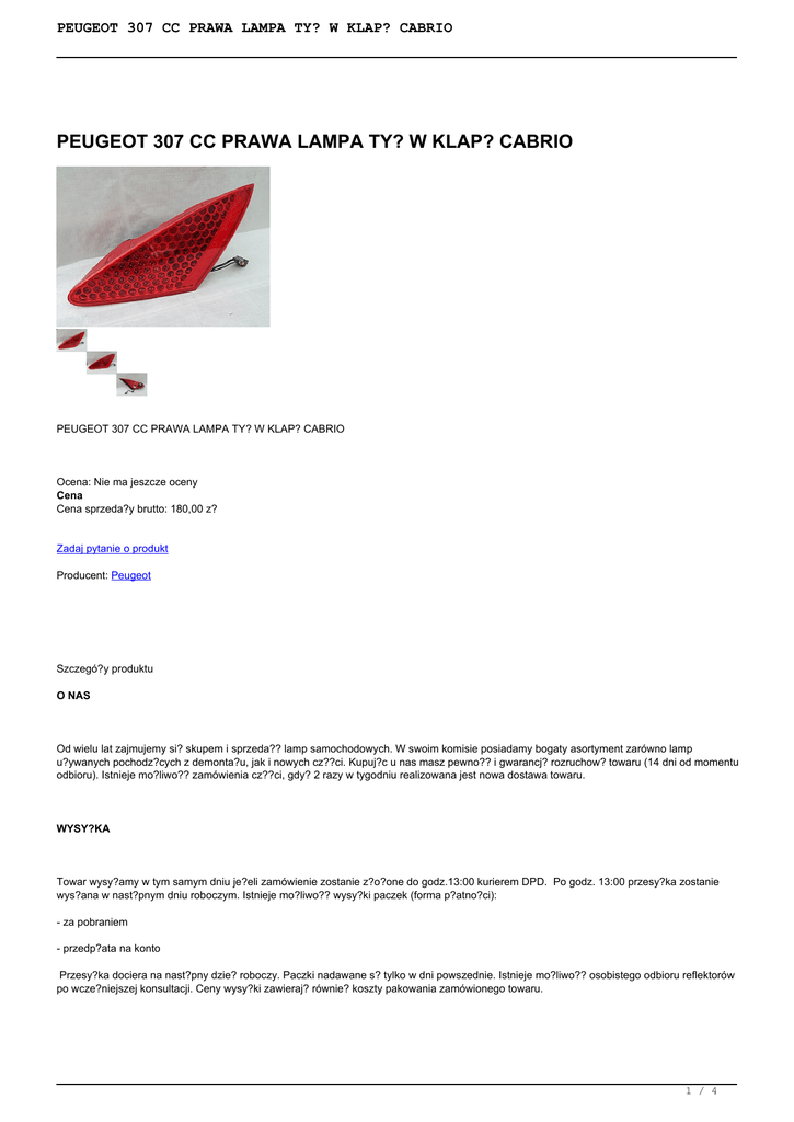 PEUGEOT 307 CC PRAWA LAMPA TY? W KLAP? CABRIO PEUGEOT 307 CC PRAWA LAMPA TY? W KLAP? CABRIO PEUGEOT 307 CC PRAWA LAMPA TY? W KLAP? CABRIO Ocena: Nie ma jeszcze oceny Cena Cena sprzeda?y brutto: 180,00 z? Zadaj pytanie o produkt Producent: Peugeot Szczegó?y produktu O NAS Od wielu lat zajmujemy si? skupem i sprzeda?? lamp samochodowych. W swoim komisie posiadamy bogaty asortyment zarówno lamp u?ywanych pochodz?cych z demonta?u, jak i nowych cz??ci. Kupuj?c u nas masz pewno?? i gwarancj? rozruchow? towaru (14 dni od momentu odbioru). Istnieje mo?liwo?? zamówienia cz??ci, gdy? 2 razy w tygodniu realizowana jest nowa dostawa towaru. WYSY?KA Towar wysy?amy w tym samym dniu je?eli zamówienie zostanie z?o?one do godz.13:00 kurierem DPD. Po godz. 13:00 przesy?ka zostanie wys?ana w nast?pnym dniu roboczym. Istnieje mo?liwo?? wysy?ki paczek (forma p?atno?ci): - za pobraniem - przedp?ata na konto Przesy?ka dociera na nast?pny dzie? roboczy. Paczki nadawane s? tylko w dni powszednie. Istnieje mo?liwo?? osobistego odbioru reflektorów po wcze?niejszej konsultacji. Ceny wysy?ki zawieraj? równie? koszty pakowania zamówionego towaru. 1 / 4 PEUGEOT 307 CC PRAWA LAMPA TY? W KLAP? CABRIO Maj? Pa?stwo prawo zwrotu zakupionego towaru w ci?gu 14 dni (ustawowo) wraz z dowodem zakupu i formularzem odst?pienia od umowy zawartym na naszej stronie : http://lampy-samochodowe.pl/media/files/Formularz_Odstapienia_OU.pdf bez podania przyczyny, zwrócimy pieni?dze- nie zwracamy jedynie kosztów wysy?ki. Nie odbieramy przesy?ek za pobraniem. ZAKUP PRZEDMIOTU PEUGEOT 307 CC PRAWA LAMPA TY? W KLAP? CABRIO Wybierz produkt i dodaj go do koszyka. Wybierz sposób zap?aty/ odbioru, uzupe?nij dane do wysy?ki Ewentualne sugestie prosz? wpisa? w polu wiadomo??. Oczekuj na kuriera- sprawd? zawarto?? przesy?ki przy odbiorze (wszystkie paczki s? ubezpieczone) . STAN MAGA MODEL/ STRON OPIS ZYNO CENA MARKA A CZ??CI WY PEUGE PRAWA TY?, W 1D-20 180,00 PLN OT 307 KLAP?, CC CABRIO, CA?A, K OMPLET NA 2004-> PARAGON/FAKTURA Do ka?dej zakupionej cz??ci do??czamy paragon . Je?li ?ycz? Pa?stwo sobie faktur?, prosimy o informacj? wraz z danymi niezb?dnymi do jej wystawienia. KONTAKT: Wszelkie zapytania prosimy kierowa? na e-mail: [email protected] 2 / 4 PEUGEOT 307 CC PRAWA LAMPA TY? W KLAP? CABRIO Wszystkie przedmioty s? dok?adnie opisane i skatalogowane. Je?li masz dodatkowe pytania prosimy o kontakt z naszym ekspertem pod nr tel.: 798-986-497 GODZINY OTWARCIA: Pracujemy od poniedzia?ku do soboty w godz. 8:00- 18:00. STRONA WWW: www.lampy-samochodowe.pl ZAMIENNIKI: Nie kupuj zamienników na innych aukcjach. S? to cz??ci o krótkiej ?ywotno?ci i s?abej jako?ci wykonania. Pos?u?? na zdecydowanie krótszy czas ni? cz??ci oryginalne, mimo, ?e s? nowe. Zakup na naszych aukcjach jest jednoznaczny z akceptacj? regulaminu dost?pnego na naszej stronie. DZI?KUJEMY ZA ZAINTERESOWANIE tel: 513-531-967 / tel: 795-785-666 naprawa lamp LED - w przypadku uszkodzenia lamp LED w samochodach osobowych - producent nie przewidzia? ingerencji w lamp? , czy wymiany uszkodzonych elementów lub przepalanego LED - ASO oferuja wymian? lamp na nowe - jednak cena nowych lamp nadal powala na kolana - oferujemy napraw? i przeróbk lamp LED - przerabiamy równie? lampy z wersji USA www.motolampy.com ?#?naprawa_lamp? ?#?lampy_samochodowe? ?#?lampy_led? ?#?naprawa_led??#?przeróbka_usa? ?#?lampy_usa? Wi?kszo?? wspó?czesnych samochodów osobowych wyposa?onych jest w lampy zbudowane w oparciu o LED. Takie lampy nie posiadaj? zwyk?ych ?arówek . Minusem tego rozwi?zania jest brak mo?liwo?ci w?asnor?cznej szybkiej wymiany uszkodzonego czy przepalonego elementu. Autoryzowane serwisy nie widza innego wyj?cia jak wymian? lampy na now? , jednak cena nowych lamp powala na kolana. Nasza firma oferuje napraw? lamp LED. Naprawiamy lampy we wszystkich modelach Mercedes , Audi , BMW - inne po uzgodnieniu 3 / 4 PEUGEOT 307 CC PRAWA LAMPA TY? W KLAP? CABRIO Przerabiamy równie? lampy z wersji USA na europ? Nie musisz wymienia? lamp na nowe - ka?d? naprawimy naprawa lamp regeneracja lamp lampy samochodowe autolampy lampy led, przeróbka lamp naprawa lamp led polerowanie reflektorów przeróbka lamp usa, lampy mercedes , naprawa reflektorów polerowanie lamp lampy ty? reflektor audi tanie lampy lampy u?ywane tuning lamp powrót Czytaj równie?: BMW e39 - opis , porady i ciekawostki Mercedes GL przeróbka lamp z USA Regeneracja reflektorów - Skoda Roomster Dlaczego regenerowa? lampy ? eXfan - lampy samochodowe - naprawa lamp 4 / 4 Powered by TCPDF (www.tcpdf.org)