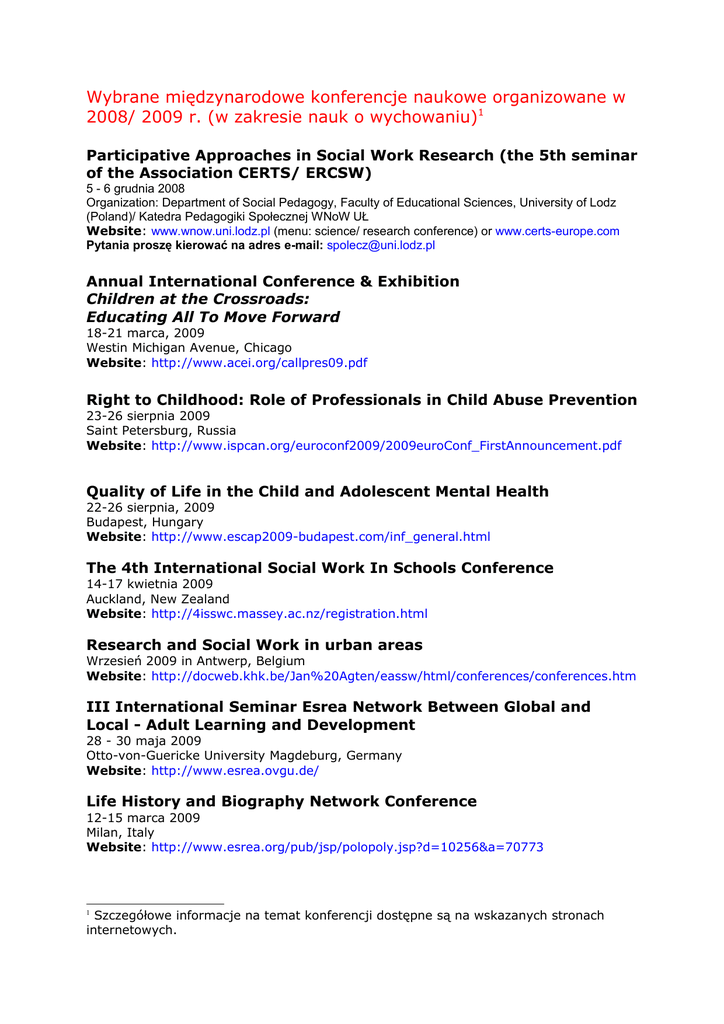 Wybrane międzynarodowe konferencje naukowe organizowane w 2008/ 2009 r. (w zakresie nauk o wychowaniu)1 Participative Approaches in Social Work Research (the 5th seminar of the Association CERTS/ ERCSW) 5 - 6 grudnia 2008 Organization: Department of Social Pedagogy, Faculty of Educational Sciences, University of Lodz (Poland)/ Katedra Pedagogiki Społecznej WNoW UŁ Website: www.wnow.uni.lodz.pl (menu: science/ research conference) or www.certs-europe.com Pytania proszę kierować na adres e-mail: [email protected] Annual International Conference & Exhibition Children at the Crossroads: Educating All To Move Forward 18-21 marca, 2009 Westin Michigan Avenue, Chicago Website: http://www.acei.org/callpres09.pdf Right to Childhood: Role of Professionals in Child Abuse Prevention 23-26 sierpnia 2009 Saint Petersburg, Russia Website: http://www.ispcan.org/euroconf2009/2009euroConf_FirstAnnouncement.pdf Quality of Life in the Child and Adolescent Mental Health 22-26 sierpnia, 2009 Budapest, Hungary Website: http://www.escap2009-budapest.com/inf_general.html The 4th International Social Work In Schools Conference 14-17 kwietnia 2009 Auckland, New Zealand Website: http://4isswc.massey.ac.nz/registration.html Research and Social Work in urban areas Wrzesień 2009 in Antwerp, Belgium Website: http://docweb.khk.be/Jan%20Agten/eassw/html/conferences/conferences.htm III International Seminar Esrea Network Between Global and Local - Adult Learning and Development 28 - 30 maja 2009 Otto-von-Guericke University Magdeburg, Germany Website: http://www.esrea.ovgu.de/ Life History and Biography Network Conference 12-15 marca 2009 Milan, Italy Website: http://www.esrea.org/pub/jsp/polopoly.jsp?d=10256&a=70773 Szczegółowe informacje na temat konferencji dostępne są na wskazanych stronach internetowych. 1 European Congress of Psychiatry - AEP 2009 24 - 28 stycznia, 2009 Lisbon , Portugal Website: http://www.kenes.com/aep/ 3rd International Conference on Psychology (Athens Institute for Education and Research) 8 – 11 czerwca, 2009 Athens, Greece Website: http://www.atiner.gr/docs/Psychology.htm 11-th European Congress of Psychology 7 – 10 lipca, 2009 Oslo, Norway Website: www.ecp2009.no XIV-th European Conference on Developmental Psychology 18 – 22 sierpnia, 2009 Vilnius, LITHUANIA Website: http://www.ecdp2009.com