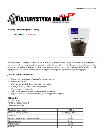 Utworzono: 2017-03-06 23:38:24 Siemię Lniane Brązowe - 200g Cena produktu: 3,90 PLN Siemię lniane działa jako osłona błony przewodu pokarmowego. Napary z siemienia lnianego są polecane osobom cierpiących na wrzody żołądka i dwunastnicy. Regularne spożywanie nasion lnu obniża poziom złego cholesterolu LDL, tym samym podnosząc poziom dobrego HDL, chroni przed występowaniem zmian miażdżycowych, a tym samym przed chorobami cywilizacyjnymi. Jakie są zalety stosowania? • • • • • • • Bogactwo nienasyconych kwasów tłuszczowych Zawartość białka Wpływa na wygląd skóry, włosów i paznokci Pomaga w utrzymaniu smukłej sylwetki Wspomaga odchudzanie Osłona na błonę śluzową przewodu pokarmowego Łagodzi objawy choroby wrzodowej oraz zapalenia żołądka Składniki: Porcja: 100 g Porcji w opakowaniu: 2 Opakowanie: 200g Wartość odżywcza Wartość energetyczna w 100 g 2131 kJ/ 509 kcal Tłuszcz 31 g W tym kwasy tłuszczowe nasycone 2,4 g Węglowodany 31 g w tym cukry 0,5 g Białko 25 g Sól 0,19 g Sposób użycia: Stosować jako napar lub jako dodatek do potraw np. sałatek. Adres: http://www.ko.sklep.pl/ Telefon: kom. 782 010 880 Email: [email protected]