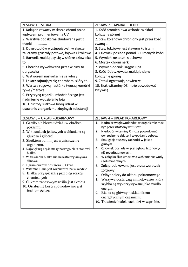 ZESTAW 1 – SKÓRA 1. Kolagen zawarty w skórze chroni przed wpływem promieniowania UV 2. Warstwa podskórna zbudowana jest z tkanki ............... 3. Do gruczołów występujących w skórze zaliczamy gruczoły potowe, łojowe i krokowe 4. Barwnik znajdujący się w skórze człowieka to ... 5. Choroba wywoływana przez wirusy to opryszczka 6. Wytworem naskórka nie są włosy 7. Lekarz zajmujący się chorobami skóry to ... 8. Wartwę rogową naskórka tworzą komórki żywe /martwe 9. Przyczyną trądziku młodzieńczego jest nadmierne wydzielanie łoju 10. Gruczoły sutkowe biorą udział w usuwaniu z organizmu zbędnych substancji ZESTAW 2 – APARAT RUCHU 1. Kość promieniowa wchodzi w skład kończyny górnej 2. Staw kolanowy chroniony jest przez kość zwaną ... 3. Staw łokciowy jest stawem kulistym 4. Człowiek posiada ponad 300 różnych kości 5. Wymień kosteczki słuchowe 6. Mostek chroni nerki 7. Wymień odcinki kręgosłupa 8. Kość łódeczkowata znajduje się w kończynie górnej 9. Zatoki ogrzewają powietrze 10. Brak witaminy D3 może powodować krzywicę ZESTAW 3 – UKŁAD POKARMOWY 1. Gardło nie bierze udziału w obróbce pokarmu. 2. W kosmkach jelitowych wchłaniane są glukoza i glicerol. 3. Skutkiem bulimi jest wyniszczenie organizmu. ZESTAW 4 – UKŁAD POKARMOWY 4. Największą część masy naszego ciała stanowi białko 5. W trawieniu białka nie uczestniczy amylaza ślinowa 6. 1 gram cukrów dostarcza 9,3 kcal 7. Witamna E nie jest rozpuszczalna w wodzie. 8. Białka przyspieszają przebieg reakcji chemicznych 9. Cukrem zapasowym roślin jest skrobia. 10. Osłabienie kości spowodowane jest brakiem żelaza. 1. Nadmiar węglowodanów w organizmie moż być przekształcony w tłuszcz. 2. Niedobór witaminy C może powodować owrzodzenie dziąseł i wypadanie zębów. 3. Emulgacja tłuszczy zachodzi w jelicie grubym. 4. Człowiek posiada więcej zębów trzonowych niż przedtrzonowych. 5. W żołądku śluz umożliwia wchłanianie wody i soli mineralnych. 6. Żółć produkowana jest przez woreczek żółciowy 7. Odbyt należy do układu pokarmowego 8. Warzywa dostarczją aminokwasów który szybko są wykorzystywane jako źródło energii. 9. Białka są głównym składnikiem energetycznym organizmu. 10. Trawienie białek zachodzi w wątrobie. ZESTAW 5 - UKŁAD POKARMOWY ZESTAW 6 – UKŁAD KRĄŻENIA 1.. Żółć produkowana w wątrobie gromadzi się w Jakich krwinek dotyczy to zdanie : ........................ a) mają zdolność poruszania się 2. Ile zębów posiada dorosły człowiek. b) w 1 ml krwi jest ich najmniej 3. Podaj dwie witaminy rozpuszczalne w wodzie. 4. Sok trzustkowy wydzielany jest do ................. c) bronią organizm przed czynnikami chorobotwórczymi 5. Kwas solny wydzielany jest w .................... d) transportują tlen i dwutlenek węgla 6. Jakiego rodzaju zębów człowiek posiada najwięcej. e) są najmniejszymi spośród wszystkich 7. Z jakiej tkanki zbudowane są mięśnie elementów morfotycznych przełyku. e) posiadają jądro komórkowe 8. Trawienie cukrów odbywa się w ...................... f) w 1 ml krwi jest ich najwięcej i w ............................. g) biorą udział w krzepnięciu krwi 9. Emulgacja tłusczów możliwa jest dzięki wydzielaniu ............ 9. Głównym składnikiem osocza krwi jest ... 10 Pepsyna jest to enzym działający w żoładku 10. Jak długo żyją erytrocyty. ZESTAW 7 – UKŁAD KRĄŻENIA Krwiobieg duży czy krwiobieg mały : • obieg płucny • w transporcie krwi uczestniczą żyły główne • rozpoczyna się w lewej komorze serca • kończy się w lewym przedsionku serca • transport pokarmu i zbędnych produktów przemiany materii • rozpoczyna się w prawej komorze serca • dostarcza tlen do narządów • w transporcie krwi uczestniczą tętnice płucne • kończy się w prawym przedsionku serca ZESTAW 8 – UKŁAD ODDECHOWY 1. Gardło odpowiada za powstawanie głosu. 2. Celem oddychania wewnątrzkomórkowego jest uwalnianie energii. 3. Płuca pokrywa cienka błona zwana osierdziem 4. Pęcherzyki płucne są oplecione przez gęstą sieć naczyń krwionośnych 5. W wyniku utleniania glukozy powstaje tlen i energia. 6. Wszystkie organizmy żywe posiadają układ oddechowy. 7. W powietrzu wydychanym znajduje się około 16% tlenu. 8. W czasie połykania wejście do dróg oddechowych zamyka nagłośnia 9. Przepona zbudowana jest z tkanki mięśniowej gładkiej 10. W procesie utleniania najczęściej zużywane są białka ZESTAW 9 - UKŁAD ODDECHOWY 1. Podczas wysiłku fizycznego organizm potrzebuje większą ilość tlenu. 2. Z 1 grama tłuszczu otrzymujemy 2 razy więcej energii niż z 1 grama białka 3. Tlen transportowany jest do wszystkich komórek przez erytrocyty. 4. Rośliny nie muszą oddychać gdyż przeprowadzają fotosyntezę. 5. Prawe płuco podzielone jest na 3 płaty. 6. Tchawica jest zbudowana z chrząstek w kształcie podkowy. 7. Człowiek posiada płuca o budowie workowatej 8. Grypa jest chorobą wirusową. 9. Pęcherzyki płucne mają elastyczne ściany i mogą zmieniać rozmiary. 10. Rak płuc jest zaraźliwy. ZESTAW 11 – NARZĄDY ZMYSŁÓW 1. Nieprawidłowe ustawienie gałek ocznych względem siebie to ... 2. ……………………………….. wyrównuje się za pomocą soczewek wklęsłych. 3. Ślimak należy do ucha ………………………………….. 4. Najwięcej czopków mieści się w plamce …………………………………. 5. Na narząd zmysłu ……………………….. składają się receptory umieszczone w skórze. 6. Przewód łączący jamę bębenkową z gardłem to ……………………………… 7. Człowiek rozpoznaje następujące smaki : słony, słodki, ………………………. i ......... 8. Receptory słuchu znajdujące się wewnątrz ślimaka to komórki …………………………… 9. Alfabet dla ludzi niewidomych został stworzony przez ……………………………. 10. Najbardzie