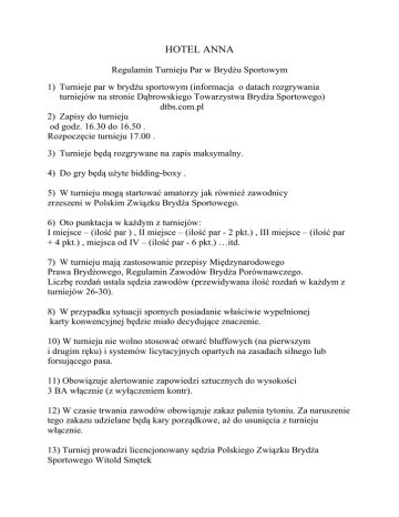 HOTEL ANNA Regulamin Turnieju Par w Brydżu Sportowym 1) Turnieje par w brydżu sportowym (informacja o datach rozgrywania turniejów na stronie Dąbrowskiego Towarzystwa Brydża Sportowego) dtbs.com.pl 2) Zapisy do turnieju od godz. 16.30 do 16.50 . Rozpoczęcie turnieju 17.00 . 3) Turnieje będą rozgrywane na zapis maksymalny. 4) Do gry będą użyte biddingboxy . 5) W turnieju mogą startować amatorzy jak również zawodnicy zrzeszeni w Polskim Związku Brydża Sportowego. 6) Oto punktacja w każdym z turniejów: I miejsce – (ilość par ) , II miejsce – (ilość par 2 pkt.) , III miejsce – (ilość par + 4 pkt.) , miejsca od IV – (ilość par 6 pkt.) …itd. 7) W turnieju mają zastosowanie przepisy Międzynarodowego Prawa Brydżowego, Regulamin Zawodów Brydża Porównawczego. Liczbę rozdań ustala sędzia zawodów (przewidywana ilość rozdań w każdym z turniejów 2630). 8) W przypadku sytuacji spornych posiadanie właściwie wypełnionej karty konwencyjnej będzie miało decydujące znaczenie. 10) W turnieju nie wolno stosować otwarć bluffowych (na pierwszym i drugim ręku) i systemów licytacyjnych opartych na zasadach silnego lub forsującego pasa. 11) Obowiązuje alertowanie zapowiedzi sztucznych do wysokości 3 BA włącznie (z wyłączeniem kontr). 12) W czasie trwania zawodów obowiązuje zakaz palenia tytoniu. Za naruszenie tego zakazu udzielane będą kary porządkowe, aż do usunięcia z turnieju włącznie. 13) Turniej prowadzi licencjonowany sędzia Polskiego Związku Brydża Sportowego Witold Smętek 14)Do punktacji długofalowej zalicza się /n1/ najlepszych wyników z danego miesiąca 15)Wręczenie nagród długofalowych połączone z zakończeniem sezonu będzie na ostatnim turnieju w grudniu /termin zostanie ogłoszony później/