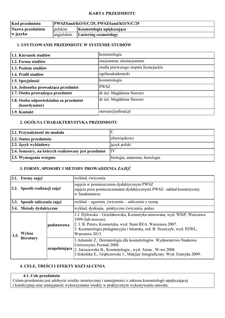 KARTA PRZEDMIOTU Kod przedmiotu Nazwa przedmiotu w języku PWSZSand/KO/S/C/29, PWSZSand/KO/N/C/29 polskim Kosmetologia upiększająca angielskim Lustering cosmetology 1. USYTUOWANIE PRZEDMIOTU W SYSTEMIE STUDIÓW 1.1. Kierunek studiów kosmetologia 1.2. Forma studiów stacjonarne, niestacjonarne 1.3. Poziom studiów studia pierwszego stopnia licencjackie 1.4. Profil studiów ogólnoakademicki 1.5. Specjalność kosmetologia 1.6. Jednostka prowadząca przedmiot 1.7. Osoba prowadząca przedmiot PWSZ 1.8. Osoba odpowiedzialna za przedmiot (koordynator) dr inż. Magdalena Stawarz 1.9. Kontakt [email protected] dr inż. Magdalena Stawarz 2. OGÓLNA CHARAKTERYSTYKA PRZEDMIOTU 2.1. Przynależność do modułu C 2.2. Status przedmiotu 2.3. Język wykładowy obowiązkowy 2.4. Semestry, na których realizowany jest przedmiot IV 2.5. Wymagania wstępne biologia, anatomia, histologia język polski 3. FORMY, SPOSOBY I METODY PROWADZENIA ZAJĘĆ 3.1. Formy zajęć wykład, ćwiczenia 3.2. Sposób realizacji zajęć zajęcia w pomieszczeniu dydaktycznym PWSZ zajęcia poza pomieszczeniami dydaktycznymi PWSZ- zakład kosmetyczny w Sandomierzu 3.3. Sposób zaliczenia zajęć wykład – egzamin, ćwiczenia – zaliczenie z oceną 3.4. Metody dydaktyczne wykład, dyskusja, praktyczne ćwiczenia, pokaz podstawowa 3.5. Wykaz literatury 1.J. Dylewska – Grzelakowska, Kosmetyka stosowana, wyd. WSiP, Warszawa 1999 (lub nowsze). 2. I. B. Peters, Kosmetyka, wyd. Stam REA, Warszawa 2007. 3. Kosmetologia pielęgnacyjna i lekarska, red. B. Noszczyk, wyd. PZWL, Warszawa 2013. 1.Adamski Z., Dermatologia dla kosmetologów. Wydawnictwo Naukowe Uniwersytet, Poznań 2008. uzupełniająca 2. Jaroszewska B., Kosmetologia , wyd. Atena , W-wa 2008. 3.Sokolska E., Grąbczewski J., Makijaż fotograficzny, Wyd. Estetyka 2009. 4. CELE, TREŚCI I EFEKTY KSZTAŁCENIA 4.1. Cele przedmiotu Celem przedmiotu jest zdobycie wiedzy teoretycznej i umiejętności z zakresu kosmetologii upiększającej i korekcyjnej oraz umiejętność wykorzystania wiedzy w praktycznym wykonywaniu zawodu. 4.2. Treści programowe 1. Historia kosmetologii upiększającej. 2. Zakres kosmetologii upiększającej. 3. Wskazania i przeciwwskazania do wykonywania zabiegów upiększających. 4. Rodzaje preparatów wykorzystywanych w zabiegach z zakresu kosmetologii upiększającej, ich prawidłowy dobór w zależności od wskazań. 5. Sposoby i metody upiększania płytki paznokciowej. 6. Zabiegi upiększające oprawę oczu. 7. Zabiegi stosowane w przypadkach głębokiego złuszczania naskórka. 8. Makijaż podstawowy. Modelowanie za pomocą podkładu i pudru. 9. Makijaż korekcyjny stosowany w przypadku defektów kosmetycznych – blizn potrądzikowych, teleangiektazji, przebarwień, asymetrii. 10. Pielęgnacja dekoltu i biustu. 4.3. Efekty kształcenia Kod W01 W02 W03 W04 U01 U02 Student, który zaliczył przedmiot Odniesienie do efektów kształcenia w zakresie WIEDZY: dla kierunku Zna podstawy analizy kolorystycznej wykorzystywanej przy K_W04 doborze makijażu. Zna mechanizm działania i skutki uboczne zabiegów K_W13 upiększających wykonywanych w gabinecie kosmetycznym. Ma wiedzę w zakresie najważniejszych problemów i zagadnień związanych z zabiegami upiększającymi oraz zna ich powiązanie K_W15 z innymi dyscyplinami naukowymi. Ma podstawową wiedzę i zna terminologię właściwą dla K_W16 kosmetologii upiększającej również w językach obcych. w zakresie UMIEJĘTNOŚCI: Posiada wystarczające umiejętności techniczne, manualne oraz predyspozycje ruchowe niezbędne do wykonywania zabiegów K_U01 upiększających. Prawidłowo posługuje się podstawowym sprzętem i aparaturą stosowaną w praktyce kosmetologa. dla obszaru M1_W01 M1_W07 M1_W09 M1_W10 M1_U01 K_U02 M1_U02 K_U04, K_U05 M1_U04, M1_U05 U03 Identyfikuje problemy klienta podejmując odpowiednie działania diagnostyczne poprawiające wygląd i stan skóry. U04 Identyfikuje błędy i zaniedbania w pracy z klientem. K_U07 M1_U07 U05 Opracowuje dokumentację dotycząca klienta i wykonywanych zabiegów upiększających. Planuje i realizacje zabiegi kosmetyczne. K_U09 M1_U09 K_U10 M1_U10 Ocenia przydatność środków, metod, form, oraz procedur niezbędnych w realizacji różnych form zabiegów upiększających. w zakresie KOMPETENCJI SPOŁECZNYCH: Ma świadomość dynamicznego rozwoju współczesnej kosmetologii – rozumie potrzebę ustawicznego doskonalenia zawodowego. K_U11 M1_U08 M1_U10 K_K01 M1_K01 K02 Wykazuje aktywność w pracach zespołowych. K_K06 M1_K04 K03 K04 Określa prawidłowo priorytety. Samodzielnie lub po konsultacjach potrafi rozwiązywać problemy związane z wykonywaniem zawodu kosmetologa. Dba o bezpieczeństwo swoje i pacjentów skutecznie stosuje właściwą ochronę. K_K07 M1_K05 M1_K06 U06 U07 K01 K05 K_K08 K_K09 M1_K07 4.4. Metody weryfikacji efektów kształcenia Forma oceny Efekt Egzamin Egzamin Zadania do Projekt Kolokwium kształcenia ustny pisemny wykonania W01 W02 W03 W04 U01 U02 U03 U04 U05 U06 U07 K01 K02 K03 K04 K05 Dyskusje Inne x x x x x x x x x x x x x x x x 4.5. Efekt kształcenia W01 - W04 U01 - U07 K01 - K05 5. Referat Sprawozdanie Kryteria jakościowe uzyskania oceny w danym zakresie efektów kształcenia ocena dostateczny/dostateczny plus dobry/ dobry plus bardzo dobry (3/ 3,5) (4/ 4,5) (5) Zna wybrane terminy zakresu Zna większość Zna wszystkie wymagane terminy kosmetologii upiększającej. terminów zakresu kosmetologii zakresu kosmetologii upiększającej. upiększającej. Potrafi wykonać niektóre Wykonuje zabiegi z zakresu Potrafi wykonać wszystkie zabiegi z zakresu kosmetologii kosmetologii upiększającej. wymagane zabiegi z zakresu upiększającej. kosmetologii upiększającej. Rozumie , ale nie zna skutków Rozumie i zna skutki stosowania Rozumie i zna skutki oraz stosowania preparatów preparatów i zabiegów z zakresu pozatechniczne aspekty i zabiegów z zakresu kosmetologii upiększającej. działalności stosowania preparatów ko