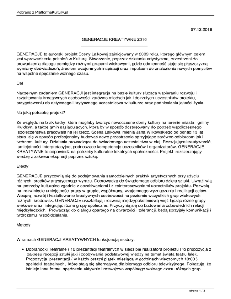 Pobrano z PlatformaKultury.pl 07.12.2016 GENERACJE KREATYWNE 2016 ____________________________ GENERACJE to autorski projekt Sceny Lalkowej zainicjowany w 2009 roku, którego głównym celem jest wprowadzenie pokoleń w Kulturę. Stworzenie, poprzez działania artystyczne, przestrzeni do prowadzenia dialogu pomiędzy różnymi grupami wiekowymi, gdzie odmienność staje się płaszczyzną wymiany doświadczeń, źródłem wzajemnych inspiracji oraz impulsem do znalezienia nowych pomysłów na wspólne spędzanie wolnego czasu. Cel Naczelnym zadaniem GENERACJI jest integracja na bazie kultury służąca wspieraniu rozwoju i kształtowaniu kreatywnych osobowości zarówno młodych jak i dojrzałych uczestników projektu, przygotowaniu do aktywnego i krytycznego uczestnictwa w kulturze oraz podniesieniu jakości życia. Na jaką potrzebę projekt? Ze względu na brak kadry, która mogłaby tworzyć nowoczesne domy kultury na terenie miasta i gminy Kwidzyn, a także gmin sąsiadujących, która by w sposób dostosowany do potrzeb współczesnego społeczeństwa pracowała na jej rzecz, Scena Lalkowa imienia Jana Wilkowskiego od ponad 13 lat stara się w sposób profesjonalny budować nowe przestrzenie sprzyjające zarówno odbiorcom jak i twórcom kultury. Działania prowadzące do świadomego uczestnictwa w niej. Rozwijające kreatywność, umiejętności interpretacyjne, podnoszące kompetencje uczestników i organizatorów. GENERACJE KREATYWNE to odpowiedź na potrzeby kulturalne lokalnych społeczności. Projekt rozszerzający wiedzę z zakresu ekspresji poprzez sztukę. Efekty GENERACJE przyczynią się do podejmowania samodzielnych praktyk artystycznych przy użyciu różnych środków artystycznego wyrazu. Doprowadzą do świadomego odbioru dzieła sztuki. Uwrażliwią na potrzeby kulturalne zgodnie z oczekiwaniami i z zainteresowaniami uczestników projektu. Pozwolą na rozwinięcie umiejętności pracy w grupie, współpracy, wzajemnego wyznaczania i realizacji celów. Wesprą rozwój i kształtowanie kreatywnych osobowości na poziomie wszystkich grup wiekowych różnych środowisk. GENERACJE ukształtują i rozwiną międzypokoleniową więź łącząc różne grupy wiekowe oraz integrując różne grupy społeczne. Przyczynią się do budowania odpowiednich relacji międzyludzkich. Prowadząc do dialogu opartego na otwartości i tolerancji, będą sprzyjały komunikacji i twórczemu współdziałaniu. Metody W ramach GENERACJI KREATYWNYCH funkcjonują moduły: Dobranocki Teatralne ( 10 prezentacji teatralnych w siedzibie realizatora projektu ) to propozycja z zakresu recepcji sztuki jaki i zdobywania podstawowej wiedzy na temat świata teatru lalek. Propozycja prezentacji ( w każdy ostatni piątek miesiąca w godzinach wieczornych 18:00 ) spektakli teatralnych, które stają się alternatywą dla biernego odbioru telewizyjnego. Pokazują, że istnieje inna forma spędzenia aktywnie i rozwojowo wspólnego wolnego czasu różnych grup strona 1 / 3 Pobrano z PlatformaKultury.pl wiekowych, innego niż przed telewizorem. Edukacja teatralna przygotowuje do odbioru sztuki przez rozwijanie wrażliwości, ukazywanie pozawerbalnych środków ekspresji, przeżywanie w wypadku dziecka razem z bohaterami ich przygód, gdzie w momentach szczególnie emocjonalnych przy boku dziadka, rodzica można bezpiecznie oddać się marzeniom. Wspólne spędzanie czasu w żywej sztuce rozwija empatię i więzi emocjonalne między rodzicami a dziećmi, dziadkami i wnukami. Dziecko stając się dorosłym będzie tęskniło za przeżyciami, które przenosiły je w zaczarowany świat bajki. Dorosły ma jedyną i niepowtarzalną okazję spojrzenia na dziecko z innej perspektywy. Układanka na cztery ręce ( 7 spotkań dedykowanych rodzinom zastępczym/siedziba Sceny Lalkowej ). Program obejmuje swoimi działaniami poznanie współczesnej literatury dla dzieci, ciekawych form teatralnych oraz i przedewszystkim niezwykle ważnych tematów społecznych takich jak: relacje w rodzinie, więzi międzypokoleniowe czy śmierć bliskiej osoby. Wyprawa do teatru oraz Teatralne czwartki to działania rozwijające umiejętności przyswajania sztuki i jej recepcji. Adresowane do dzieci i młodzieży z wiejskich środowisk, przy jednoczesnym współuczestnictwie dorosłych rodziców, dziadków, starszego rodzeństwa. Działania umożliwią „dostęp do sztuki” tym, którzy nie mają takich możliwości lub nigdy nie mieli kontaktu z teatrem z powodu miejsca zamieszkania (wieś). Teatr domowy to rodzinne warsztaty interaktywne (dzieci, rodzice, dziadkowie, opiekunowie) pełniące zarówno funkcję poznawczą jak i rozwijające umiejętności manualne uczestników. Budujące więzi pokoleniowe poprzez wspólną pracę. Warsztaty przybliżające historię Teatru Papierowego, który był salonową rozrywką XIX wieku. Powstałego w wyniku wielkiej pasji klasy średniej do teatru, literatury, muzyki, plastyki i sztuk wizualnych. Klasyka dla smyka to program oparty na cyklu warsztatów muzycznych prowadzonych metodą Batti Strauss oraz Carla Orffa. Warsztaty przybliżą uczestnikom muzykę poważną. Przygotują do świadomego korzystania ze sztuk i oraz do jej współtworzenia. Rozwiną zainteresowanie muzyką klasyczną oraz przygotują uczestników do trwałych nawyków obcowania z nią. Rozbudzą miłoś ć do muzyki i przygotują do świadomego korzystania z niej, zapewnienią możliwości pełnego rozwoju zdolności muzycznych, rozbudzą wyobraźnię i wrażliwości artystyczną. Teatr bez słów: w ramach prowadzonych zaję ć prezentowana będzie technika pantomimy, sposób ogrywania przestrzeni, praca mimiką twarzy, tworzenie etiud (krótkich scenek dramatycznych i komediowych), a także zabawy sprawnościowe. Zadaniem warsztatów jest poznanie przez uczestników powstania sztuki bez słów, twórczych działań polegających na powiększaniu wyobraźni poprzez ruch, gest, mimikę, akceptację swojego ciała i własn