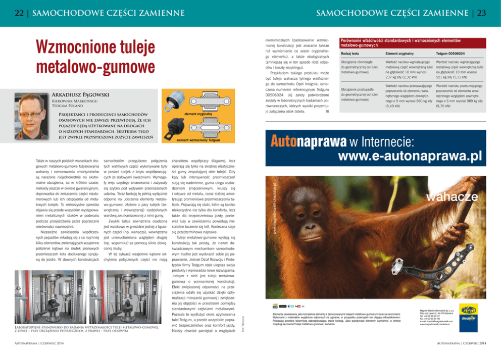22 | SAMOCHODOWE CZĘŚCI ZAMIENNE Wzmocnione tuleje metalowo-gumowe SAMOCHODOWE CZĘŚCI ZAMIENNE | 23 ekonomicznych (zastosowanie wzmocnionej konstrukcji jest znacznie tańsze niż wymienianie co sezon oryginalnego elementu), a także ekologicznych (zmniejsza się w ten sposób ilość odpadów i koszty recyklingu). Przykładem takiego produktu może być tuleja wahacza tylnego wzdłużnego do samochodu Opel Insignia, oznaczona numerem referencyjnym Tedgum 00506024. Jej zalety potwierdzone zostały w laboratoryjnych badaniach porównawczych, których wyniki prezentuje załączona obok tabela. n ELEMENT ELEMENT ORYGINALNY ORYGINALNY ELEMENT ORYGINALNY ELEMENT ORYGINALNY Arkadiusz Pągowski Także w naszych polskich warunkach drogowych metalowo-gumowe łożyskowania wahaczy i zamocowania amortyzatorów są narażone niejednokrotnie na ekstremalne obciążenia, co w krótkim czasie, niekiedy jeszcze w okresie gwarancyjnym, doprowadza do zniszczenia części elastomerowych lub ich odspojenia od metalowych tulejek. To niekorzystne zjawisko objawia się przede wszystkim występowaniem metalicznych stuków w podwoziu podczas przejeżdżania przez poprzeczne nierówności nawierzchni. Niezależne zawieszenia współczes nych pojazdów składają się z co najmniej kilku elementów zmieniających wzajemne położenie kątowe na skutek pionowych przemieszczeń koła dociskanego sprężyną do jezdni. W dawnych konstrukcjach samochodów przegubowe połączenia tych wahliwych części wykonywane były w postaci tulejek z brązu współpracujących ze stalowymi sworzniami. Wymagały więc częstego smarowania i zużywały się szybko pod wpływem przenoszonych udarów. Teraz funkcję tę pełnią wyłącznie odporne na uderzenia elementy metalowo-gumowe, złożone z pary tulejek (zewnętrznej i wewnętrznej) rozdzielonych warstwą zwulkanizowanej z nimi gumy. Zwykle tuleja zewnętrzna osadzona jest wciskowo w gnieździe jednej z łączonych części (np. wahacza), wewnętrzna jest unieruchomiona względem drugiej (np. wspornika) za pomocą silnie dokręconej śruby. W tej sytuacji wzajemne kątowe odchylenia połączonych części nie mają Laboratoryjne stanowisko do badania wytrzymałości tulei metalowo-gumowej, z lewej – przy obciążeniu poprzecznym, z prawej – przy osiowym Autonaprawa | Czerwiec 2014 ELEMENT ELEMENT WZMOCNIONY WZMOCNIONY TEDGUM TEDGUM element oryginalny ELEMENT WZMOCNIONY TEDGUM ELEMENT WZMOCNIONY TEDGUM Element oryginalny Tedgum 00506024 Obciążenie równoległe do geometrycznej osi tulei metalowo-gumowej Wartość nacisku wgniatającego metalową część wewnętrzną tulei na głębokość 10 mm wynosi 237 kg siły (2,32 kN) Wartość nacisku wgniatającego metalową część wewnętrzną tulei na głębokość 10 mm wynosi 521 kg siły (5,11 kN) Wartość nacisku przesuwającego poprzecznie oś elementu wew nętrznego względem zewnętrznego o 5 mm wynosi 560 kg siły (5,49 kN) Wartość nacisku przesuwającego poprzecznie oś elementu wew nętrznego względem zewnętrznego o 5 mm wynosi 989 kg siły (9,70 kN) Obciążenie prostopadłe do geometrycznej osi tulei metalowo-gumowej Autonaprawa w Internecie: element wzmocniony Tedgum charakteru współpracy ślizgowej, lecz opierają się tylko na skrętnej elastyczności gumy zespalającej obie tulejki. Gdy kąty lub intensywność przemieszczeń stają się nadmierne, guma ulega uszkodzeniom zmęczeniowym, kruszy się i odrywa od metalu, coraz słabiej amortyzując promieniowe przemieszczenia tulejek. Pojawiają się stuki, które są bardzo niekorzystne nie tylko dla komfortu, lecz także dla bezpieczeństwa jazdy, ponieważ luzy w zawieszeniu powodują niestabilne toczenie się kół. Konieczna staje się przedterminowa naprawa. Tuleje metalowo-gumowe wydają się konstrukcją tak prostą, że nawet doświadczonym mechanikom samochodowym trudno jest wyobrazić sobie jej poprawianie. Jednak Dział Rozwoju i Prototypów firmy Tedgum stale ulepsza swoje produkty i wprowadza nowe rozwiązania. Jednym z nich jest tuleja metalowogumowa o wzmocnionej konstrukcji. Efekt zwiększonej odporności na przeciążenia udało się uzyskać dzięki optymalizacji mieszanki gumowej i zwiększeniu jej objętości w przestrzeni pomiędzy standardowymi częściami metalowymi. Pozwala to wydłużyć okres użytkowania tulei Tedgum, a przede wszystkim poprawić bezpieczeństwo oraz komfort jazdy. Należy również pamiętać o względach Rodzaj testu www.e-autonaprawa.pl www.magnetimarelli-checkstar.pl Projektanci i producenci samochodów osobowych nie zawsze przewidują, że ich pojazdy będą użytkowane na drogach o niższych standardach. Skutkiem tego jest zwykle przyspieszone zużycie zawieszeń Fot. Tedgum Kierownik Marketingu Tedgum Poland Porównanie właściwości standardowych i wzmocnionych elementów metalowo-gumowych Elementy zawieszenia, jako kompletne elementy z zamocowanymi tulejami metalowo-gumowymi oraz ze sworzniami. Wykonane z materiałów wyjątkowo odpornych na zginanie, w przypadku przeciążeń nie ulegają odkształceniom. Posiadają powłokę lakierniczą zabezpieczającą przed korozją. Jako pojedyncze elementy wymienne, w ofercie znajdują się również tuleje metalowo-gumowe i sworznie. wahacze Magneti Marelli Aftermarket Sp. z o.o. Plac pod Lipami 5, 40-476 Katowice Tel. +48 32 60 36 107 Fax +48 32 60 36 108 e-mail: [email protected] www.magnetimarelli-checkstar.pl Autonaprawa | Czerwiec 2014