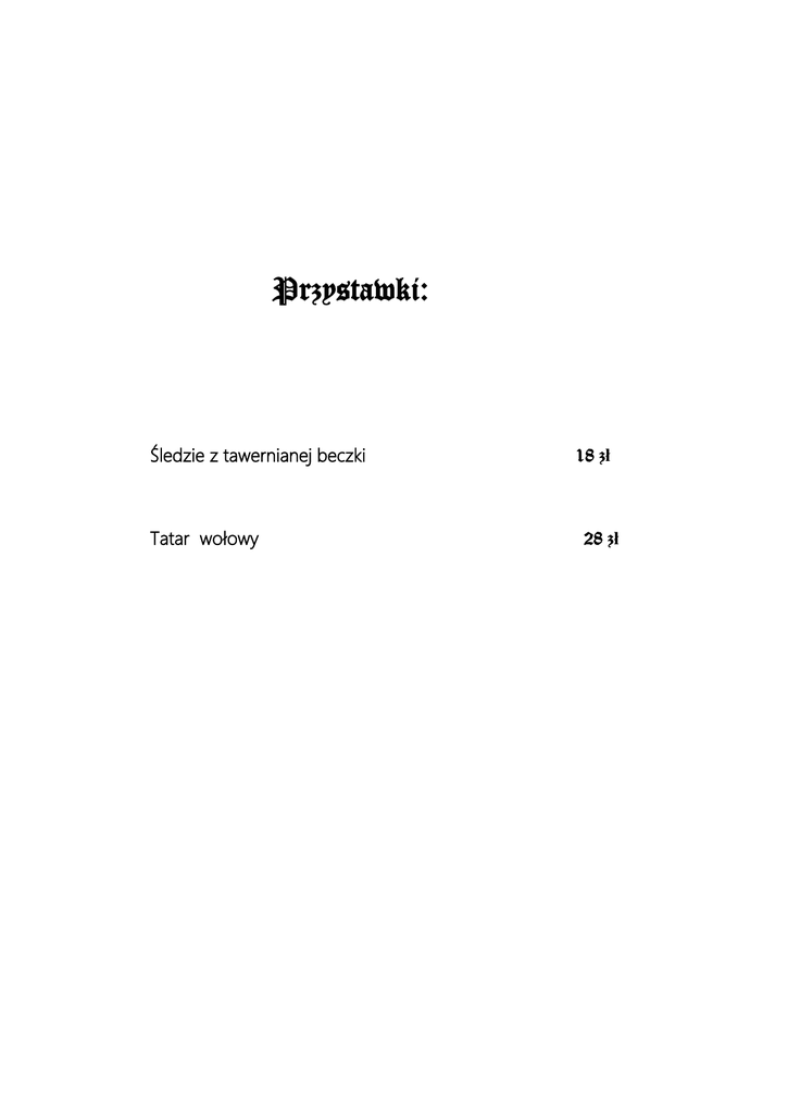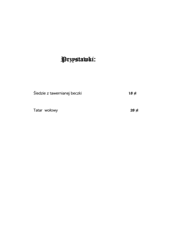 Przystawki: Śledzie z tawernianej beczki Tatar wołowy 18 zł 28 zł Zupy: Zupa rybna (łagodna lub na ostro) 19 zł Rosół z zagrodowej kaczki z domowym makaronem ( serwowany w niedzielę ) 10 zł Dania główne: Ryby : Troć wędrowna z warzywami podane z bosmańskimi pieczonymi ziemniaczkami 33 zł Filet z jesiotra podany na kapuście zasmażanej z bosmańskimi pieczonymi ziemniaczkami 38 zł Pstrąg świeżo złowiony przez rybaka z bosmańskimi pieczonymi ziemniaczkami 35 zł Pierogi z farszem z naszych ryb 14 zł Stek z antrykotu, rosbeafu (z dojrzewającej polskiej wołowiny) z pieczonymi ziemniaczkami i warzywami 39 zł Stek z kością - Tony Hawk (800g-1200g - dojrzewająca wołowina) z sosem, domowymi frytkami i sałatami (danie dla 2 osób) 13 zł/100 g (steka) Policzki wołowe z kluskami i kapustą czerwoną 25 zł Drób : Roladki drobiowe nadziewane suszonymi pomidorami, serem pleśniowym podane z domowymi frytkami (własny wyrób), sosem białym i mixem sałat 27 zł Wieprzowina : Grillowana polędwiczka wieprzowa z kluseczkami z sosem maślanym i sałatką 31 zł Schabowy zapiekany z warzywami podany na ziemniakach z wody i sałatami 20 zł Stek z karczku podany z cebulą i pieczarkami na pieczonych ziemniakach 25 zł Sałatki: Pieczona polędwiczka wieprzowa z kukurydzą, ogórkiem, pomidorem, serem żółtym 21 zł Mix sałat z pomidorkami koktajlowymi i grillowaną piersią z kurczaka 21 zł Dania dla dzieci: Filet z kurczaka w panierce Panco z frytkami 12 zł Desery: Tiramisu 14 zł Mus z mango podany z owocami sezonowymi 14 zł Kawa mrożona podana z bitą śmietaną 12 zł Dodatki: Pieczywo własnego wypieku z masłem smakowym (zapytaj obsługę o smak dnia) 5 zł Frytki domowe (wyrób własny) 6 zł Insalata (mix sałat) z sosem winegret 8 zł