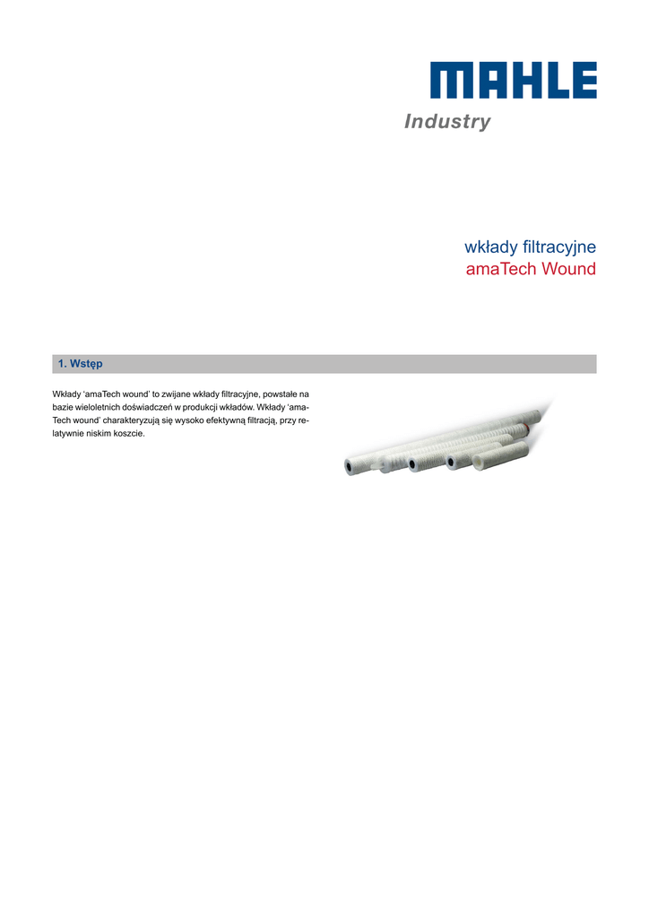 wkłady filtracyjne amaTech Wound 1. Wstęp Wkłady ‘amaTech wound’ to zwijane wkłady filtracyjne, powstałe na bazie wieloletnich doświadczeń w produkcji wkładów. Wkłady ‘amaTech wound’ charakteryzują się wysoko efektywną filtracją, przy relatywnie niskim koszcie. 2. Charakterystyka 3. Odporność chemiczna Wysokiej jakości materiał włókna Duży zakres odporności chemicznej Selektywności nominalne od 1 to 150 mikronów 4 rodzaje materiału rdzeni Długość wkładu od 5 do 70 cali Materiał filtracyjn spełnia wymogi FDA do produkcji napojów i dla przemysłu spożywczego Odporność chemiczna Zastosowania Bawełna Polipropylen Produkcja spożywcza Produkcja napojów Produkcja napojów Rozpuszczalniki organiczne Oleje +++ +++ +++ +++ +++ +++ +++ +++ ++ +++ Kwasy organiczne Roztwory zasadowe Roztwory utleniające Para Mocne kwasy Rozcieńczone kwasy mikroorganizmy ++ ++ + NR NR + - +++ +++ ++ NR +++ +++ +++ +++=doskonała, ++=bardzo dobra, +=dobra, -=słaba, NR=nie zalecane 4. Specyfikacja Produktu Materiał przegrody filtracyjnej Rdzeń wkładu Wymiary Średnica zewnętrzna Długość Powierzchnia filtracyjna : bawełna bielona, polipropylen lub dodatkowo płukany polipropylen : polipropylen, stal cynowana, stal nierdzewna 304 lub stal nierdzewna 316 : 64 mm : zobacz tabelę kodowania : 0.05 m²/10” wkład Maksymalna zalecana różnica ciśnień 2.5 bar Maksymalna temperatura pracy Dla rdzeni metalowych : 90 °C dla przegrody z polipropylenu 135 °C dla przegrody z bawełny Dla rdzeni polipropylenowych : 60 °C Gwarancja bezpieczeństwa Wkłady filtracyjne spełniają wymogi przepisów FDA 21CFR177 do produkcji napojów i dla przemysłu spożywczego. Wkład filtracyjny amaTech wound 2 5. Przepływy dla wody Wkład amaTech 10" UE/PW Wkład amaTech 10" CE x=Przepływ y=Spadek ciśnienia na czystym filtrze Wkład filtracyjny amaTech wound 3 6. Kodowanie Przykład amaTech UE Rodzaj wkładu CE = Bielona bawełna UE = polipropylen PW = Polipropylen dodatkowo płukany 5 20 U Selektywność [µm] 1, 3, 5, 10, 15, 20, 30, 50, 70, 100, 150 Długośc nominalna [inch] 5 (127 mm) 29.25 (743 mm) 9.75 (248 mm) 30 (762 mm) 10 (254 mm) 39.5 (1003 mm) 19.5 (495 mm) 40 (1016 mm) 20 (508 mm) Inne długości na życzenie Rdzeń wewnętrzny A = Stal nierdzewna 304 T = Ocynkowana stal S = Stal nierdzewna 316 U = polypropylene Typ końcówki Bez symbolu=DOE, Bez uszczelki X1=Wydłużony rdzeń wewnętrzny (Tylko dla rdzeni metalowych) MAHLE Filtracja Przemysłowa Sp.z o.o. Ślężna 146/148 , 53-111 Wrocław Poland Phone: +48 71 33 71 888 Fax: +48 71 33 71 547 [email protected] http://www.mahle-industrialfiltration.com 04/2012 Wkład filtracyjny amaTech wound 4