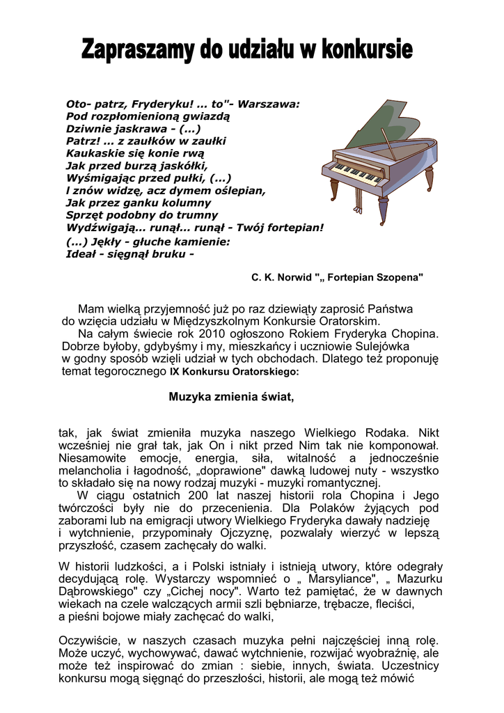 Oto- patrz, Fryderyku! ... to"- Warszawa: Pod rozpłomienioną gwiazdą Dziwnie jaskrawa - (...) Patrz! ... z zaułków w zaułki Kaukaskie się konie rwą Jak przed burzą jaskółki, Wyśmigając przed pułki, (...) l znów widzę, acz dymem oślepian, Jak przez ganku kolumny Sprzęt podobny do trumny Wydźwigają... runął... runął - Twój fortepian! (...) Jękły - głuche kamienie: Ideał - sięgnął bruku C. K. Norwid "„ Fortepian Szopena" Mam wielką przyjemność już po raz dziewiąty zaprosić Państwa do wzięcia udziału w Międzyszkolnym Konkursie Oratorskim. Na całym świecie rok 2010 ogłoszono Rokiem Fryderyka Chopina. Dobrze byłoby, gdybyśmy i my, mieszkańcy i uczniowie Sulejówka w godny sposób wzięli udział w tych obchodach. Dlatego też proponuję temat tegorocznego IX Konkursu Oratorskiego: Muzyka zmienia świat, tak, jak świat zmieniła muzyka naszego Wielkiego Rodaka. Nikt wcześniej nie grał tak, jak On i nikt przed Nim tak nie komponował. Niesamowite emocje, energia, siła, witalność a jednocześnie melancholia i łagodność, „doprawione" dawką ludowej nuty - wszystko to składało się na nowy rodzaj muzyki - muzyki romantycznej. W ciągu ostatnich 200 lat naszej historii rola Chopina i Jego twórczości były nie do przecenienia. Dla Polaków żyjących pod zaborami lub na emigracji utwory Wielkiego Fryderyka dawały nadzieję i wytchnienie, przypominały Ojczyznę, pozwalały wierzyć w lepszą przyszłość, czasem zachęcały do walki. W historii ludzkości, a i Polski istniały i istnieją utwory, które odegrały decydującą rolę. Wystarczy wspomnieć o „ Marsyliance", „ Mazurku Dąbrowskiego" czy „Cichej nocy". Warto też pamiętać, że w dawnych wiekach na czele walczących armii szli bębniarze, trębacze, fleciści, a pieśni bojowe miały zachęcać do walki, Oczywiście, w naszych czasach muzyka pełni najczęściej inną rolę. Może uczyć, wychowywać, dawać wytchnienie, rozwijać wyobraźnię, ale może też inspirować do zmian : siebie, innych, świata. Uczestnicy konkursu mogą sięgnąć do przeszłości, historii, ale mogą też mówić o sobie i o „dzisiaj". Na przykład o tym, jak odkryli muzykę Niemena czy Procol Harum i co to im dało. Albo, jak zmieniło się ich spojrzenie na dzieje XX wieku po obejrzeniu musikalu „ Hair", Dla niektórych przełomem mogła być wizyta w filharmonii, operze lub przeciwnie udział w koncercie rockowym czy havy metalowym. A może ktoś „ zabłysnął" jako szkolny raper lub wykonawca free style’ owy ? Napiszcie i opowiedzcie, jak pod wpływem muzyki zmienił się Wasz świat czy też Wy sami. A więc do dzieła ! Zapraszam do wzięcia udziału w IX Konkursie Oratorskim! Regulamin Konkursu. 1. Zgłoszenia uczestników wraz z nazwiskiem opiekuna przesyłamy do końca marca b.r. 2. Rozstrzygnięcie konkursu odbędzie się w maju w budynku Gimnazjum nr 2 w Sulejówku, Dokładny termin zostanie podany w późniejszym czasie. 3. Opiekun każdej grupy uczniów - uczestników jest jednocześnie członkiem jury. 4. Uczestnicy konkursu są zobowiązani do samodzielnego napisania przemówienia i wygłoszenia go w obecności innych uczniów i nauczycieli. 5. Jury wyłoni laureatów IX Konkursu Oratorskiego biorąc pod uwagę zgodność przemówienia z tematem, jego spójność i logikę, poprawność językową, dykcję, pamięciowe opanowanie tekstu, respektowanie zasad sztuki oratorskiej i. ewentualnie elementy gry aktorskiej. 6. Sposób prezentacji zależy od inwencji mówców. Można, na przykład pokusić się o zaprezentowanie fragmentu utworu muzycznego, ucharakteryzować się czy wykorzystać konkretne przedmioty. 7. Czas występu nie może przekroczyć 5 minut. 8. Fundatorem nagród jest Urząd Miasta Sulejówek. Do udziału w Konkursie zaprasza oraz udziela wszelkich informacji Halina Zagańczyk, Gimnazjum nr 2 w Sulejówku