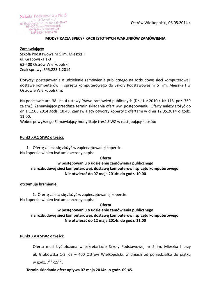 Ostrów Wielkopolski, 06.05.2014 r. MODYFIKACJA SPECYFIKACJI ISTOTNYCH WARUNKÓW ZAMÓWIENIA Zamawiający: Szkoła Podstawowa nr 5 im. Mieszka I ul. Grabowska 1-3 63-400 Ostrów Wielkopolski Znak sprawy: SP5.223.1.2014 Dotyczy: postępowania o udzielenie zamówienia publicznego na rozbudowę sieci komputerowej, dostawę komputerów i sprzętu komputerowego do Szkoły Podstawowej nr 5 im. Mieszka I w Ostrowie Wielkopolskim. Na podstawie art. 38 ust. 4 ustawy Prawo zamówień publicznych (Dz. U. z 2010 r. Nr 113, poz. 759 ze zm.), Zamawiający przedłuża termin składania ofert ww. postępowaniu. Oferty należy złożyć do dnia 12.05.2014 godz. 10:45. Zamawiający otworzy koperty z ofertami w dniu 12.05.2014 o godz. 11:00. Wobec powyższego Zamawiający modyfikuje treść SIWZ w następujący sposób: Punkt XV.1 SIWZ o treści: 1. Ofertę zaleca się złożyć w zapieczętowanej kopercie. Na kopercie winien być umieszczony napis: Oferta w postępowaniu o udzielenie zamówienia publicznego na rozbudowę sieci komputerowej, dostawę komputerów i sprzętu komputerowego. Nie otwierać do 07 maja 2014r. do godz. 10.00 otrzymuje brzmienie: 1. Ofertę zaleca się złożyć w zapieczętowanej kopercie. Na kopercie winien być umieszczony napis: Oferta w postępowaniu o udzielenie zamówienia publicznego na rozbudowę sieci komputerowej, dostawę komputerów i sprzętu komputerowego. Nie otwierać do 12 maja 2014r. do godz. 11.00 Punkt XV.4 SIWZ o treści: Oferta musi być złożona w sekretariacie Szkoły Podstawowej nr 5 im. Mieszka I przy ul. Grabowska 1-3, 63 – 400 Ostrów Wielkopolski, w dniach od poniedziałku do piątku w godz. 730 -1530 . Termin składania ofert upływa 07 maja 2014r. o godz. 09:45. Punkt XV.4 otrzymuje brzmienie: Oferta musi być złożona w sekretariacie Szkoły Podstawowej nr 5 im. Mieszka I przy ul. Grabowska 1-3, 63 – 400 Ostrów Wielkopolski, w dniach od poniedziałku do piątku w godz. 730 -1530 . Termin składania ofert upływa 12 maja 2014r. o godz. 10:45. Punkt XV.9 SIWZ o treści: Otwarcie ofert nastąpi w dniu 07 maja 2014r. o godz. 10:00 w siedzibie zamawiającego. Punkt XV.9 otrzymuje brzmienie: Otwarcie ofert nastąpi w dniu 12 maja 2014r. o godz. 11:00 w siedzibie zamawiającego. Załącznik nr 1 do SIWZ – Szczegółowy opis przedmiotu zamówienia. Punkt 3 o treści: Zestaw komputerów stacjonarnych z oprogramowaniem – 22 sztuk (opis podany w tabeli). Wszystkie zestawy komputerowe oraz monitory powinny mieć identyczne parametry i pochodzić od jednego producenta. Punkt 3 otrzymuje brzmienie: Zestaw komputerów stacjonarnych z oprogramowaniem – 22 sztuk (opis podany w tabeli). Wszystkie zestawy komputerowe powinny mieć identyczne parametry i pochodzić od jednego producenta. Wszystkie monitory powinny mieć identyczne parametry i pochodzić od jednego producenta. W załączniku nr 7 do SIWZ – mapki poglądowe. Zamawiający modyfikuje załącznik nr 7 do SIWZ. Zmodyfikowany załącznik umieszcza na stronie internetowej http://sp5.osw.pl/zamowienia-publiczne/. Z poważaniem