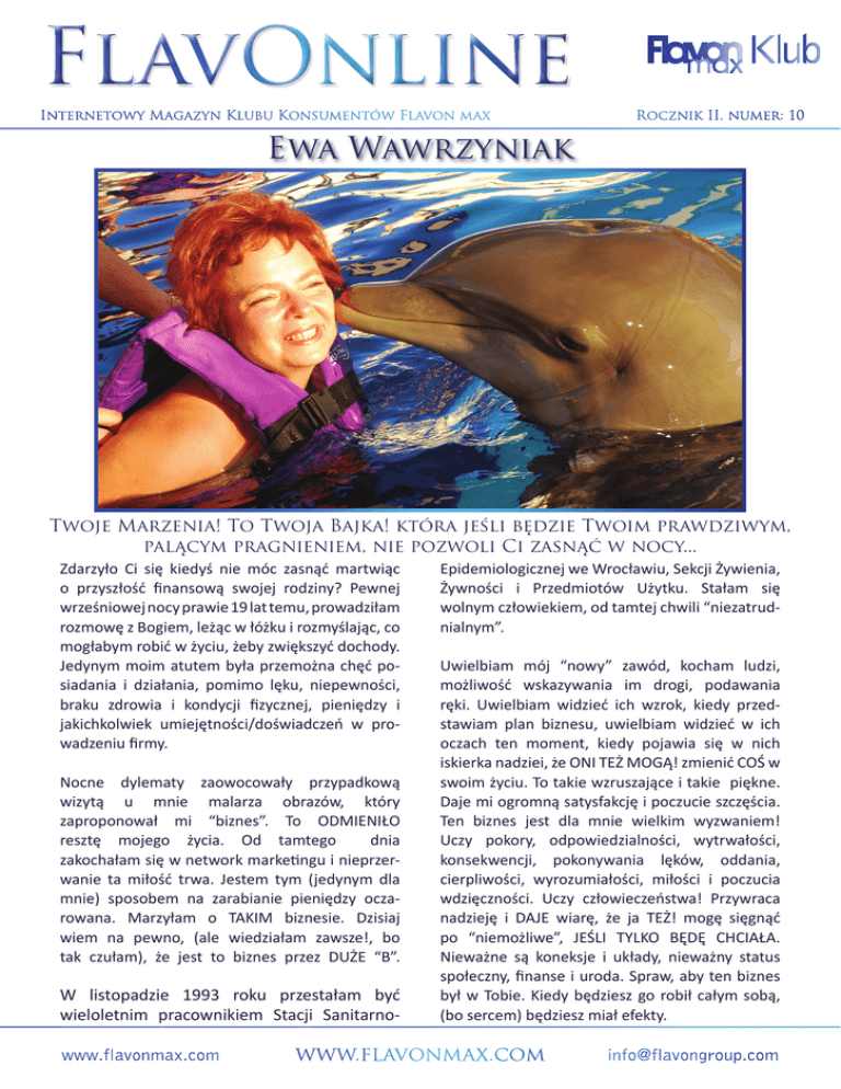 FlavOnline Internetowy Magazyn Klubu Konsumentów Flavon max Rocznik II. numer: 10 Ewa Wawrzyniak Twoje Marzenia! To Twoja Bajka! która jeśli będzie Twoim prawdziwym, palącym pragnieniem, nie pozwoli Ci zasnąć w nocy... Zdarzyło Ci się kiedyś nie móc zasnąć martwiąc o przyszłość finansową swojej rodziny? Pewnej wrześniowej nocy prawie 19 lat temu, prowadziłam rozmowę z Bogiem, leżąc w łóżku i rozmyślając, co mogłabym robić w życiu, żeby zwiększyć dochody. Jedynym moim atutem była przemożna chęć posiadania i działania, pomimo lęku, niepewności, braku zdrowia i kondycji fizycznej, pieniędzy i jakichkolwiek umiejętności/doświadczeń w prowadzeniu firmy. Nocne dylematy zaowocowały przypadkową wizytą u mnie malarza obrazów, który zaproponował mi “biznes”. To ODMIENIŁO resztę mojego życia. Od tamtego dnia zakochałam się w network marketingu i nieprzerwanie ta miłość trwa. Jestem tym (jedynym dla mnie) sposobem na zarabianie pieniędzy oczarowana. Marzyłam o TAKIM biznesie. Dzisiaj wiem na pewno, (ale wiedziałam zawsze!, bo tak czułam), że jest to biznes przez DUŻE “B”. W listopadzie 1993 roku przestałam być wieloletnim pracownikiem Stacji Sanitarno- Epidemiologicznej we Wrocławiu, Sekcji Żywienia, Żywności i Przedmiotów Użytku. Stałam się wolnym człowiekiem, od tamtej chwili “niezatrudnialnym”. Uwielbiam mój “nowy” zawód, kocham ludzi, możliwość wskazywania im drogi, podawania ręki. Uwielbiam widzieć ich wzrok, kiedy przedstawiam plan biznesu, uwielbiam widzieć w ich oczach ten moment, kiedy pojawia się w nich iskierka nadziei, że ONI TEŻ MOGĄ! zmienić COŚ w swoim życiu. To takie wzruszające i takie piękne. Daje mi ogromną satysfakcję i poczucie szczęścia. Ten biznes jest dla mnie wielkim wyzwaniem! Uczy pokory, odpowiedzialności, wytrwałości, konsekwencji, pokonywania lęków, oddania, cierpliwości, wyrozumiałości, miłości i poczucia wdzięczności. Uczy człowieczeństwa! Przywraca nadzieję i DAJE wiarę, że ja TEŻ! mogę sięgnąć po “niemożliwe”, JEŚLI TYLKO BĘDĘ CHCIAŁA. Nieważne są koneksje i układy, nieważny status społeczny, finanse i uroda. Spraw, aby ten biznes był w Tobie. Kiedy będziesz go robił całym sobą, (bo sercem) będziesz miał efekty. www.flavonmax.com www.flavonmax.com [email protected] FlavOnline Służąc innym, dając im najlepszą siebie, każdego dnia, czynię siebie silniejszą i odporniejszą. Staję się źródłem mocy tak bardzo potrzebnej innym i mnie samej:-). Stałam się DIAMENTEM w marcu 2008 roku (jako kobieta! pierwszym w Polsce! i trzecim w kraju po wspaniałych i ukochanych moich sponsorach Zbyszku i Rysiu). To był dla mnie wielki dzień tak bardzo przeze mnie upragniony i wymarzony. Wiedząc jednak, że jeśli nie idziesz do przodu to się cofasz, zrobiłam Diamenta Plusa i dzisiaj spokojnym, pewnym wzrokiem patrzę w kierunku Prezydenta oczywiście, Prezydenta Plus :) Jednak najpiękniejszym dla mnie przywilejem i darem w tym biznesie jest poznawanie LUDZI, wspaniałych, cudownych, tak różnych, możliwość doświadczania ich wzruszeń i emocji, ich sukcesów: zarówno mojej górnej linii sponsorowania jak i linii dolnej. Są wspaniali, wyjątkowi, nieprzeciętni. To moi przyjaciele. Uczę się od nich każdego dnia. Są moją motywacją, inspiracją i natchnieniem. Są moim życiem. Kilku z nich poświęciłam kawał mojego życia. Byłam przy nich, kiedy mnie potrzebowali w radości i smutku, w ciągu dnia, o północy i nad ranem… Pamiętasz chińskie drzewo bambusowe? Pielęgnujesz je z miłością i oddaniem przez długie dni i miesiące, a efekt jest widoczny dopiero po pięciu latach. Ale warto było. Widok jest przepiękny, „drzewo” rośnie z cudowną prędkością, zdrowe i okazałe, piękne. Jestem z nich bardzo dumna. To moje „ukochane dzieci biznesowe”, dzisiaj bardzo samodzielni, wielcy i wspaniali. Piotr jest Diamentem Plusem, Anna Diamentem oboje w drodze do Prezydenta. Mają wspaniałe grupy, czego kochani, serdecznie Wam GRATULUJĘ. Mam oczywiście jeszcze inne „ukochane maluchy” w grupie, które otaczam troskliwą opieką :) wiedząc, że czas działa na ich i moją korzyść. Ja Jestem cierpliwa!! A Ty? Tak się jakoś składa, że jest we mnie ogromna wiara w ludzi. W ich potencjał i w ich możliwości. Widzę w nich więcej niż oni dostrzegają w sobie. Widzę w nich orłów. Uwielbiam patrzeć jak wzrastają jak idą do przodu pomimo przeciwności i zawirowań, które przecież po to są żeby je pokonywać. Kocham ten biznes, kocham Flawon i całą rodzinę Gaalów. Cokolwiek robicie kochani, każdy Wasz gest, przepełniony jest miłością, mądrością i wielkim oddaniem, tak bardzo to czuję i tak bardzo szanuję i cenię. Jest to dla mnie bardzo ważne, bo daje mi poczucie spokoju, bezpieczeństwa i stabilizacji. Emanujecie harmonijnym życiem rodzinnym, co jest wartością nie do przecenienia. Serdecznie Wam dziękuję, żarliwym oddanym sercem, za stworzenie mi możliwości wzrastania w atmosferze zaufania, nadziei, miłości i wiary. Dziękuję również za możliwość realizacji moich marzeń. Moja wyprowadzona w grudniu z salonu BMW-uszka 520 d, czarna i śliczna, zauroczyła mnie swoimi oczkami już w 2006 roku. Nie miałam wtedy pojęcia, w jaki sposób wejdę w jej posiadanie. Cudownym spełnieniem był również mój wyjazd na Karaiby do Cancun, na co czekałam 10 lat, egzotyczne morze, niebo, plaża, przepiękny kurort - przepych i elegancja, czyli to, co uwielbiam. I spotkanie z delfinem. Nigdy tego nie zapomnę, a emocje były tak silne, że flesz uwiecznił przepływającą między nami energię (niektórzy nazywają ją aniołem). Ten maleńki flawonik ma TAKĄ SIŁĘ, że odmienia nasze życie. Proszę Cię, pamiętaj – „Małe rzeczy stają się WIELKIE, dzięki dotykowi miłości i uwielbienia” Kocham całą moją grupę, moich sponsorów i zał