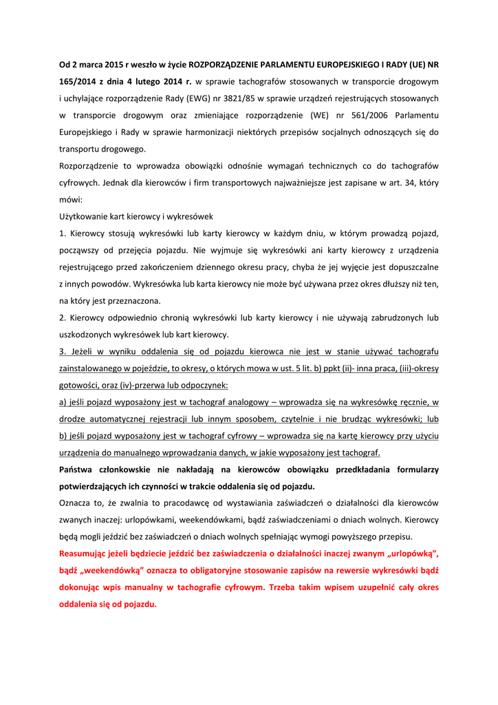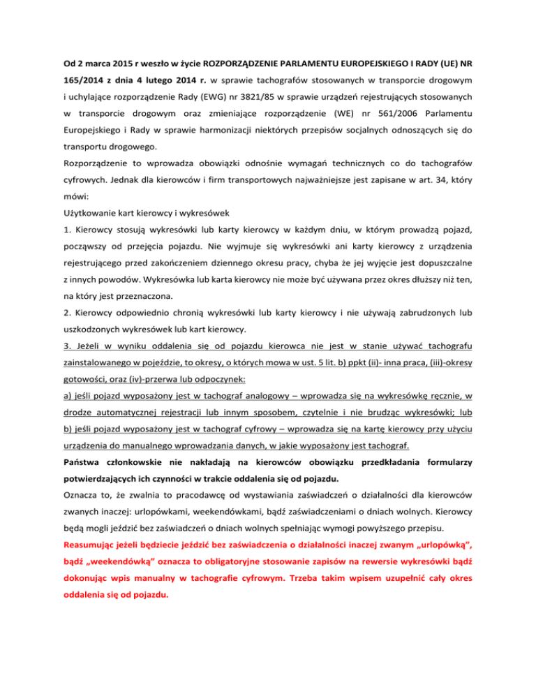 Od 2 marca 2015 r weszło w życie ROZPORZĄDZENIE PARLAMENTU EUROPEJSKIEGO I RADY (UE) NR 165/2014 z dnia 4 lutego 2014 r. w sprawie tachografów stosowanych w transporcie drogowym i uchylające rozporządzenie Rady (EWG) nr 3821/85 w sprawie urządzeń rejestrujących stosowanych w transporcie drogowym oraz zmieniające rozporządzenie (WE) nr 561/2006 Parlamentu Europejskiego i Rady w sprawie harmonizacji niektórych przepisów socjalnych odnoszących się do transportu drogowego. Rozporządzenie to wprowadza obowiązki odnośnie wymagań technicznych co do tachografów cyfrowych. Jednak dla kierowców i firm transportowych najważniejsze jest zapisane w art. 34, który mówi: Użytkowanie kart kierowcy i wykresówek 1. Kierowcy stosują wykresówki lub karty kierowcy w każdym dniu, w którym prowadzą pojazd, począwszy od przejęcia pojazdu. Nie wyjmuje się wykresówki ani karty kierowcy z urządzenia rejestrującego przed zakończeniem dziennego okresu pracy, chyba że jej wyjęcie jest dopuszczalne z innych powodów. Wykresówka lub karta kierowcy nie może być używana przez okres dłuższy niż ten, na który jest przeznaczona. 2. Kierowcy odpowiednio chronią wykresówki lub karty kierowcy i nie używają zabrudzonych lub uszkodzonych wykresówek lub kart kierowcy. 3. Jeżeli w wyniku oddalenia się od pojazdu kierowca nie jest w stanie używać tachografu zainstalowanego w pojeździe, to okresy, o których mowa w ust. 5 lit. b) ppkt (ii)- inna praca, (iii)-okresy gotowości, oraz (iv)-przerwa lub odpoczynek: a) jeśli pojazd wyposażony jest w tachograf analogowy – wprowadza się na wykresówkę ręcznie, w drodze automatycznej rejestracji lub innym sposobem, czytelnie i nie brudząc wykresówki; lub b) jeśli pojazd wyposażony jest w tachograf cyfrowy – wprowadza się na kartę kierowcy przy użyciu urządzenia do manualnego wprowadzania danych, w jakie wyposażony jest tachograf. Państwa członkowskie nie nakładają na kierowców obowiązku przedkładania formularzy potwierdzających ich czynności w trakcie oddalenia się od pojazdu. Oznacza to, że zwalnia to pracodawcę od wystawiania zaświadczeń o działalności dla kierowców zwanych inaczej: urlopówkami, weekendówkami, bądź zaświadczeniami o dniach wolnych. Kierowcy będą mogli jeździć bez zaświadczeń o dniach wolnych spełniając wymogi powyższego przepisu. Reasumując jeżeli będziecie jeździć bez zaświadczenia o działalności inaczej zwanym „urlopówką”, bądź „weekendówką” oznacza to obligatoryjne stosowanie zapisów na rewersie wykresówki bądź dokonując wpis manualny w tachografie cyfrowym. Trzeba takim wpisem uzupełnić cały okres oddalenia się od pojazdu.