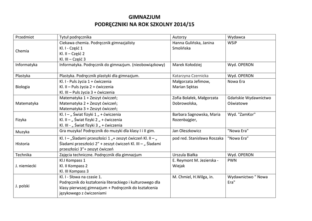 GIMNAZJUM PODRĘCZNIKI NA ROK SZKOLNY 2014/15