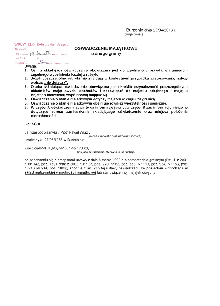 Burzenin dnia 29/04/2016 r. (miejscowość) WPŁYNĘŁO-Sckretc1ri:::t Ur;:9du Nr ewid . .. ........ . .... ...................... Data .. .. .. . . llotć za Podpis . 2.9..U4.. ...7.o16..................... OŚWIADCZENIE MAJĄTKOWE radnego gminy ,.,,- .............................. 9m........................ . . ... Uwaga. 1. Os a składająca oświadczenie obowiązana jest do zgodnego z prawdą, starannego i zupełnego wypełnienia każdej z rubryk. 2. Jeżeli poszczególne rubryki nie znajdują w konkretnym przypadku zastosowania, należy wpisać nie dotyczy". 3. Osoba składająca oświadczenie obowiązana jest określić przynależność poszczególnych składników majątkowych, dochodów i zobowiązań do majątku odrębnego i majątku objętego małżeńską wspólnością majątkową. 4. Oświadczenie o stanie majątkowym dotyczy majątku w kraju i za granicą. 5. Oświadczenie o stanie majątkowym obejmuje również wierzytelności pieniężne. 6. W części A oświadczenia zawarte są informacje jawne, w części B zaś informacje niejawne dotyczące adresu zamieszkania składającego oświadczenie oraz miejsca położenia nieruchomości. 11 CZĘŚĆ A Ja niżej podpisany(a), Piotr Paweł Wlazły urodzony(a) 27/05/1956 w Burzeninie (imiona i nazwisko oraz nazwisko rodowe) właściciel PPHU „MĄK-P OL" Piotr Wlazły, (miejsce zatrudnienia, stanowisko lub funkcja) po zapoznaniu się z przepisami ustawy z dnia 8 marca 1990 r. o samorządzie gminnym (Dz. U. z 2001 r. Nr 142, poz. 1591 oraz z 2002 r. Nr 23, poz. 220, nr 62, poz. 558, Nr 113, poz. 984, Nr 153, poz. 1271 i Nr 214, poz. 1806), zgodnie z art. 24h tej ustawy oświadczam, że posiadam wchodzące w skład małżeńskiej wspólności majątkowej lub stanowiące mój majątek odrębny: Samochód ciężarowy MAN PGX rok prod. 2009 Ciągnik rolniczy McCORMICK Gmax 135 rok prod 2013 Ładowacz czołowy MXT 412 MX rok prod. 2015 Plug obracalny Multi Master 113 4T Kuhn rok prod. 2014 Rozsiewacz nawozów Axis 20.1R Kuhn rok prod 2015 Głębosz uniwersalny Rolmako rok prod. 2015 Opryskiwacz polowy Perkoz 1015 Bury rok prod 2015 X. Zobowiązania pieniężne o wartości powyżej 1O.OOO zł, w tym zaciągnięte kredyty i pożyczki oraz warunki, na jakich zostały udzielone (wobec kogo, w związku z jakim zdarzeniem, w jakiej wysokości): SS odział Sieradz kredyt inwestycyjny na zakup automatycznej linii do pakowania mąki w kwocie 515443,00 zaciągnięty dnia 14/05/2010 na okres 8 lat pozostało do spłaty 101920,00. SS oddział Sieradz kredyt inwestycyjny n a rozbudowę młyna w kwocie 500000,00 zaciągnięty 20/08/2009 na okres 8 lat pozostało do spłaty 117600,00. SS oddział Sieradz kredyt mieszkaniowy hipoteczny na zakup działki z budynkiem mieszkalno gospodarczym w kwocie 63000,00 zaciągnięty 23/12/2014 na okres 5 lat pozostało do spłaty 50400,00 SS oddział Sieradz kredyt obrotowy na finansowanie bieżących potrzeb związanych z prowadzeniem działalności gospodarczej zaciągnięty 16/06/2015 na okres 1 roku w kwocie 200000,00 pozostało do spłaty 200000,00. SS oddział Sieradz kredyt obrotowy na finansowanie bieżących potrzeb związanych z prowadzeniem działalności gospodarczej zaciągnięty 07/09/2012 na okres 5 lat w kwocie 200000,00 pozostało do spłaty 200000,00. BS oddział Sieradz kredyt inwestycyjny na zakup maszyn rolniczych zaciągnięty 16/06/2015 na okres 8 lat w kwocie 464017,50 pozostało do spłaty 188625,00 BS oddział Sieradz kredyt obrotowy na finansowanie bieżących potrzeb związanych z prowadzeniem_ działalności gospodarczej zaciągnięty 3/11/2015 na okres 2 lat do w kwocie 500000,00 zł pozostało 500000,00 zł PKO Leasing SA na zakup samochodu dostawczego zaciągnięty 13/10/2014 na okres 5 lat do spłaty pozostało 76367,19 PK O Leasing SA na zakup samochodu dostawczego zaciągnięty 13/10/2014 na okres 5 lat do spłaty pozostalo76363,13 PK O Leasing SA na zakup samochodu dostawczego zaciągnięty 18/08/2014 na okres 5 lat do spłaty pozostało 74289,03 Bankowy Leasing Spółka z o,o, na zakup samochodu ciężarowego zaciągnięty 30/07/2012 na okres 4 lat do spłaty pozostało 27814, 12 PK O Leasing SA na zakup samochodu ciężarowego zaciągnięty 02/01/2015 na okres 4 lat do spłaty pozostało 83633,04 CZĘŚĆ B 5 Powyższe oświadczenie składam świadomy(a), iż na podstawie art. 233 § 1 Kodeksu karnego za podanie nieprawdy lub zatajenie prawdy grozi kara pozbawienia wolności. ................... Burzenin 29/04/2016................ ( miejscowość, data) 6