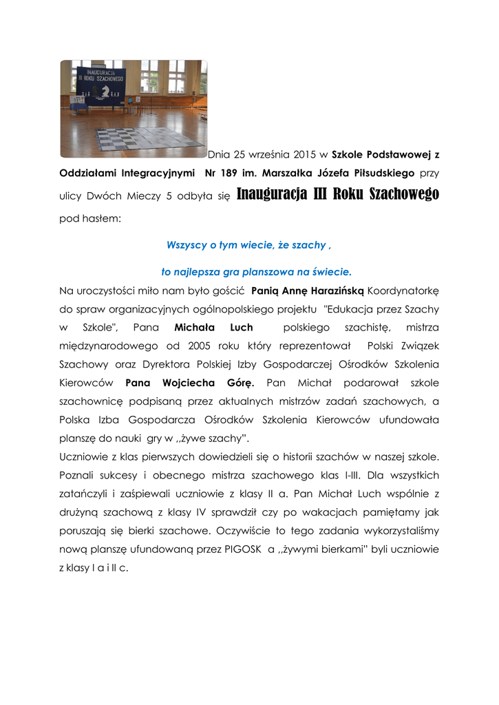Dnia 25 września 2015 w Szkole Podstawowej z Oddziałami Integracyjnymi Nr 189 im. Marszałka Józefa Piłsudskiego przy ulicy Dwóch Mieczy 5 odbyła się Inauguracja III Roku Szachowego pod hasłem: Wszyscy o tym wiecie, że szachy , to najlepsza gra planszowa na świecie. Na uroczystości miło nam było gościć Panią Annę Harazińską Koordynatorkę do spraw organizacyjnych ogólnopolskiego projektu "Edukacja przez Szachy w Szkole", Pana Michała Luch polskiego szachistę, międzynarodowego od 2005 roku który reprezentował mistrza Polski Związek Szachowy oraz Dyrektora Polskiej Izby Gospodarczej Ośrodków Szkolenia Kierowców Pana Wojciecha Górę. Pan Michał podarował szkole szachownicę podpisaną przez aktualnych mistrzów zadań szachowych, a Polska Izba Gospodarcza Ośrodków Szkolenia Kierowców ufundowała planszę do nauki gry w ,,żywe szachy”. Uczniowie z klas pierwszych dowiedzieli się o historii szachów w naszej szkole. Poznali sukcesy i obecnego mistrza szachowego klas I-III. Dla wszystkich zatańczyli i zaśpiewali uczniowie z klasy II a. Pan Michał Luch wspólnie z drużyną szachową z klasy IV sprawdził czy po wakacjach pamiętamy jak poruszają się bierki szachowe. Oczywiście to tego zadania wykorzystaliśmy nową planszę ufundowaną przez PIGOSK a ,,żywymi bierkami” byli uczniowie z klasy I a i II c. Idąc za hasłem ,,Wars i Sawa grają w szachy” wszyscy uczniowie z klas I-III w bieżącym roku szkolnym mają zajęcia z nauki gry w szachy w ramach prowadzonych innowacji pedagogicznych. Na poziomie klas II jest prowadzona nauka gry w szachy w ramach innowacji pedagogicznej pod hasłem ,, Szachami wojuję umysł trenmuję”. Na poziomie klas I jest prowadzona nauka gry w szachy w ramach innowacji pedagogicznej pod hasłem ,, W królestwie szachów” . W klasie IV innowacja jest pod hasłem ,,Szach mat”. Uczniowie z klasy III a i III b będą mogli kontynuować naukę gry w szachy dzięki Pani Dyrektor Annie Posmyk która podpisała projekt z Polskim Związkiem Szachowym pod hasłem ,,Dwa lata i co dalej?. Dziękujemy wszystkim którzy wspierają naszą edukację szachową. Więcej informacji i zdjęć na www.zs76.edu.pl U. Góra