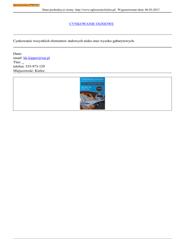 Dane pochodzą ze strony: http://www.ogloszenia-kielce.pl/. Wygenerowano dnia: 06-03-2017. CYNKOWANIE OGNIOWE Cynkowanie wszystkich elementow stalowych nisko oraz wysoko gabarytowych. Dane: email: [email protected] Tlen: telefon: 535-973-129 Miejscowość: Kielce