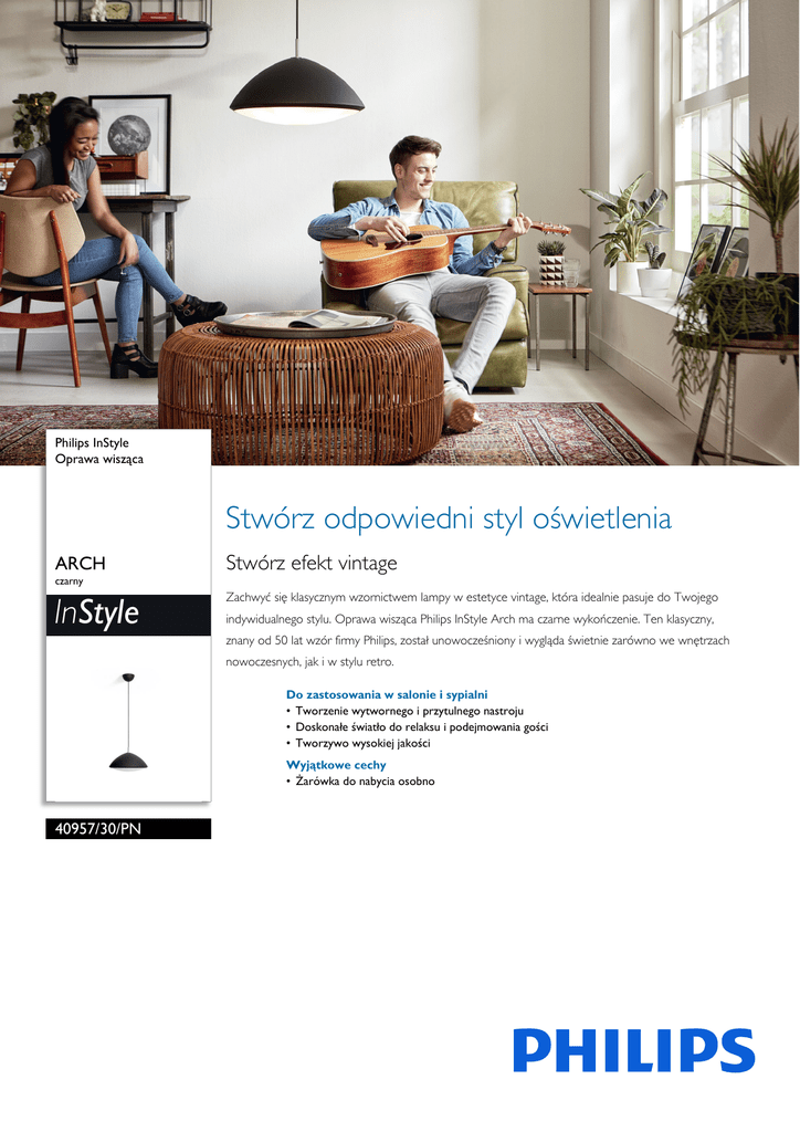 Philips InStyle Oprawa wisząca Stwórz odpowiedni styl oświetlenia ARCH Stwórz efekt vintage czarny InStyle Zachwyć się klasycznym wzornictwem lampy w estetyce vintage, która idealnie pasuje do Twojego indywidualnego stylu. Oprawa wisząca Philips InStyle Arch ma czarne wykończenie. Ten klasyczny, znany od 50 lat wzór firmy Philips, został unowocześniony i wygląda świetnie zarówno we wnętrzach nowoczesnych, jak i w stylu retro. Do zastosowania w salonie i sypialni • Tworzenie wytwornego i przytulnego nastroju • Doskonałe światło do relaksu i podejmowania gości • Tworzywo wysokiej jakości Wyjątkowe cechy • Żarówka do nabycia osobno 40957/30/PN 4095730PN Oprawa wisząca ARCH czarny Dane techniczne Stylistyka i wykończenie • Materiał: metal • Kolor: czarny Wymiary i waga produktu • • • • • Minimalna wysokość: 31,6 cm Maksymalna wysokość: 181,6 cm Długość: 39,9 cm Szerokość: 39,9 cm Waga netto: 3,1 kg Dane techniczne • • • • • • • • Zasilanie sieciowe: Przedział 220–240 V, 50–60 Hz Liczba źródeł światła: 1 Trzonek: E27 Moc źródła światła w zestawie: źródło światła niedołączone do zestawu Maksymalna moc wymiennego źródła światła: 60 W Oprawa z możliwością przyciemniania: Nie Wbudowane źródło światła LED: NIE Klasa energetyczna dołączonego źródła światła: Zalety źródło światła do nabycia osobno • Oprawa jest zgodna ze źródłami światła klasy: A++ do E • Współczynnik IP: IP20, ochrona przed przedmiotami powyżej 12,5 mm, brak ochrony przed wodą • Klasa ochronności: I — uziemienie Serwis • Gwarancja: 2 lata Wymiary i waga opakowania • • • • Wysokość: 34,5 cm Długość: 45,3 cm Szerokość: 45,3 cm Waga: 4,400 kg Różne • Opracowano z myślą o: Salon i sypialnia • Styl: Tradycyjny • Typ: Oprawa wisząca • Doskonałe światło do relaksu i podejmowania gości Salon jest sercem każdego domu — to miejsce przeznaczone do rodzinnych spotkań, odpoczynku i podejmowania gości. Oświetlenie w salonie i w sypialni powinno dawać dużą swobodę i możliwość dostosowania do potrzeb użytkowników, dzięki czemu będzie mogło sprostać ich wymaganiom w ciągu całego dnia. Przemyślane rozmieszczenie różnych typów oświetlenia i umiejętna zabawa światłem mogą nie tylko pomóc w stworzeniu wrażenia ciepła i otwartości, ale też sprawić, że pomieszczenie wyda się bardziej przestronne. Tworzenie wytwornego nastroju Ta lampa stanowi nowe oblicze ponadczasowego stylu, a jej wyjątkowy kształt to idealne połączenie dawnych i aktualnych trendów. Sprawdzi się doskonale w domach utrzymanych w stylistyce zarówno nowoczesnej, jak i retro, dając szerokie możliwości łączenia stylów, aby osiągnąć wystrój, który dobrze wygląda i w którym dobrze się czujesz. Żarówka do nabycia osobno Żarówka nie jest dołączona do zestawu z lampą, dzięki czemu możesz wybrać źródło światła, które najlepiej pasuje do Twojego wnętrza i spełnia Twoje oczekiwania. Żarówka LED firmy Philips zapewni wysoką jakość oraz długie godziny użytkowania. Tworzywo wysokiej jakości Najlepsze materiały oraz doskonałe wykończenie gwarantują niezwykłą trwałość, dzięki czemu lampa będzie wzbogacać wystrój Twojego domu przez długie lata. Data wydania 2016-10-09 © 2016 Philips Lighting Holding B.V. Wszelkie prawa zastrzeżone. Wersja: 2.0.1 Dane techniczne mogą ulec zmianie bez powiadomienia. Znaki towarowe są własnością Philips Lighting Holding B.V. lub własnością odpowiednich firm. 12 NC: 9150 053 11901 EAN: 87 18696 15663 6 www.philips.com