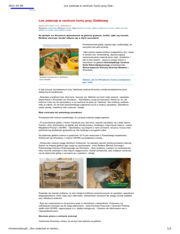 2011-03-09 Los zwierz t w centrum hurtu przy Gie … reklama Los zwierz t w centrum hurtu przy Gie dowej Dodane 2011-02-21 13.12 , komentarzy 8 Kategorie: Wiadomo ci Miejsce: Krzyki, Tagi: ekostra w roc aw , gie da zoologiczna w roc aw , gie da zw ierz t gie dow a w roc aw , dchrs gie da w roc aw , Na gie dzie we Wroc awiu sprzedawane s g ównie gryzonie, króliki, rybki czy kanarki. Ekostra alarmuje: handel odbywa si w z ych warunkach. Udost pnij artyku na Facebook u Przedstawiciele gie dy zaprzeczaj i podkre laj , e wszystko jest pod kontrol . "Jako polskie spo ecze stwo osi gn li my dno, nawet w ramach tzw. humanitarnej, dopuszczaj cej wykorzystywanie zwierz t przez ludzi, dziedzinie. I jest to dno totalne" - pisz na swojej stronie o warunkach na gie dzie Dolno skiego Centrum Hurtu Rolno-Spo ywczego przedstawiciele Stowarzyszenia Ochrony Zwierz t Ekostra z Wroc awia. Sprzeda zwierz t przy ul. Gie dowej Autor: Ekostra Zobacz, jak we Wroc awiu mo na zachipowa psa i kota O z ej sytuacji sprzedawanych przy Gie dowej zwierz t Ekostra zosta a powiadomiona przez detalicznych handlowców. - Zwierz ta w klatkach by y st oczone, m czy y si . Niektóre szczurki mia y wierzb - opowiada Dawid Kara z Ekostra y we Wroc awiu. - Sprzedawcy czuj si bezkarnie. Mówili np. e, jak króliczki znów si nie sprzedadz , to po powrocie do domu je "za atwi ". Nie mieli my podstaw, eby je zabra , bo nie by o bezpo redniego zagro enia ycia w miejscu sprzeda y. Z amali my swoje zasady i kupili my kilka zwierz t - dodaje. Ma e zwierz ta te potrzebuj przestrzeni Przedstawiciele centrum podkre laj , e sytuacja zwierz t uleg a poprawie. - Po przeniesieniu gie dy z terenu Transbudu trzy lata temu, warunki sprzeda y s o wiele lepsze. Pawilon, który dzier awimy na gie , jest klimatyzowany, handluj cy maj wi cej miejsca - uwa a Magdalena Przyby z DCHRS. - Sprzedawcy s zwi zani z nami umowami, wszyscy musz mie potwierdzon dzia alno gospodarcz . Nie handluj tu przygodni ludzie. Na pi tkowej gie dzie zawsze w godzinach 10-12 jest weterynarz z Powiatowego Inspektoratu Weterynarii we Wroc awiu, z którym DCHRS ma podpisana umow . - Weterynarz zwraca uwag niektórym hodowcom, by poprawili warunki przetrzymywania zwierz t. Zwykle na kolejnej gie dzie jego uwagi s zastosowane - mówi Barbara Zbro ek-Szmor g z Pa stwowego Instytutu Wetenaryjnego we Wroc awiu. - By y problemy z jednym ze sprzedawców, który trzyma zwierz ta w zbyt du ym zag szczeniu. Dosta ostrze enie, przy kolejnym zwrócimy si do w ciciela gie dy o usuni cie go z pawilonu - dodaje. Pojawia y si równie problemy ze zbyt m odymi królikami przeznaczonymi na sprzeda i papu kami ugoogoniastymi, które mia y zbyt ma e klatki. Hurtownikom zwracano te uwag na brak poide ek przy niektórych klatkach. - By y te zastrze enia co do poziomu wody w zbiornikach z bojownikami. Hurtownicy s zobowi zani stosowa si do uwag weterynarza - mówi Krystyna Pozuczek z ywno ci Polskiej, spó ki-córki DCHRS, organizuj cej m.in. gie zoologiczn . - Ostatnio nie informowano nas o nieprawid owo ciach. Dziurawe prawo o ochronie zwierz t Cz onkowie Ekostra y mówi , e nie byli mile widziani na gie dzie. mmwroclaw.pl/…/los-zwierzat-w-centru… 1/2 2011-03-09 Los zwierz t w centrum hurtu przy Gie … - Sprzedawcy nie pozwolili robi nam zdj , potem wyprosili z terenu gie dy. Zachowywali si agresywnie, a nie chcieli my si z nimi szarpa , wi c opu cili my gie - wspomina Kara . Problemem zwierz t jest "dziurawe" polskie prawo, które nie okre la, w jakich warunkach mo na handlowa zwierz tami. Je li dane miejsce nie jest zg oszone do Powiatowego Inspektora Weterynarii, nie zostanie nigdy przez t inspekcj skontrolowane. Ustawa o ochronie zwierz t mówi ogólnie, e zwierz ta powinny by przetrzymywane w humanitarnych warunkach. Nie okre lono, czy dobrymi warunkami jest klatka o d ugo ci 80 cm dla jednego czy dziesi ciu królików. Czytaj równie : Ekolodzy buduj domki w Parku Szczytnickim Piek o kotów z arowa [drastyczne zdj cia!] W Renomie mo na by o adoptowa psy ui koty [wideo] Ferie 2011 we Wroc awiu Zmie swoje drogowe miasto Photo Day - serwis pieliska i baseny we Wroc awiu Rozk ad jazdy MPK Wroc aw Dzieje si we Wroc awiu Znajd nas na Facebooku MMWroclaw.pl Lubi to! Liczba osób, które lubi MMWroclaw.pl: 2,124. E kstra A nna A gnieszka Tadeusz E wa A gnieszka Yu D ominik K atarzy na Karolina V ioletta D idier M agdalena Luke G rzegorz K ama Kry sty na Joanna P iotr Wojciech Wty czka spo eczno ciow a F acebooka zg nadu ycie Micha Potocki reklama mmwroclaw.pl/…/los-zwierzat-w-centru… 2/2