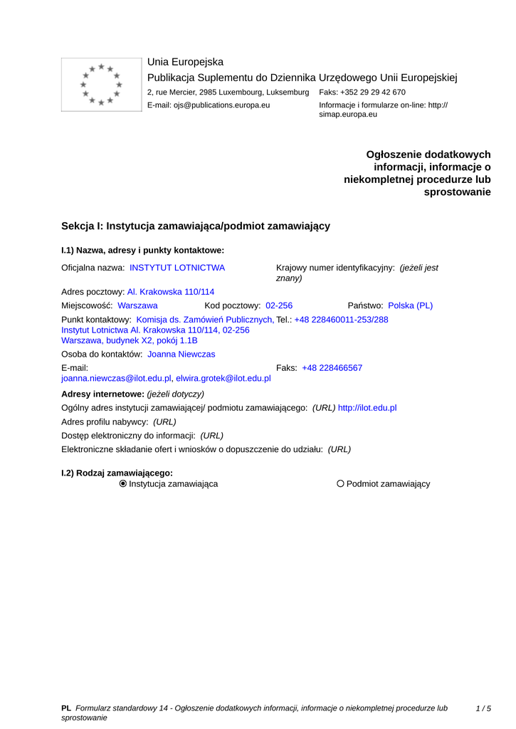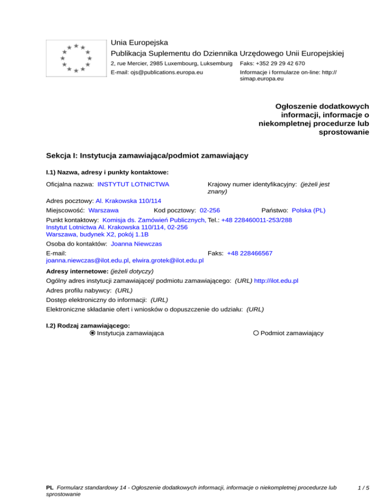 Unia Europejska Publikacja Suplementu do Dziennika Urzędowego Unii Europejskiej 2, rue Mercier, 2985 Luxembourg, Luksemburg Faks: +352 29 29 42 670 E-mail: [email protected] Informacje i formularze on-line: http:// simap.europa.eu Ogłoszenie dodatkowych informacji, informacje o niekompletnej procedurze lub sprostowanie Sekcja I: Instytucja zamawiająca/podmiot zamawiający I.1) Nazwa, adresy i punkty kontaktowe: Oficjalna nazwa: INSTYTUT LOTNICTWA Krajowy numer identyfikacyjny: (jeżeli jest znany) _____ Adres pocztowy: Al. Krakowska 110/114 Miejscowość: Warszawa Kod pocztowy: 02-256 Państwo: Polska (PL) Punkt kontaktowy: Komisja ds. Zamówień Publicznych, Tel.: +48 228460011-253/288 Instytut Lotnictwa Al. Krakowska 110/114, 02-256 Warszawa, budynek X2, pokój 1.1B Osoba do kontaktów: Joanna Niewczas E-mail: Faks: +48 228466567 [email protected], [email protected] Adresy internetowe: (jeżeli dotyczy) Ogólny adres instytucji zamawiającej/ podmiotu zamawiającego: (URL) http://ilot.edu.pl Adres profilu nabywcy: (URL) _____ Dostęp elektroniczny do informacji: (URL) _____ Elektroniczne składanie ofert i wniosków o dopuszczenie do udziału: (URL) _____ I.2) Rodzaj zamawiającego: Instytucja zamawiająca Podmiot zamawiający PL Formularz standardowy 14 - Ogłoszenie dodatkowych informacji, informacje o niekompletnej procedurze lub sprostowanie 1/5 Sekcja II: Przedmiot zamówienia II.1.1) Nazwa nadana zamówieniu: Doradztwo w zakresie pozyskiwania źródeł finansowania, w tym przygotowanie dokumentacji aplikacyjnej w celu uzyskania grantu lub dotacji na zasadach success fee II.1.2) Krótki opis zamówienia lub zakupu: (podano w pierwotnym ogłoszeniu) Przedmiotem zamówienia jest doradztwo w zakresie pozyskiwania źródeł finansowania, w tym przygotowanie dokumentacji aplikacyjnej w celu uzyskania grantu lub dotacji na zasadach success fee obejmujące w szczególności: 1) analizę projektów Instytutu Lotnictwa pod kątem możliwości uzyskania dofinansowania i przygotowania rekomendacji odnośnie optymalnych źródeł wsparcia (bieżące konsultacje dotyczące projektów Instytutu Lotnictwa i możliwości uzyskania przez Instytut Lotnictwa dofinansowania dla tych lub nowych projektów); 2) opracowanie dokumentacji konkursowej dla wybranych projektów – przygotowanie wniosku o dofinansowanie, biznes planu/ studium wykonalności oraz wymaganych załączników, w tym przygotowanie odpowiedzi na ewentualne uwagi w procesie oceny wniosku; 3) doradztwo w zakresie przygotowania dokumentów do umowy o dofinansowanie; 4) przeprowadzenie szkolenia z rozliczania projektu, praw i obowiązków beneficjenta dotyczących prawidłowej realizacji dofinansowanego projektu; 5) doradztwo w zakresie współpracy z instytucjami publicznymi udzielającymi wsparcia w trakcie realizacji projektów dofinansowanych oraz monitorującymi realizację projektu zgodnie z jego wytycznymi, w tym sporządzanie dokumentów projektowych np. wniosków o aneks; 6) wsparcie prawne w procesie pozyskiwania wsparcia (dofinansowania) i realizacji projektu. II.1.3) Wspólny Słownik Zamówień (CPV) Główny przedmiot Dodatkowe przedmioty Słownik główny 85312320 79110000 Słownik uzupełniający (jeżeli dotyczy) PL Formularz standardowy 14 - Ogłoszenie dodatkowych informacji, informacje o niekompletnej procedurze lub sprostowanie 2/5 Sekcja IV: Procedura IV.1)Rodzaj procedury (podano w pierwotnym ogłoszeniu) Otwarta Ograniczona Ograniczona przyspieszona Negocjacyjna Negocjacyjna przyspieszona Dialog konkurencyjny Negocjacyjna z uprzednim ogłoszeniem Negocjacyjna bez uprzedniego ogłoszenia Negocjacyjna z publikacją ogłoszenia o zamówieniu Negocjacyjna bez publikacji ogłoszenia o zamówieniu Udzielenie zamówienia bez uprzedniej publikacji ogłoszenia o zamówieniu w Dzienniku Urzędowym Unii Europejskiej IV.2)Informacje administracyjne IV.2.1)Numer referencyjny: (podano w pierwotnym ogłoszeniu) 10/DE/Z/2016 IV.2.2)Dane referencyjne ogłoszenia w przypadku ogłoszeń przesłanych drogą elektroniczną: Pierwotne ogłoszenie przesłane przez eNotices TED eSender Login: ENOTICES_ebora Dane referencyjne ogłoszenia: 2016-037696 rok i numer dokumentu IV.2.3)Ogłoszenie, którego dotyczy niniejsza publikacja: Numer ogłoszenia w Dz.U.: 2016/S 061-104769 z dnia: 26/03/2016 (dd/mm/rrrr) IV.2.4)Data wysłania pierwotnego ogłoszenia: 24/03/2016 (dd/mm/rrrr) PL Formularz standardowy 14 - Ogłoszenie dodatkowych informacji, informacje o niekompletnej procedurze lub sprostowanie 3/5 Sekcja VI: Informacje uzupełniające VI.1) Ogłoszenie dotyczy: Procedury niepełnej Sprostowania Informacji dodatkowych VI.2) Informacje na temat niepełnej procedury udzielenia zamówienia: Postępowanie o udzielenie zamówienia zostało przerwane Postępowanie o udzielenie zamówienia uznano za nieskuteczne Zamówienia nie udzielono Zamówienie może być przedmiotem ponownej publikacji VI.3) Informacje do poprawienia lub dodania : VI.3.1) Zmiana oryginalnej informacji podanej przez instytucję zamawiającą Publikacja w witrynie TED niezgodna z oryginalną informacją, przekazaną przez instytucję zamawiającą Oba przypadki VI.3.2) W ogłoszeniu pierwotnym W odpowiedniej dokumentacji przetargowej (więcej informacji w odpowiedniej dokumentacji przetargowej) W obu przypadkach (więcej informacji w odpowiedniej dokumentacji przetargowej) VI.3.3) Tekst, który należy poprawić w pierwotnym ogłoszeniu Miejsce, w którym znajduje się Zamiast: zmieniany tekst: Powinno być: VI.3.4) Daty, które należy poprawić w pierwotnym ogłoszeniu Miejsce, w którym znajdują się Zamiast: zmieniane daty: Powinno być: VI.3.5) Adresy i punkty kontaktowe, które należy poprawić VI.3.6) Tekst, który należy dodać do pierwotnego ogłoszenia Miejsce, w którym należy dodać tekst: Tekst do dodania: VI.3)Informacje dodatkowe Dodaje się punkty: 25. W przypadku przedłożenia polisy ubezpieczenia OC, a w przypadku jej braku innego dokumentu potwierd