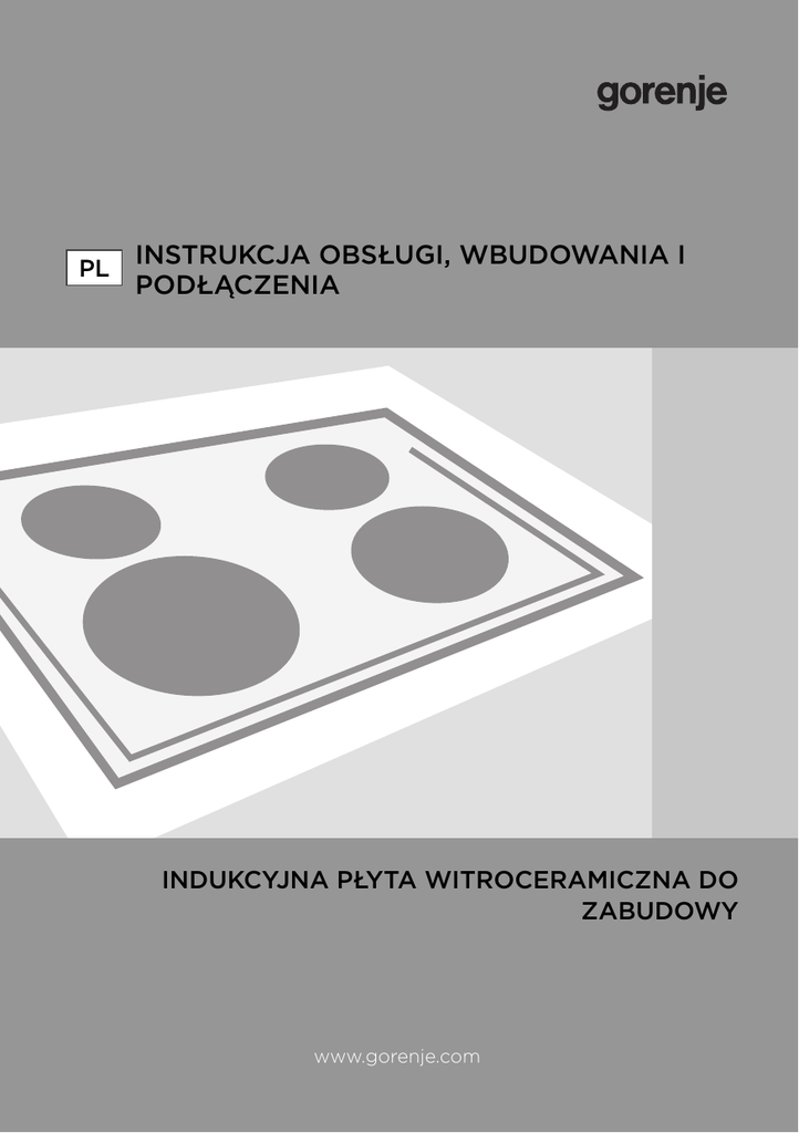 PL INSTRUKCJA OBSŁUGI, WBUDOWANIA I PODŁĄCZENIA INDUKCYJNA PŁYTA WITROCERAMICZNA DO ZABUDOWY www.gorenje.com Spoštovani kupec! Płyta witroceramiczna przeznaczona jest do stosowania w gospodarstwie domowym. Opakowanie naszych wyrobów wykonane jest z materiałów przyjaznych dla środowiska naturalnego i poddających się utylizacji lub zniszczeniu. Informują o tym specjalne oznaczenia umieszczone na opakowaniu. Instrukcja obsługi Instrukcja obsługi przeznaczona jest dla użytkownika. Instrukcja opisuje urządzenie oraz jego obsługę. Przeznaczona jest dla różnych modeli urządzenia, dlatego może zawierać opisy funkcji, których Wasze urządzenie nie posiada. Instrukcja przyłączenia Przyłączenie urządzenia do źródła energii elektrycznej musi być wykonane zgodnie ze zasadami zawartymi w rozdziale Przyłączenie do źródła energii elektrycznej oraz zgodnie z obowiązującymi standardami i przepisami. Wbudowanie urządzenia i jego przyłączenie do sieci Elektrycznej, może wykonać tylko fachowiec. Tabliczka znamionowa Tabliczka znamionowa, zawierająca podstawowe dane urządzenia, znajduje się na spodniej stronie urządzenia. Ochrona przed pożarem Urządzenia mogą być wbudowane w ciągu zabudowy kuchennej pod warunkiem, że z jednej strony urządzenia, element zabudowy kuchennej jest równy na wysokość z płaszczyzną płyty grzejnej. Z drugiej strony zabudowa może być wyższa. Pomocne rysunki: Istotne informacje 403509 Wskazówka 2 SPIS TREŚCI 403509 WAŻNE OSTRZEŻENIA .................................................................................................. 4 Na co należy zwracać uwagę ..................................................................................................4 Podłączenie i naprawa ..............................................................................................................4 Podczas użytkowania..................................................................................................................4 Zabezpieczenie przed przegrzaniem ..................................................................................6 Ograniczenie czasu gotowania ..............................................................................................6 PANEL STERUJĄCY ..........................................................................................................8 Panel sterujący ...............................................................................................................................8 Pola grzejne .....................................................................................................................................9 Sposób użycia .................................................................................................................10 Nauka obsługi urządzenia … .................................................................................................. 10 Naczynia ............................................................................................................................................11 SPOSÓB DZIAŁANIA PŁYTY KUCHENNEJ .............................................................. 13 Włączenie płyty kuchennej i ustawienie mocy grzejnej .......................................... 13 Rozpoznawanie naczyń ........................................................................................................... 13 Wskaźnik ciepła resztkowego ............................................................................................... 13 Funkcja automatycznego nagrzewania ........................................................................... 14 Podwyższanie mocy ...................................................................................................................15 Wyłączenie płyty kuchennej.................................................................................................. 16 Tryb gotowości ............................................................................................................................. 16 Blokada zabezpieczająca (przed dziećmi) .............................................................................................................................17 Funkcja Zatrzymaj/Kontynuuj .............................................................................................. 18 Funkcja ustawienia minutnika ............................................................................................... 18 Funkcja ustawienia czasu gotowania ................................................................................ 19 Wyłączenie alarmu odlicznika czasu/ minutnika........................................................20 Gotowanie ........................................................................................................................ 21 Zdrowe gotowanie .......................................................................................................................21 Ustawienia gotowania ................................................................................................................21 CZYSZCZENIE I KONSERWACJA .............................................................................. 23 Czyszczenie................................................................................................................................... 23 Usuwanie zakłóceń ........................................................................................................ 25 Ogólnie ............................................................................................................................................ 25 Tabela usuwania zakłóceń ..................................................................................................... 25 Instrukcja montażu ........................................................................................................ 26 Na co należy zwrócić uwagę ...........