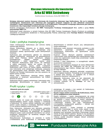 Kluczowe informacje dla Inwestorów Arka BZ WBK Gotówkowy Subfundusz funduszu Arka BZ WBK FIO Niniejszy dokument zawiera kluczowe informacje dla Inwestorów dotyczące tego Subfunduszu. Nie są to materiały marketingowe. Dostarczenie tych informacji jest wymogiem prawnym mającym na celu ułatwienie zrozumienia charakteru i ryzyka związanego z inwestowaniem w ten Subfundusz. Przeczytanie niniejszego dokumentu jest zalecane Inwestorowi, aby mógł podjąć świadomą decyzję inwestycyjną. Podmiot zarządzający Subfunduszem: BZ WBK Towarzystwo Funduszy Inwestycyjnych S.A., spółka z grupy Banku Zachodniego WBK S.A. Subfundusz został utworzony w ramach funduszu Arka BZ WBK Fundusz Inwestycyjny Otwarty (Fundusz) na podstawie zezwolenia na prowadzenie działalności w Rzeczypospolitej Polskiej udzielonego przez Komisję Nadzoru Finansowego i podlega jej nadzorowi. Cele i polityka inwestycyjna Celem inwestycyjnym Subfunduszu jest ochrona realnej wartości jego aktywów. Aktywa Subfunduszu lokowane są w dłużne papiery wartościowe i instrumenty rynku pieniężnego, przy zachowaniu zasady ograniczonego ryzyka dokonywanych inwestycji. Subfundusz jest zorientowany głównie na nabywanie obligacji emitowanych, poręczanych lub gwarantowanych przez Skarb Państwa, bonów skarbowych, obligacji przedsiębiorstw, obligacji banków, certyfikatów depozytowych i listów zastawnych. Łączny udział w Aktywach Subfunduszu lokat innych, niż wskazane w zdaniu poprzednim będzie nie wyższy niż 20% (dwadzieścia procent). Łączny udział w aktywach Subfunduszu lokat innych niż dłużne papiery wartościowe oraz instrumenty rynku pieniężnego emitowane, poręczane lub gwarantowane przez Narodowy Bank Polski, Skarb Państwa lub Państwa Członkowskie oraz listy zastawne nie będzie wyższy niż 50%. Wśród lokat Subfunduszu dominują dłużne papiery wartościowe o zmiennym oprocentowaniu lub krótkim terminie do wykupu. Subfundusz lokuje w papiery wartościowe i instrumenty rynku pieniężnego denominowane w walucie polskiej lub denominowane w walutach obcych, przy zabezpieczeniu ryzyka walutowego. Subfundusz może stosować instrumenty pochodne w celu zapewnienia sprawnego zarządzania portfelem inwestycyjnym Subfunduszu lub ograniczenia ryzyka inwestycyjnego. Kryterium doboru dłużnych papierów wartościowych i instrumentów rynku pieniężnego jest maksymalizacja stopy zwrotu przy ograniczaniu ryzyka stopy procentowej i ryzyka kredytowego emitenta. Dochody z lokat Subfunduszu, w szczególności odsetki, są ponownie inwestowane. Wzorcem (benchmarkiem) służącym do oceny efektywności inwestycji jest WIBID 3M. Subfundusz nie ma na celu odwzorowywania tego indeksu, dlatego jego wyniki mogą od niego odbiegać. Subfundusz dokonuje odkupienia jednostek uczestnictwa (JU) na żądanie Inwestora. Transakcje na JU są realizowane w każdym Dniu Wyceny, za wyjątkiem dni, w których zawieszono zbywanie i odkupywanie JU. Zalecenie: Subfundusz może nie być odpowiedni dla Inwestorów, którzy planują wycofać wpłacone środki w okresie krótszym niż 6 miesięcy od dnia ich zainwestowania. Wskaźnik zysku do ryzyka pieniężnego. W związku z tym wartość JU Subfunduszu cechowała się niską zmiennością. Ryzyka mające istotne znaczenie dla Subfunduszu, które nie są uwzględnione przez wskaźnik: Ryzyko kredytowe – ryzyko niewywiązywania się przez emitenta papierów wartościowych o charakterze dłużnym, lub też dłużnika z innych tytułów, ze swoich zobowiązań. Podstawową przyczyną zaprzestania wywiązywania się z zobowiązań emitenta jest jego niewypłacalność, a w przypadku występowania gwarancji – również stan niewypłacalności gwaranta. Ryzyko płynności – ryzyko trudności w sprzedaży instrumentu finansowego w wyniku braku popytu na ten instrument. Ryzyko to może wiązać się z koniecznością akceptacji ceny sprzedaży instrumentu finansowego istotnie niższej niż jego wartość godziwa. Ryzyko to ma szczególne znaczenie w sytuacji nasilonych odkupień JU Subfunduszu i dotyczy przede wszystkim obligacji, których emitentem są przedsiębiorstwa. Profil ryzyka i zysku potencjalnie niższy zysk niższe ryzyko potencjalnie wyższy zysk wyższe ryzyko Wskaźnik zysku do ryzyka jest syntetyczną wielkością, odzwierciedlającą poziom ryzyka związany z inwestycją w Subfundusz. Im wyższa wartość wskaźnika, tym wyższy poziom ryzyka związany z inwestycją. Najniższa kategoria (1) nie oznacza inwestycji wolnej od ryzyka. Dane historyczne, stosowane przy obliczaniu wskaźnika ryzyka, nie dają pewności co do przyszłego profilu ryzyka Subfunduszu. Subfundusz nie gwarantuje, że wskazana kategoria ryzyka i zysku pozostanie niezmienna; tym samym przypisanie Subfunduszu do określonej kategorii może z czasem ulec zmianie. Sklasyfikowanie Subfunduszu na poziomie 2 wynika z inwestowania przez Subfundusz w instrumenty rynku Opłaty Opłaty jednorazowe pobierane przed lub po dokonaniu inwestycji Stawka opłaty za nabycie kosztów dystrybucji i zmniejszają potencjalny zysk z inwestycji. W przypadku zamiany z subfunduszu o niższej stawce opłaty za nabycie do subfunduszu o wyższej stawce opłaty za nabycie, obok opłaty za zamianę, może być pobrana opłata według stawki będącej różnicą tych stawek. Szczegółowe informacje dotyczące opłat znajdują się w pkt. 16.4 prospektu informacyjnego Funduszu. Inwestor może uzyskać informacje o bieżącej wysokości opłat na stronie: www.arka.pl/dokumenty/tabele-oplat.html lub u dystrybutorów Funduszu. Zaprezentowana wysokość opłat bieżących, do których zalicza się m.in. opłatę za zarządzanie, została określona na podstawie kosztów poniesionych przez Subfundusz w roku obrotowym kończącym się w dniu 31.12.2016 r. Wysokość opłat bieżących pobieranych z Subfunduszu może co roku ulegać zmianie. W przypadku tego Subfunduszu opłata za wyniki nie jest pobierana. 3,0 % Stawka opłaty z