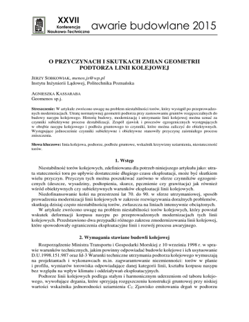 XXVII Konferencja Naukowo-Techniczna awarie budowlane 2015 O PRZYCZYNACH I SKUTKACH ZMIAN GEOMETRII PODTORZA LINII KOLEJOWEJ JERZY SOBKOWIAK, [email protected] Instytu Inżynierii Lądowej, Politechnika Poznańska AGNIESZKA KASSARABA Geomenos sp.j. Streszczenie: W artykule zwrócono uwagę na problem niestabilności torów, który wystąpił po przeprowadzonych modernizacjach. Utratę normatywnej geometrii podtorza przy zastosowaniu gruntów rozgęszczalnych do budowy nasypu kolejowego. Historię budowy, modernizację i utrzymanie linii kolejowej można uznać za czynniki subiektywne procesu destabilizacji. Zespół zjawisk i procesów egzogenicznych występujących w obrębie nasypu kolejowego i podłoża gruntowego to czynniki, które można zaliczyć do obiektywnych. Występujące jednocześnie czynniki subiektywne i obiektywne stanowiły przyczynę zaistniałego procesu zniszczenia. Słowa kluczowe: linia kolejowa, podtorze, podłoże gruntowe, wskaźnik krzywizny uziarnienia, niestateczność torów. 1. Wstęp Niestabilność torów kolejowych, zdefiniowana dla potrzeb niniejszego artykułu jako: utrata stateczności toru po upływie dostatecznie długiego czasu eksploatacji, może być skutkiem wielu przyczyn. Przyczyn tych można poszukiwać zarówno w sferze czynników egzogenicznych (deszcze, wysadziny, podtopienia, skurcz, pęcznienie czy grawitacja) jak również wśród obiektywnych czy subiektywnych warunków eksploatacji linii kolejowych. Niedofinansowanie kolei na przestrzeni lat 70. do 90. w sferze utrzymaniowej, sposób prowadzenia modernizacji linii kolejowych w zakresie rozwiązywania doraźnych problemów, skutkują dzisiaj często niestabilnością torów, zwłaszcza na liniach intensywnie obciążonych. W artykule zwrócono uwagę na problem niestabilności torów kolejowych, który powstał wskutek deformacji korpusu nasypu po przeprowadzonych modernizacjach tych linii kolejowych. Przedstawiono dwa przypadki różnego zakresu zmodernizowania linii kolejowej, które spowodowały ograniczenia eksploatacyjne linii i rozwój procesu awaryjnego. 2. Wymagania stawiane budowli kolejowej Rozporządzenie Ministra Transportu i Gospodarki Morskiej z 10 września 1998 r. w sprawie warunków technicznych, jakim powinny odpowiadać budowle kolejowe i ich usytuowanie D.U.1998.151.987 oraz Id-3 Warunki techniczne utrzymania podtorza kolejowego wymuszają na projektantach i wykonawcach m.in. zagwarantowanie niezmienności: torów w planie i profilu, wymiarów torowiska odpowiadające danej kategorii linii, kształtu korpusu nasypu bez względu na wpływ klimatu i oddziaływań eksploatacyjnych. Podtorze linii kolejowych podlega stałym i harmonicznym uderzeniom od taboru kolejowego, wywołujące drgania, które sprzyjają rozgęszczeniu konstrukcji gruntowej przy niskiej wartości wskaźnika jednorodności uziarnienia CU. Zjawisko emitowania drgań w podtorzu 470 O przyczynach i skutkach zmian geometrii podtorza linii kolejowej potęgowane jest złym stanem nawierzchni kolejowej, przez zniszczenie przytwierdzenia szyn do podkładów, istnienie wychlapek i zniszczenie podkładów drewnianych, oraz zbyt dużą szczeliną na styku szyn. Wszystko to sprzyja deformacjom podtorza, które przenoszą się na niestabilność torów kolejowych. W przeszłości nasypy kolejowe budowane były przede wszystkim z materiałów miejscowych, które obecnie nie zawsze spełniają kryteria wymagane przepisami Id-3, dla materiałów wbudowywanych w nasyp. Przepis stanowi, że materiał gruntowy użyty do budowy nasypu musi mieć wartość wskaźnika jednorodności uziarnienia CU ≥ 5 (wskaźnik ten definiowany jest: CU = d60/d10), a dla linii nowo budowanych CU > 10. Kolejnym parametrem, jaki określa przepis jest wskaźnik krzywizny uziarnienia (definiowany, jako: = ), jeżeli C = 1–3 grunt jest dobrze uziarniony i odporny na drgania. Warunkiem dobrej zagęszczalności gruntu i jego odporności na drgania występujące podczas eksploatacji, jest spełnienie wymagań dotyczących kształtu krzywej uziarnienia gruntu zastosowanego na konstrukcje nasypu. Odwrotnością zagęszczalności jest rozgęszczalność. Jeżeli do tych zjawisk dodamy niepożądaną zmianę geometrii podtorza to destrukcja nasypów odbywała się w sposób bardzo intensywny. Trwałe zachowanie geometrii przekroju normalnego toru (rys. 1) poza właściwą konstrukcją podtorza, wymaga zachowania ławy torowiskowej (minimum c = 0,60 m), która często traktowana jest bez należytej staranności. W awariach obiektów budowlanych o powstaniu stanu zniszczenia decyduje na ogół jednoczesne zaistnienie szeregu niekorzystnych procesów i zjawisk. Autorzy artykułu skupią się jednak na dwóch elementach, które ich zdaniem w głównej mierze przyczyniły się do powstania stanu awaryjnego mianowicie: zniszczenie (brak) ławy torowiskowej oraz materiał gruntowy wbudowany w nasyp o wartości CU <5. Rys. 1. Przekrój normalny toru dla linii magistralnej i pierwszorzędnej dwutorowej w łuku (c – szerokość ławy torowiska)(wg Rozp. Dz.U. nr 151) 3. Przykład I – Awaria linii kolejowej nr 401 Szczecin Dąbie – Świnoujście. Deformacja toru nr 2 na łuku Linia kolejowa nr 401 Szczecin Dąbie – Świnoujście została zbudowana i oddana do eksploatacji ok. 1900 r. Około roku 1976 została zmodernizowana, jako linia dwutorowa i zelektryfikowana. Nastąpiło wyraźne podwyższenie nasypu oraz zwiększony został promień łuku poziomego, tym samym nastąpiła korekta nasypu w planie jak i profilu. Badany odcinek wybudowano w nasypie o wysokości dochodzącej do 15,0 m. Geotechnika 471 Rys. 2. Nieobsypane czoła podkładów, brak ławy torowiska Geometria torowiska wykazywała wyraźnie cechy deformacji, a tor nr 2 (łuk zewnętrzny) cechy niestabilności w planie jak i profilu. Tor nr 2 jest torem bezstykowym o długości odcinków ok. 100 m, na podkładach strunobetonowych PS-94. Wyraźne odkształcenie toków szynowych zaobser