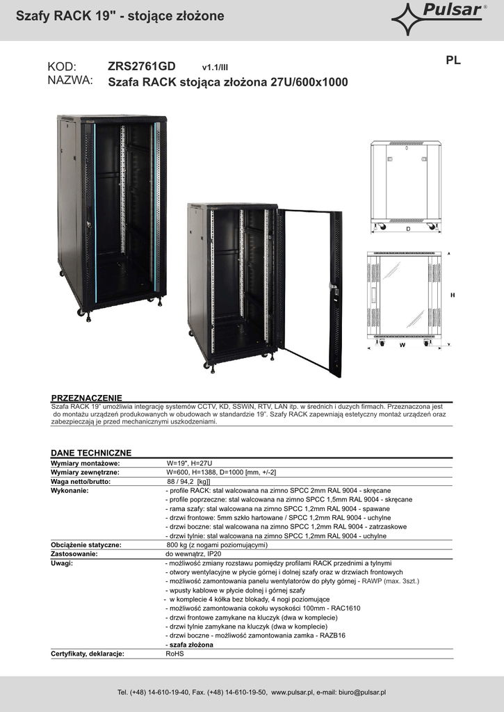 Szafy RACK 19" - stojące złożone KOD: NAZWA: ZRS2761GD v1.1/III Szafa RACK stojąca złożona 27U/600x1000 Pulsar PL PRZEZNACZENIE Szafa RACK 19” umożliwia integrację systemów CCTV, KD, SSWiN, RTV, LAN itp. w średnich i duzych firmach. Przeznaczona jest do montażu urządzeń produkowanych w obudowach w standardzie 19”. Szafy RACK zapewniają estetyczny montaż urządzeń oraz zabezpieczają je przed mechanicznymi uszkodzeniami. DANE TECHNICZNE Wymiary montażowe: Wymiary zewnętrzne: Waga netto/brutto: Wykonanie: Obciążenie statyczne: Zastosowanie: Uwagi: Certyfikaty, deklaracje: W=19", H=27U W=600, H=1388, D=1000 [mm, +/-2] 88 / 94,2 [kg]] - profile RACK: stal walcowana na zimno SPCC 2mm RAL 9004 - skręcane - profile poprzeczne: stal walcowana na zimno SPCC 1,5mm RAL 9004 - skręcane - rama szafy: stal walcowana na zimno SPCC 1,2mm RAL 9004 - spawane - drzwi frontowe: 5mm szkło hartowane / SPCC 1,2mm RAL 9004 - uchylne - drzwi boczne: stal walcowana na zimno SPCC 1,2mm RAL 9004 - zatrzaskowe - drzwi tylnie: stal walcowana na zimno SPCC 1,2mm RAL 9004 - uchylne 800 kg (z nogami poziomującymi) do wewnątrz, IP20 - możliwość zmiany rozstawu pomiędzy profilami RACK przednimi a tylnymi - otwory wentylacyjne w płycie górnej i dolnej szafy oraz w drzwiach frontowych - możliwość zamontowania panelu wentylatorów do płyty górnej - RAWP (max. 3szt.) - wpusty kablowe w płycie dolnej i górnej szafy - w komplecie 4 kółka bez blokady, 4 nogi poziomujące - możliwość zamontowania cokołu wysokości 100mm - RAC1610 - drzwi frontowe zamykane na kluczyk (dwa w komplecie) - drzwi tylnie zamykane na kluczyk (dwa w komplecie) - drzwi boczne - możliwość zamontowania zamka - RAZB16 - szafa złożona RoHS Tel. (+48) 14-610-19-40, Fax. (+48) 14-610-19-50, www.pulsar.pl, e-mail: [email protected] ®
