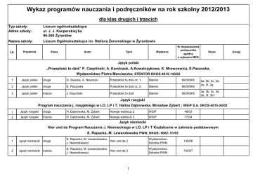 Wykaz programów nauczania i podręczników na rok szkolny 2012/2013 dla klas drugich i trzecich Typ szkoły: Adres szkoły: Liceum ogólnokształcące ul. J. J. Kacperskiej 6a 96-300 Żyrardów Nazwa szkoły: Liceum Ogólnokształcące im. Stefana Żeromskiego w Żyrardowie Lp. Przedmiot Klasa Autor Tytuł Wydawca Nr dopuszczenia podręcznika zgodny z wykazem MEN Klasa Język polski „Przeszłość to dziś” P. Czepliński, A. Karolczuk, A.Kowalczykowa, K. Mrowcewicz, E.Paczoska, Wydawnictwo Piotra Marciszuka; STENTOR DKOS-4015-143/02 1 Język polski druga D. Siwicka, A. Nawrocki Przeszłość to dziś cz. 1, Stentor 69/3/09/S 2 Język polski druga E. Paczoska Przeszłość to dziś cz. 2, Stentor 69/3/09/S 3 Język polski trzecia J. Kopciński Przeszłość to dziś Stentor 69/3/08/S 2a, 2b, 2c, 2d, 2e, 2f, 2g 3a, 3b, 3c, 3d, 3e, 3f, 3b1 Język rosyjski Program nauczania j. rosyjskiego w LO, LP i T. Halina Dąbrowska, Mirosław Zybert ; WSiP S.A. DKOS-4015-24/02 1 Język rosyjski druga H. Dąbrowska, M. Zybert Nowyje wstrieczi 2 WSiP 48/03 2 Język rosyjski trzecia H. Dąbrowska, M. Zybert Nowyje wstrieczi 3 WSiP 77/04 Język niemiecki Hier und da Program Nauczania J. Niemieckiego w LO, LP i T Kształcenie w zakresie podstawowym S. Rapacka, M. Lewandowska PWN; DKOS- 5002- 51/03 1 Język niemiecki druga S. Rapacka, M. Lewandowska, Hier und da 2 J. Nawrotkiewicz Wydawnictwo Szkolne PWN 130/06 2 Język niemiecki trzecia S. Rapacka, M. Lewandowska, Hier und da 3 J. Nawrotkiewicz Wydawnictwo Szkolne PWN 102/07 1 Uwagi Język francuski Interkulturowy i interdyscyplinarny program nauczania języka francuskiego w LO, LP i T. Grażyna Migdalska, Monika Szczucka-Smagowicz Wydawnictwo Szkolne PWN DKOS-4015-79/02 1 Język francuski druga G. Migdalska Deja vu PWN 2 Język francuski trzecia G. Migdalska Deja vu PWN Język angielski Program nauczania języka angielskiego jako pierwszego języka obcego - kurs kontynuacyjny. A. Joanna Sosnowska, Maria Małgorzata Wieruszewska ; OXFORD UNIVERSITY PRESS DKOS-4015-117/02 Język angielski Program nauczania języka angielskiego dla LO, LP, i T wariant A i B, kształcenie w zakresie podstawowym lub rozszerzonym Anna Sikorzyńska, Maria Kłos; Wydawnictwo PEARSON EDUCATION Polska DKOS-4015-152/02 331/2/2011/z1 262/3/2011 262/4/2011 315/2/2011 315/3/2011 315/4/2011 361/2/2011 361/3/2012 1 Język angielski druga, trzecia J. Hughes, B.Polit Matura Explorer Nowa Era 2 Język angielski druga, trzecia L. White, R. Fricker, D. Szmerdt New Matura Success LONGMAN 3 Język angielski druga, trzecia T. Fall, P. Davies New Matura Solutions OXFORD 4 Język angielski trzecia M. Umińska, B. Hasting, D. Chandler Repetytorium maturalne z języka angielskiego, poziom LONGMAN podstawowy i rozszerzony 351/2011 257/2011/z1 5 Język angielski trzecia D. Gryca, J. Sosnowska Oxford Repetytorium z języka angielskiego, poziom OXFORD podstawowy i rozszerzony 265/2011/z1 345/1/2011 345/2/2011 poziom podręczników jest ustalany przez nauczycieli dla poszczególnych grup językowych Matematyka Program nauczania matematyki w liceum ogólnokształcącym. Zakres rozszerzony. Krzysztof Kłaczkow, Marcin Kurczab, Elżbieta Świda; Oficyna Edukacyjna * Krzysztof Pazdro DKOS-4015-12/02 1 druga Matematyka 2 trzecia K. Kłaczkow, M. Kurczab, E. Świda Matematyka podręcznik do liceum i technikum zakres podstawowy i rozszerzony 2 Oficyna Wydawnicza Krzysztof Pazdro 118/03 2a, 2b,2g 411/03 3a, 3b, 3b1 Matematyka Program nauczania matematyki w LO, LP i T. Zakres podstawowy. Marcin Kurczab, Elżbieta Kurczab, Elżbieta Świda; Oficyna Edukacyjna * Krzysztof Pazdro; DKOS-5002-05/08 1 Matematyka druga, 2 Matematyka trzecia K. Kłaczkow, M. Kurczab, E. Świda Matematyka podręcznik do liceum i technikum zakres podstawowy Oficyna Wydawnicza Krzysztof Pazdro 46/09/S 2c, 2d, 2e, 2f 101/10/S 3c, 3d, 3e, 3f Historia Historia. Program nauczania LO, LP i T (w zakresie podstawowym). Bogumiła Burda, Bohdan Halczak, Roman Maciej Józefiak, Małgorzata Szymczak; OPERON DKOS-4015-90/02 Historia Historia. Program nauczania w zakresie rozszerzonym dla liceum ogólnokształcącego. Bogumiła Burda, Bohdan Halczak, Roman Maciej Józefiak; OPERON DKOS-4015-147/02 Historia 2 poziom rozszerzony (czasy nowożytne) Operon; 203/03 B. Burda, B. Halczak, R. M. Jóżefiak, M. Szymczak B. Burda, B. Halczak, R. M. Jóżefiak, M. Szymczak Czasy nowożytne Operon; 111/11/S Historia najnowsza Operon; 427/03 B. Burda, B. Halczak, R. M. Jóżefiak, M. Szymczak Historia najnowsza zakres rozszerzony Operon; 41026 B. Burda, B. Halczak, R. M. Jóżefiak, M. Szymczak 1 Historia druga 2 Historia druga 3 Historia trzecia 4 Historia trzecia 2d, 2f 2a, 2b, 2e, 2c, 2g 3a, 3b, 3c, 3e, 3b1 3d, 3f Wiedza o społeczeństwie WoS. Program nauczania dla LO (w zakresach podst. i roz.), LP i T (w zakresie podstawowym). Janusz Maleska, Zbigniew Smutek; Wydawnictwo Pedagogiczne OPERON DKOS-4015-27/02 Wiedza o społeczeństwie WoS. Program nauczania. Zakres podstawowy i rozszerzony; Tomasz Stryjek; Wydawnictwo Szkolne PWN DKOS-5002-58/07 1 Wiedza o społeczeństwie Z. Smutek, J. Maleska, B. Surmacz druga, trzecia 2 Wiedza o społeczeństwie T. Stryjek Wiedza o społeczeństwie Podręcznik. Szkoły ponadgimnazjalne. Zakres Podstawowy i rozszerzony Wiedza o społeczeństwie Zakres podstawowy i rozszerzony 3 Operon; 99/10/S 2c, 3a, 3e PWN 100/07 2a, 2b, 2d, 3b Fizyka i astronomia Fizyka i astronomia dla szkół ponadgimnazjalnych. Program kształcenia w zakresie podstawowym Maria Fiałkowska, Barbara Sagnowska, Jadwiga Salach; Wydawnictwo ZamKor DKOS-5002-38/07 Fizyka i astronomia Fizyka i astronomia dla szkół ponadgimnazjalnych. Program kształcenia w zakresie podstawowym z elementami kursu rozszerzonego. Maria Fiałkowska, Barbara Sagnowska, Jadwiga Salach; Wydawnictwo ZamKor DKOS-5002-38/04 Fizyka dla szkół Zam Kor ponadgimnazjalnych z elementami rozszerzonymi Fizyka dla szkół Zam Kor ponadgimnazjalnych z elementami rozszerzonymi 1 Fizyka druga 