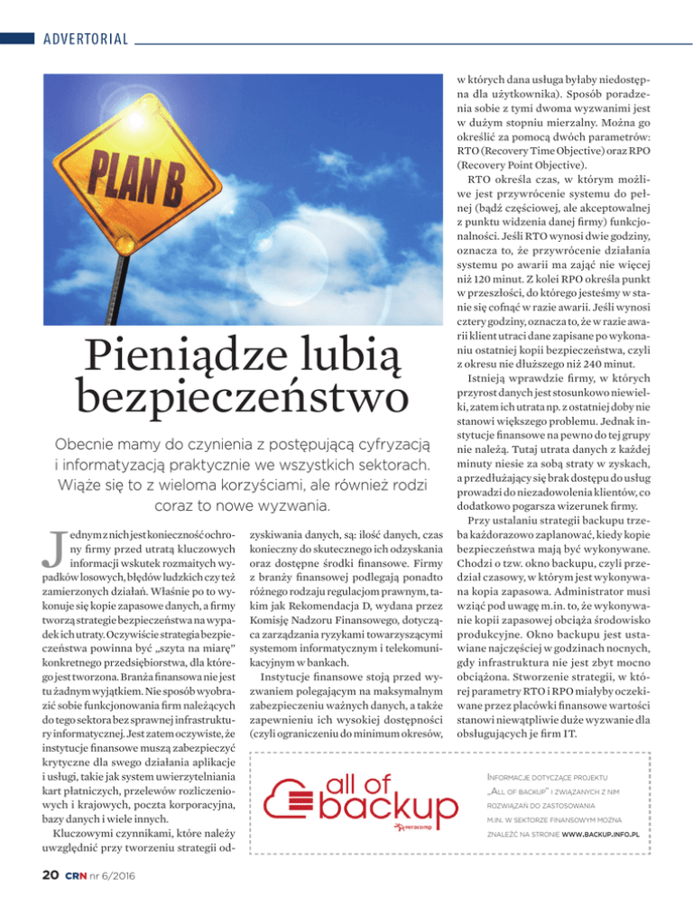 ADVERTORIAL Pieniądze lubią bezpieczeństwo Obecnie mamy do czynienia z postępującą cyfryzacją i informatyzacją praktycznie we wszystkich sektorach. Wiąże się to z wieloma korzyściami, ale również rodzi coraz to nowe wyzwania. J ednym z nich jest konieczność ochrony firmy przed utratą kluczowych informacji wskutek rozmaitych wypadków losowych, błędów ludzkich czy też zamierzonych działań. Właśnie po to wykonuje się kopie zapasowe danych, a firmy tworzą strategie bezpieczeństwa na wypadek ich utraty. Oczywiście strategia bezpieczeństwa powinna być „szyta na miarę” konkretnego przedsiębiorstwa, dla którego jest tworzona. Branża finansowa nie jest tu żadnym wyjątkiem. Nie sposób wyobrazić sobie funkcjonowania firm należących do tego sektora bez sprawnej infrastruktury informatycznej. Jest zatem oczywiste, że instytucje finansowe muszą zabezpieczyć krytyczne dla swego działania aplikacje i usługi, takie jak system uwierzytelniania kart płatniczych, przelewów rozliczeniowych i krajowych, poczta korporacyjna, bazy danych i wiele innych. Kluczowymi czynnikami, które należy uwzględnić przy tworzeniu strategii od- 20 CRN nr 6/2016 zyskiwania danych, są: ilość danych, czas konieczny do skutecznego ich odzyskania oraz dostępne środki finansowe. Firmy z branży finansowej podlegają ponadto różnego rodzaju regulacjom prawnym, takim jak Rekomendacja D, wydana przez Komisję Nadzoru Finansowego, dotycząca zarządzania ryzykami towarzyszącymi systemom informatycznym i telekomunikacyjnym w bankach. Instytucje finansowe stoją przed wyzwaniem polegającym na maksymalnym zabezpieczeniu ważnych danych, a także zapewnieniu ich wysokiej dostępności (czyli ograniczeniu do minimum okresów, w których dana usługa byłaby niedostępna dla użytkownika). Sposób poradzenia sobie z tymi dwoma wyzwanimi jest w dużym stopniu mierzalny. Można go określić za pomocą dwóch parametrów: RTO (Recovery Time Objective) oraz RPO (Recovery Point Objective). RTO określa czas, w którym możliwe jest przywrócenie systemu do pełnej (bądź częściowej, ale akceptowalnej z punktu widzenia danej firmy) funkcjonalności. Jeśli RTO wynosi dwie godziny, oznacza to, że przywrócenie działania systemu po awarii ma zająć nie więcej niż 120 minut. Z kolei RPO określa punkt w przeszłości, do którego jesteśmy w stanie się cofnąć w razie awarii. Jeśli wynosi cztery godziny, oznacza to, że w razie awarii klient utraci dane zapisane po wykonaniu ostatniej kopii bezpieczeństwa, czyli z okresu nie dłuższego niż 240 minut. Istnieją wprawdzie firmy, w których przyrost danych jest stosunkowo niewielki, zatem ich utrata np. z ostatniej doby nie stanowi większego problemu. Jednak instytucje finansowe na pewno do tej grupy nie należą. Tutaj utrata danych z każdej minuty niesie za sobą straty w zyskach, a przedłużający się brak dostępu do usług prowadzi do niezadowolenia klientów, co dodatkowo pogarsza wizerunek firmy. Przy ustalaniu strategii backupu trzeba każdorazowo zaplanować, kiedy kopie bezpieczeństwa mają być wykonywane. Chodzi o tzw. okno backupu, czyli przedział czasowy, w którym jest wykonywana kopia zapasowa. Administrator musi wziąć pod uwagę m.in. to, że wykonywanie kopii zapasowej obciąża środowisko produkcyjne. Okno backupu jest ustawiane najczęściej w godzinach nocnych, gdy infrastruktura nie jest zbyt mocno obciążona. Stworzenie strategii, w której parametry RTO i RPO miałyby oczekiwane przez placówki finansowe wartości stanowi niewątpliwie duże wyzwanie dla obsługujących je firm IT. INFORMACJE DOTYCZĄCE PROJEKTU „ALL OF BACKUP” I ZWIĄZANYCH Z NIM ROZWIĄZAŃ DO ZASTOSOWANIA M.IN. W SEKTORZE FINANSOWYM MOŻNA ZNALEŹĆ NA STRONIE WWW.BACKUP.INFO.PL
