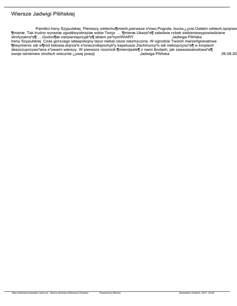 Wiersze Jadwigi Piliñskiej Pamiêci Ireny Szypulskiej Pierwszy oddechu¶miech,pierwsze s³owo.Pogoda, burza,¿ycie.Ostatni oddech,spojrzen ¶mieræ. Tak trudno wyraziæ zgodêwyobraziæ sobie Twoj± ... ¶mieræ.Ukaza³a¶ zaledwie r±bek siebieniewypowiedziane strofyzabra³a¶ ....Godno¶æ cierpieniaprzyjê³a¶ aktem pe³nymWIARY. Jadwiga Piliñska Ireny Szypulskiej Czas gor±cego lataspokojny lazur niebai cisza niezm±cona. W ogrodzie Twoich marzeñgranatowe ¶liwymieni± siê w¶ród listowia,dojrza³e s³onecznikipochyli³y kapelusze Zachmurzy³o siê nieboprzysz³a¶ w kroplach deszczuprzywo³ana s³owami wierszy. W pierwsz± rocznicê ¶miercijeste¶ z nami – jak zawszezakodowa³a¶ swoje istnieniew strofach wiecznie ¿ywej poezji Jadwiga Piliñska 26.08.20 http://walentyna-pawelec.radom.pl - Strona domowa Walentyny Pawelec Powered by Mambo Generated: 6 March, 2017, 23:39