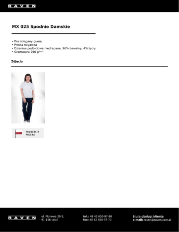 MX 025 Spodnie Damskie • Pas ściągany gumą • Prosta nogawka • Dzianina podbiciowa niedrapana, 96% bawełny, 4% lycry • Gramatura 290 g/m² Zdjęcia ul. Plonowa 20 B, 91-156 Łódź tel.: 48 42 650-97-60 fax: 48 42 650-97-70 Biuro obsługi klienta e-mail: [email protected]