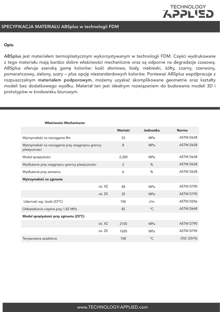 SPECYFIKACJA MATERIAŁU ABSplus w technologii FDM Opis: ABSplus jest materiałem termoplastycznym wykorzystywanym w technologii FDM. Części wydrukowane z tego materiału mają bardzo dobre właściwości mechaniczne oraz są odporne na degradacje czasową. ABSplus oferuje szeroką gamę kolorów: kość słoniowa, biały, niebieski, żółty, czarny, czerwony, pomarańczowy, zielony, szary – plus opcję niestandardowych kolorów. Ponieważ ABSplus współpracuje z rozpuszczalnym materiałem podporowym, możemy uzyskać skomplikowane geometrie oraz kształty modeli bez dodatkowego wysiłku. Materiał ten jest idealnym rozwiązaniem do budowania modeli 3D i prototypów w środowisku biurowym. Właściwości Mechaniczne: Wartość Jednostka Wytrzymałość na rozciąganie Rm 33 MPa ASTM D638 Wytrzymałość na rozciąganie przy osiągnięciu granicy plastyczności 8 MPa ASTM D638 2,200 MPa ASTM D638 Wydłużenie przy osiągnięciu granicy plastyczności 2 % ASTM D638 Wydłużenie przy zerwaniu 6 % ASTM D638 oś. XZ 58 MPa ASTM D790 oś. ZX 35 MPa ASTM D790 106 J/m ASTM D256 82 °C ASTM D648 oś. XZ 2100 MPa ASTM D790 oś. ZX 1650 MPa ASTM D790 108 °C DSC (SSYS) Moduł sprężystości Norma Wytrzymałość na zginanie Udarność wg. Izoda (23°C) Odkształcenie cieplne przy 1,82 MPa Moduł sprężystości przy zginaniu (23°C) Temperatura zeszklenia www.TECHNOLOGY-APPLIED.com