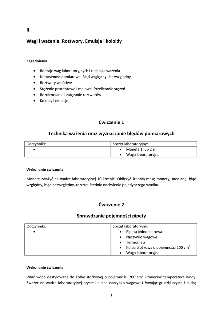 II. Wagi i ważenie. Roztwory. Emulsje i koloidy Ćwiczenie 1