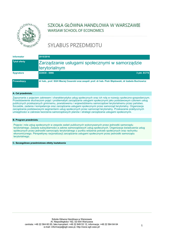Informator 2015/2016 7\WXáRIHUW\ =DU]ąG]DQLHXVáXJDPLVSRáHF]Q\PLZVDPRU]ąG]LH terytorialnym Sygnatura 222630 - 0066 3URZDG]ąF\ GUKDESURI6*+0DFLHM&HVDUVNLRUD]]HVSyáSURIGUKDE3LRWU%áĊGRZVNLGU,]DEHOD%XFKRZLF] 3 pkt. ECTS A. Cel przedmiotu =DSR]QDQLH]SRMĊFLHP]DNUHVHPLFKDUDNWHU\VW\NDXVáXJVSRáHF]Q\FKRUD]LFKUROąZUR]ZRMXVSRáHF]QRJRVSRGDUF]\P 3U]HGVWDZLHQLHVáXFKDF]RPSRMĊüLSUREOHPDW\NL]DU]ąG]DQLDXVáXJDPLVSRáHF]Q\PLMDNRSRGVWDZRZ\PF]áRQHPXVáXJ SXEOLF]Q\FKSU]HND]DQ\FKJPLQQHPXSRZLDWRZHPXLZRMHZyG]NLHPXVDPRU]ąGRZLWHU\WRULDOQHPXSU]H]SDĔVWZR 6]F]HEOH]DGDQLDLNRPSHWHQFMHRUD]]DU]ąG]DQLDXVáXJDPLVSRáHF]Q\PLSU]H]VDPRU]ąGWHU\WRULDOQ\2UJDQL]DFMD ]DU]ąG]DQLDSRGVWDZRZ\PLVHJPHQWDPLXVáXJVSRáHF]Q\FKSU]H]VDPRU]ąGWHU\WRULDOQ\3U]HND]DQLHSUDNW\F]Q\FK XPLHMĊWQRĞFLZ]DNUHVLHWZRU]HQLDVDPRU]ąGRZ\FKSODQyZLVWUDWHJLL]DU]ąG]DQLDXVáXJDPLVSRáHF]Q\PL B. Program przedmiotu 3RMĊFLHLURODXVáXJVSRáHF]Q\FKZ]HVSROH]DGDĔSXEOLF]Q\FKZ\NRQ\ZDQ\FKSU]H]MHGQRVWNLVDPRU]ąGX WHU\WRULDOQHJR=DVDGDVXEV\GLDUQRĞFLD]DNUHVVDPRU]ąGRZ\FKXVáXJVSRáHF]Q\FK2UJDQL]DFMDĞZLDGF]HQLDXVáXJ VSRáHF]Q\FKSU]H]MHGQRVWNLVDPRU]ąGXWHU\WRULDOQHJR]SXQNWXZLG]HQLDSRWU]HEVSRáHF]Q\FKRUD]UDFKXQNX HNRQRPLF]QHJR3HUVSHNW\Z\UDFMRQDOL]DFML]DU]ąG]DQLDXVáXJDPLVSRáHF]Q\PLSU]H]MHGQRVWNLVDPRU]ąGX terytorialnego. &6]F]HJyáRZHSU]HGPLRWRZHHIHNW\NV]WDáFHQLD 6]NRáD*áyZQD+DQGORZDZ:DUV]DZLH $O1LHSRGOHJáRĞFL162, 02-554 Warszawa centrala: +48 22 564 60 00, faks kancelarii: +48 22 849 53 12, informacja: +48 22 564 64 64 e-mail: [email protected], http://www.sgh.waw.pl/ 1 FG=DU]ąG]DQLHXVáXJDPLVSRáHF]Q\PLZVDPRU]ąG]LHWHU\WRULDOQ\P Wiedza .RQZHUVDWRULXP]]DNUHVX]DU]ąG]DQLDXVáXJDPLVSRáHF]Q\PLZVDPRU]ąG]LHWHU\WRULDOQ\P ]D]QDMRPLüSRZLQQRXF]HVWQLNyZ]SRMĊFLDPLRUD]]DVDGDPLLSáDV]F]\]QDPL]LQWHJURZDQHJR ]DU]ąG]DQLDSRGVWDZRZą]SXQNWXZRG]HQLDEH]SRĞUHGQLHJRNV]WDáWRZDQLDZDUXQNyZE\WX OXGQRĞFLF]ĊĞFLą]DU]ąG]DQLDXVáXJDPLSXEOLF]Q\PLZ3ROVFH]SU]\NáDGDPLUR]ZLą]DĔ ]DJUDQLF]Q\FK.RQZHUVDWRULXP]]DNUHVX]DU]ąG]DQLDXVáXJDPLVSRáHF]Q\PLZVDPRU]ąG]LH WHU\WRULDOQ\PPDZSURZDG]DüLLQVSLURZDüGRSRJáĊELRQ\FKSRV]XNLZDĔLGRFLHNDĔZW\P ]DNUHVLH3RJáĊELRQHSRV]XNLZDQLDLGRFLHNDQLDED]RZDüSRZLQQ\QDZLDGRPRĞFLDFKXSU]HGQLR ]GRE\W\FKQDZ\NáDGDFK]SU]HGPLRWyZSRGVWDZRZ\FKSRĞZLĊFRQ\FKWHRULL]DU]ąG]DQLDRUD] GRW\F]ąF\FKQDU]ĊG]L]DU]ąG]DQLDLDQDOL]\SR]ZDODMąF\FKZSá\ZDüQDXVSUDZQLHQLH funkcjonowania organizacji, zasad, procedur i metod podejmowania decyzji. Uczestnik NRQZHUVDWRULXPSRZLQLHQSRVLąĞüZLHG]ĊQDWHPDWV]F]HEOL]DGDĔLNRPSHWHQFML]DU]ąG]DQLD XVáXJDPLVSRáHF]Q\PLZVDPRU]ąG]LHWHU\WRULDOQ\P 8PLHMĊWQRĞFL Kompetencje VSRáHF]QH 3R]QDZV]\RJyOQH]DJDGQLHQLD]]DNUHVX]DU]ąG]DQLHVSRáHF]Q\PLXVáXJDPLZVDPRU]ąG]LH WHU\WRULDOQ\PXF]HVWQLNNRQZHUVDWRULXPSRV]HU]\VZRMHSUDNW\F]QHXPLHMĊWQRĞFLZ]DNUHVLH NRQVWUXNFMLSODQX]DU]ąG]DQLDNRPXQDOQąQLHUXFKRPRĞFLąPLHV]NDQLRZąSODQXG]LDáDQLDJPLQ\ PLHMVNLHMZ]DNUHVLHXVáXJVSRáHF]Q\FKRSHUDF\MQHJRSODQXĞZLDGF]HQLDXVáXJVSRáHF]Q\FK SU]H]JPLQĊPLHMVNą5yZQLHĪZ]DNUHVLHXMPRZDQLHXVáXJVSRáHF]Q\FKZVWUDWHJLLUR]ZRMX JPLQ\SRZLDWRZHMVWUDWHJLLUR]ZLą]\ZDQLDSUREOHPyZVSRáHF]Q\FKRUD]SURJUDPXZVSyáSUDF\ GXĪHJRPLDVWD]RUJDQL]DFMDPLSR]DU]ąGRZ\PL%ĊG]LHSRWUDILáRFHQLDüED]ĊLQIRUPDF\MQąMHM ĨUyGáDGRELHUDüLVWRVRZDüZSUDNW\FHQDU]ĊG]LDGLDJQR]\LDQDOL]\DGHNZDWQHGRV\WXDFMLL PHWRG\SRGHMPRZDQLDGHF\]MLZSRZ\ĪV]\FKDVSHNWDFK8PLDáEĊG]LHZLĊFVWRVRZDüZLHG]Ċ WHRUHW\F]QąGRG]LDáDĔSUDNW\F]Q\FKZ]DNUHVLH]DU]ąG]DQLHVSRáHF]Q\PLXVáXJDPLZ VDPRU]ąG]LHWHU\WRULDOQ\P 8F]HVWQLNNRQZHUVDWRULXP]]DU]ąG]DQLDVSRáHF]Q\PLXVáXJDPLZVDPRU]ąG]LHWHU\WRULDOQ\P zyskuje kompetencje do samodzielnych praktycznych decyzji w tym zakresie w konkretnych sytuacjach organizacyjno-prawnych i instytucjonalnych. 6]NRáD*áyZQD+DQGORZDZ:DUV]DZLH $O1LHSRGOHJáRĞFL162, 02-554 Warszawa centrala: +48 22 564 60 00, faks kancelarii: +48 22 849 53 12, informacja: +48 22 564 64 64 e-mail: [email protected], http://www.sgh.waw.pl/ 2 FG=DU]ąG]DQLHXVáXJDPLVSRáHF]Q\PLZVDPRU]ąG]LHWHU\WRULDOQ\P '6HPHVWUDOQ\SODQ]DMĊü 1 'HILQLFMHLFHFK\VWUXNWXUD]DNUHVLVSRáHF]QRJRVSRGDUF]DURODXVáXJVSRáHF]Q\FK 2 6DPRU]ąGWHU\WRULDOQ\Z3ROVFHL]DU]ąG]DQLHZDGPLQLVWUDFMLSXEOLF]QHM 3 =DU]ąG]DQLHXVáXJDPLVSRáHF]Q\PLZVDPRU]ąG]LHWHU\WRULDOQ\P]DGDQLDLNRPSHWHQFMH 4 ,QIUDVWUXNWXUDMDNRSRGVWDZD]DU]ąG]DQLDXVáXJDPLVSRáHF]Q\PLSU]H]VDPRU]ąGWHU\WRULDOQ\ 5 6SHF\ILNDLRUJDQL]DFMD]DU]ąG]DQLDVDPRU]ąGRZ\P]DVREHPPLHV]NDQLRZ\P 6 6DPRU]ąGRZHSR]LRP\]DU]ąG]DQLDHGXNDFMąNXOWXUąRFKURQą]GURZLDSRPRFąVSRáHF]QąL UHNUHDFMą 7 6WDQGDUG\XUEDQLVW\F]QHORNDOL]DFML]DEXGRZ\Z]DU]ąG]DQLXXVáXJDPLVSRáHF]Q\PL 8 2UJDQL]DFMHSR]DU]ąGRZHLSDUWQHUVWZRZ]DU]ąG]DQLXXVáXJDPLVSRáHF]Q\PL 9 2UJDQL]DFMDVDPRU]ąGRZ\FKXVáXJVSRáHF]Q\PL]DJUDQLFąZ\EUDQHSU]\NáDG\ 10 3ODQ]DU]ąG]DQLDNRPXQDOQąQLHUXFKRPRĞFLąPLHV]NDQLRZą 11 3ODQG]LDáDQLDJPLQ\PLHMVNLHMZ]DNUHVLHXVáXJVSRáHF]Q\FK 12 2SHUDF\MQ\SODQĞZLDGF]HQLDXVáXJVSRáHF]Q\FKSU]H]JPLQĊPLHMVNą 13 8MPRZDQLHXVáXJVSRáHF]Q\FKZVWUDWHJLLUR]ZRMXJPLQ\ 14 3RZLDWRZDVWUDWHJLDUR]ZLą]\ZDQLDSUREOHPyZVSRáHF]Q\FK 15 3URJUDPZVSyáSUDF\PLDVWD]RUJDQL]DFMDPLSR]DU]ąGRZ\PL (/LWHUDWXUDSRGVWDZRZDRERZLą]NRZHSRGUĊF]QLNL (:RMFLHFKRZVNL=DU]ąG]DQLHZVDPRU]ąG]LHWHU\WRULDOQ\P:DUV]DZD'LILQ20030-DQRĞ.UHVáR8VáXJLVSRáHF]QHD ]UyZQRZDĪRQ\UR]ZyMUHJLRQyZ2ILF\QD:\GDZQLF]D6*+:DUV]DZD20081RZH]DU]ąG]DQLHSXEOLF]QHZSROVNLP VDPRU]ąG]LHWHU\WRULDOQ\PUHG$=DOHZVNL2ILF\QD:\GDZQLF]D6*+:DUV]DZD2005; Poradnik mieszkaniowy. =DU]ąG]DQLHNRPXQDOQ\P]DVREHPPLHV]NDQLRZ\P,*3L.6NLJUDI:DUV]DZD2000. )/LWHUDWXUDX]XSHáQLDMąFD =DU]ąG]DQLHZVDPRU]ąG]LHWHU\WRULDOQ\P1DMOHSV]HSUDNW\NLUHG0=DZLFNL60D]XU-%REHU06$3$(.UDNyZ 20043RGVWDZ\]DU]ąG]DQLDQLHUXFKRPRĞFLąUHG0%U\[3ROWH[W:DUV]DZD2000$6REF]DN3ODQ\]DU]ąG]DQLD QLHUXFKRPRĞFLą3ROWH[W:DUV]DZD200253DQILO3RGVWDZ\]DU]ąG]DQLDWXU\VW\NąLUHNUHDFMą3:6=/(6=12/HV]QR 2008; E.Nojszewska, Kierunki rozwoju systemu ochrony zdrowia w Polsce Oficyna Wydawnicza SGH, Warszawa 2009; *3UDZHOVND6NU]\SHN3ROLW\NDNXOWXUDOQDSROVNLFKVDPRU]ąGyZ:\GDZQLFWZR8-.UDNyZ2003; M.Cesarski, Mieszkaniowy sektor publiczny w Polsce - Narodowy S