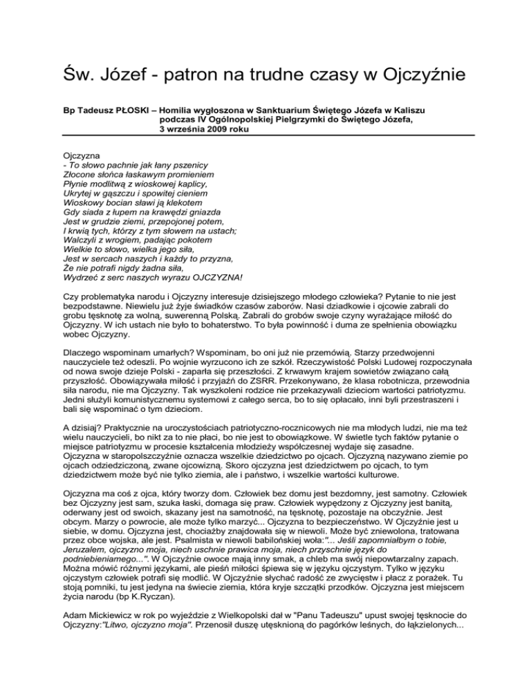 Św. Józef - patron na trudne czasy w Ojczyźnie Bp Tadeusz PŁOSKI – Homilia wygłoszona w Sanktuarium Świętego Józefa w Kaliszu podczas IV Ogólnopolskiej Pielgrzymki do Świętego Józefa, 3 września 2009 roku Ojczyzna - To słowo pachnie jak łany pszenicy Złocone słońca łaskawym promieniem Płynie modlitwą z wioskowej kaplicy, Ukrytej w gąszczu i spowitej cieniem Wioskowy bocian sławi ją klekotem Gdy siada z łupem na krawędzi gniazda Jest w grudzie ziemi, przepojonej potem, I krwią tych, którzy z tym słowem na ustach; Walczyli z wrogiem, padając pokotem Wielkie to słowo, wielka jego siła, Jest w sercach naszych i każdy to przyzna, Że nie potrafi nigdy żadna siła, Wydrzeć z serc naszych wyrazu OJCZYZNA! Czy problematyka narodu i Ojczyzny interesuje dzisiejszego młodego człowieka? Pytanie to nie jest bezpodstawne. Niewielu już żyje świadków czasów zaborów. Nasi dziadkowie i ojcowie zabrali do grobu tęsknotę za wolną, suwerenną Polską. Zabrali do grobów swoje czyny wyrażające miłość do Ojczyzny. W ich ustach nie było to bohaterstwo. To była powinność i duma ze spełnienia obowiązku wobec Ojczyzny. Dlaczego wspominam umarłych? Wspominam, bo oni już nie przemówią. Starzy przedwojenni nauczyciele też odeszli. Po wojnie wyrzucono ich ze szkół. Rzeczywistość Polski Ludowej rozpoczynała od nowa swoje dzieje Polski - zaparła się przeszłości. Z krwawym krajem sowietów związano całą przyszłość. Obowiązywała miłość i przyjaźń do ZSRR. Przekonywano, że klasa robotnicza, przewodnia siła narodu, nie ma Ojczyzny. Tak wyszkoleni rodzice nie przekazywali dzieciom wartości patriotyzmu. Jedni służyli komunistycznemu systemowi z całego serca, bo to się opłacało, inni byli przestraszeni i bali się wspominać o tym dzieciom. A dzisiaj? Praktycznie na uroczystościach patriotyczno-rocznicowych nie ma młodych ludzi, nie ma też wielu nauczycieli, bo nikt za to nie płaci, bo nie jest to obowiązkowe. W świetle tych faktów pytanie o miejsce patriotyzmu w procesie kształcenia młodzieży współczesnej wydaje się zasadne. Ojczyzna w staropolszczyźnie oznacza wszelkie dziedzictwo po ojcach. Ojczyzną nazywano ziemie po ojcach odziedziczoną, zwane ojcowizną. Skoro ojczyzna jest dziedzictwem po ojcach, to tym dziedzictwem może być nie tylko ziemia, ale i państwo, i wszelkie wartości kulturowe. Ojczyzna ma coś z ojca, który tworzy dom. Człowiek bez domu jest bezdomny, jest samotny. Człowiek bez Ojczyzny jest sam, szuka łaski, domaga się praw. Człowiek wypędzony z Ojczyzny jest banitą, oderwany jest od swoich, skazany jest na samotność, na tęsknotę, pozostaje na obczyźnie. Jest obcym. Marzy o powrocie, ale może tylko marzyć... Ojczyzna to bezpieczeństwo. W Ojczyźnie jest u siebie, w domu. Ojczyzna jest, chociażby znajdowała się w niewoli. Może być zniewolona, tratowana przez obce wojska, ale jest. Psalmista w niewoli babilońskiej woła:"... Jeśli zapomniałbym o tobie, Jeruzalem, ojczyzno moja, niech uschnie prawica moja, niech przyschnie język do podniebieniamego...". W Ojczyźnie owoce mają inny smak, a chleb ma swój niepowtarzalny zapach. Można mówić różnymi językami, ale pieśń miłości śpiewa się w języku ojczystym. Tylko w języku ojczystym człowiek potrafi się modlić. W Ojczyźnie słychać radość ze zwycięstw i płacz z porażek. Tu stoją pomniki, tu jest jedyna na świecie ziemia, która kryje szczątki przodków. Ojczyzna jest miejscem życia narodu (bp K.Ryczan). Adam Mickiewicz w rok po wyjeździe z Wielkopolski dał w "Panu Tadeuszu" upust swojej tęsknocie do Ojczyzny:"Litwo, ojczyzno moja". Przenosił duszę utęsknioną do pagórków leśnych, do łąkzielonych... "Ojczyznę kochać trzeba i szanować, nie deptać flagi i nie pluć na godło" - tak podśpiewywała w połowie lat 80. polska zbuntowana młodzież. Od tego czasu, w świadomości nie tylko młodzieży, zaszły spore zmiany. W Polsce przez setki lat określenie"patriota" odbierane było pozytywnie. W obronie Ojczyzny swoje życie poświęcały tysiące naszych rodaków. Współczesny młody człowiek, urodzony po przełomie roku "89, zna wojnę jedynie z relacji telewizyjnych bądź z literatury. Na szczęście, nie musiał doświadczyć jej okrucieństwa. W inny sposób też interpretuje pojęcia takie jak patriotyzm czy honor. Często mówi się, że młodym ludziom zwyczajnie nie zależy na tym, co dzieje się w kraju, że nie stać ich na żadne poświęcenie w imię Ojczyzny. Nie ulega wątpliwości, iż pokolenia starsze, zwłaszcza wojenne, musiały zmierzyć się z zupełnie nieznanym dla nas, młodych, doświadczeniem wojny. Ich młodość przypadła na czasy wielkiego niepokoju o losy swoje i całego kraju. Przedstawiciele tzw. pokolenia straconego zostali zmuszeni do porzucenia swoich ambicji, realizacji życiowych zamierzeń, czy po prostu cieszenia się tym wszystkim, co niesie ze sobą wiek młodzieńczy:"Nas nauczono: nie ma miłości... nie ma sumienia... trzeba zapomnieć..." - jak pisał najsłynniejszy poeta z pokolenia Kolumbów, Krzysztof Kamil Baczyński. Zastanawiające jest, iż w tak młodym wieku tak liczni dobrowolnie potrafili podjąć jakże trudną decyzję o walce w obronie własnego kraju. Z pewnością można powiedzieć, iż tamto pokolenie było wychowywane w inny sposób. Częściej i w domu, i w szkole młodzi słyszeli o wartości, jaką jest Ojczyzna. Jakie zatem dziś młodzi obierają stanowisko wobec swojego kraju, gdy nie trzeba nam demonstrować naszego patriotyzmu na polu walki? Patriotyzm to według definicji słownikowej, postawa oparta na miłości i przywiązaniu do Ojczyzny, jedności i solidarności z własnym narodem, jego historią i tradycją. Patriota to człowiek kochający swoją Ojczyznę i naród, gotów do poświęceń dla ich dobra. Patriotyzm to postawa społeczno-polityczna i forma ideologii, łącząca przywiązanie do własnej O