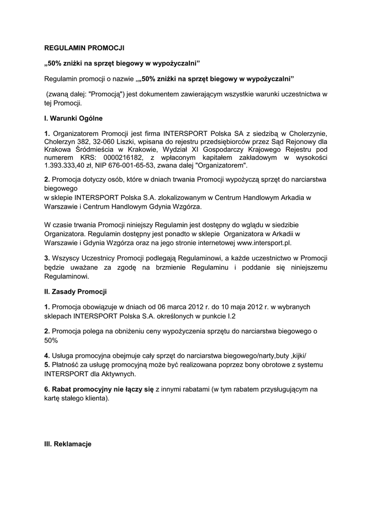 REGULAMIN PROMOCJI „50% zniżki na sprzęt biegowy w wypożyczalni” Regulamin promocji o nazwie „„50% zniżki na sprzęt biegowy w wypożyczalni” (zwaną dalej: "Promocją") jest dokumentem zawierającym wszystkie warunki uczestnictwa w tej Promocji. I. Warunki Ogólne 1. Organizatorem Promocji jest firma INTERSPORT Polska SA z siedzibą w Cholerzynie, Cholerzyn 382, 32-060 Liszki, wpisana do rejestru przedsiębiorców przez Sąd Rejonowy dla Krakowa Śródmieścia w Krakowie, Wydział XI Gospodarczy Krajowego Rejestru pod numerem KRS: 0000216182, z wpłaconym kapitałem zakładowym w wysokości 1.393.333,40 zł, NIP 676-001-65-53, zwana dalej "Organizatorem". 2. Promocja dotyczy osób, które w dniach trwania Promocji wypożyczą sprzęt do narciarstwa biegowego w sklepie INTERSPORT Polska S.A. zlokalizowanym w Centrum Handlowym Arkadia w Warszawie i Centrum Handlowym Gdynia Wzgórza. W czasie trwania Promocji niniejszy Regulamin jest dostępny do wglądu w siedzibie Organizatora. Regulamin dostępny jest ponadto w sklepie Organizatora w Arkadii w Warszawie i Gdynia Wzgórza oraz na jego stronie internetowej www.intersport.pl. 3. Wszyscy Uczestnicy Promocji podlegają Regulaminowi, a każde uczestnictwo w Promocji będzie uważane za zgodę na brzmienie Regulaminu i poddanie się niniejszemu Regulaminowi. II. Zasady Promocji 1. Promocja obowiązuje w dniach od 06 marca 2012 r. do 10 maja 2012 r. w wybranych sklepach INTERSPORT Polska S.A. określonych w punkcie I.2 2. Promocja polega na obniżeniu ceny wypożyczenia sprzętu do narciarstwa biegowego o 50% 4. Usługa promocyjna obejmuje cały sprzęt do narciarstwa biegowego/narty,buty ,kijki/ 5. Płatność za usługę promocyjną może być realizowana poprzez bony obrotowe z systemu INTERSPORT dla Aktywnych. 6. Rabat promocyjny nie łączy się z innymi rabatami (w tym rabatem przysługującym na kartę stałego klienta). III. Reklamacje Wszelkie reklamacje dotyczące Promocji będą rozpatrywane zgodnie z przepisami ustawy o szczególnych warunkach sprzedaży konsumenckiej oraz o zmianie Kodeksu cywilnego z dnia 27 lipca 2002 r. (Dz. U. 2002 Nr 141, poz. 1176). IV. Postanowienia Końcowe Organizator zastrzega sobie prawo dokonywania zmian w niniejszym Regulaminie. Zmiany w regulaminie będą publikowane na stronie internetowej Organizatora