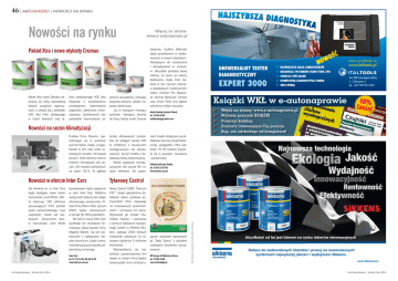 46 | AKTUALNOŚCI | NOWOŚCI NA RYNKU Nowości na rynku Pakiet Xtra i nowe etykiety Cromax Pakiet Xtra marki Standox od znacza się niską zawartością lotnych związków organicz nych, a składa się z podkładu VOC Xtra Filler (dostępnego w trzech kolorach) oraz la kieru bezbarwnego VOC Xtra Clearcoat o przeznaczeniu uniwersalnym (lakierowanie częściowe, całościowe, mikro naprawy). Zastosowanie obu produktów równocześnie za pewnia zauważalną, znaczącą poprawę poziomu jakości na prawy lakierniczej. Już w bieżącym miesiącu produkty należącej również do firmy Axalta marki Cromax Więcej na stronie: www.e-autonaprawa.pl (dawniej: DuPont Refinish) będą sprzedawane w opako waniach z nowymi etykietami, łatwiejszymi do rozróżniania i odnajdywania w mieszal ni. Wszystkie produkty danej rodziny, od żywic po lakiery bezbarwne, będą mieć ety kiety w tym samym kolorze, a dodatkowym rozróżnieniem rodzin Cromax Pro Baseco at, Cromax Basecoat, Centari oraz Imron Fleet Line będzie odmienny motyw wizualny. Książki WKŁ w e-autonaprawie ✔ ✔ ✔ ✔ ✔ Axalta Coating Systems Poland tel. 22 454 64 09 axaltacoatingsystems.com Nowości na sezon klimatyzacji liczbie oferowanych produk tów tej kategorii ponad 400 to chłodnice z osuszaczem (zintegrowanym lub wbudo wanym). Są też modele z do datkową farbą antykorozyjną. Wśród sprężarek klimaty zacyjnych jest ponad 90 nowych referencji. Do wybra Nowości w ofercie Inter Cars Tytanowy Castrol Od kwietnia br. w Inter Cars będą dostępne nowe klocki hamulcowe Jurid White. Ofer ta obejmuje 190 referencji pokrywających 44% potrzeb parku samochodowego, czyli większości marek aut oso bowych. Ceramiczne kloc ki hamulcowe Jurid White Nowy Castrol EDGE Titanium FST™ dzięki specjalnemu do datkowi tytanu podwaja wy trzymałość filmu olejowego na smarowanych powierzch niach i zmniejsza ich tarcie. Opracował go zespół che mików, fizyków i inżynierów z centrum badawczo-rozwojo wego Castrol w Wielkiej Bry tanii, badając 2400 różnych mieszanek olejowych na te stowym dystansie 3 milionów kilometrów. Wprowadzeniu tej naj bardziej zaawansowanej linii olejów w historii firmy będzie towarzyszyła seria emocjonu sprzedawane będą wyłącznie w sieci Inter Cars. Podobna wyłączność dotyczy też całego oferowanego asortymentu fil trów firmy Mann-Filter (ponad 6500 typów stosowanych w ponad 36 500 pojazdach). Od końca marca Inter Cars sprzedaje też skraplacze kli matyzacji eQual Quality firmy Magneti Marelli. Są one wy twarzane z najlepszych sto pów aluminium, dzięki czemu charakteryzują się wysoką od pornością na korozję. Inter Cars tel. 22 714 10 00, 801 80 20 20 www.intercars.com.pl Autonaprawa | Kwiecień 2014 nych modeli dołączane są do datkowe wtyczki-przejściówki, oringi, sprzęgiełka i filtry siat kowe. Po 20 nowości pojawi ło się w grupach: osuszaczy i parowników Chłodnice Nissens Polska tel. 61 653 52 07/08 www.nissens.com.pl jących wydarzeń sportowych pt. „Testy Tytanu” z udziałem czołowych kierowców wyczy nowych. BP Europa SE Oddział w Polsce tel. 22 582 65 00 www.castroledge.pl Fot. Axalta, Castrol, Inter Cars, Nissens Duńska firma Nissens, spe cjalizująca się w produkcji wymienników ciepła, przygo towała w tym roku wiele se zonowych nowości. W liczącej ponad 1 000 referencji ofercie chłodnic klimatyzacji jest po nad 100 nowości wdrożonych na sezon 2014. W ogólnej Wejdź na stronę: www.e-autonaprawa.pl Wybierz przycisk KSIĄŻKI Przejrzyj katalog Zaznacz interesujące Cię pozycje Kup, nie odchodząc od komputera! 10% taniej Autonaprawa | Kwiecień 2014