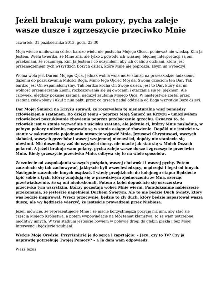 Jeżeli brakuje wam pokory, pycha zaleje wasze dusze i zgrzeszycie przeciwko Mnie czwartek, 31 października 2013, godz. 23.30 Moja wielce umiłowana córko, bardzo wielu nie posłucha Mojego Głosu, ponieważ nie wiedzą, Kim Ja Jestem. Wielu twierdzi, że Mnie zna, ale tylko z powodu ich własnej, błędnej interpretacji są oni przekonani, że rozumieją, Kim Ja Jestem i co uczyniłem, aby ich ocalić z otchłani, która jest przeznaczeniem tych wszystkich Bożych dzieci, które Mnie nie poproszą, abym im wybaczył. Wolna wola jest Darem Mojego Ojca. Jednak wolna wola może stanąć na przeszkodzie ludzkiemu dążeniu do poszukiwania Miłości Boga. Mimo tego Ojciec Mój dał Swoim dzieciom ten Dar. Tak bardzo jest On wspaniałomyślny. Tak bardzo kocha On Swoje dzieci. Jest to Dar, który dał im wolność przemierzania Ziemi, rozkoszowania się jej owocami i otaczania się jej pięknem. Ale człowiek, uległszy pokusie szatana, nadużył zaufania Mojego Ojca. W następstwie został przez szatana zniewolony i ukuł z nim pakt, przez co grzech nadal oddziela od Boga wszystkie Boże dzieci. Dar Mojej Śmierci na Krzyżu sprawił, że rozerwałem tę nienaturalną więź pomiędzy człowiekiem a szatanem. Bo dzięki temu – poprzez Moją Śmierć na Krzyżu – umożliwiłem człowiekowi poszukiwanie zbawienia poprzez przebaczenie grzechu. Oznacza to, że człowiek jest w stanie wyrwać się z uścisku szatana, ale jedynie ci, którzy Mnie naśladują, w pełnym pokory uniżeniu, naprawdę są w stanie osiągnąć zbawienie. Dopóki nie jesteście w stanie w sakramencie pojednania otwarcie wyjawić Mnie, Jezusowi Chrystusowi, waszych słabości, waszych grzechów i waszej wzajemnej nienawiści, dopóty nie staniecie się niewinni. Nie doszedłszy zaś do czystości duszy, nie macie jak stać się w Moich Oczach pokorni. A jeżeli brakuje wam pokory, pycha zaleje wasze dusze i zgrzeszycie przeciwko Mnie. Kiedy grzeszycie przeciwko Mnie, odbywa się to na wiele sposobów. Zaczniecie od zaspokajania waszych pożądań, waszej chciwości i waszej pychy. Potem zaczniecie się tak zachowywać, jakbyście byli wszechwiedzący, mądrzejsi i lepsi od innych. Następnie zaczniecie innych osądzać. I wtedy przejdziecie do kolejnego etapu: Będziecie kpić sobie z tych, którzy znajdują się w prawdziwym zjednoczeniu ze Mną, szerząc przeświadczenie, że są oni niedoskonali. Potem z kolei dopuścicie się oszczerstwa przeciwko tym wszystkim, którzy pozostają wobec Mnie wierni. Paradoksalnie nabierzecie przekonania, że jesteście napełnieni Duchem Świętym. Ale to nie będzie Duch Święty, który was będzie inspirował. Wręcz przeciwnie, będzie to zły duch, który będzie napastował waszą duszę; ale wy będziecie wierzyć, że jesteście prowadzeni przez Niebiosa. Jeżeli mówicie, że reprezentujecie Mnie i że macie korzystniejszą pozycję niż inni, aby stać się częścią Mojego Królestwa, a potem wypowiadacie na Mój temat kłamstwa, to są wam potrzebne modlitwy innych. W tym stadium jesteście bowiem w połowie drogi do głębin piekła i bez Mojej Interwencji będziecie zgubieni. Weźcie Moje Orędzie. Przyciśnijcie je do serca i zapytajcie: – Jezu, czy to Ty? Czy ja naprawdę potrzebuję Twojej Pomocy? – a Ja dam wam odpowiedź. Wasz Jezus